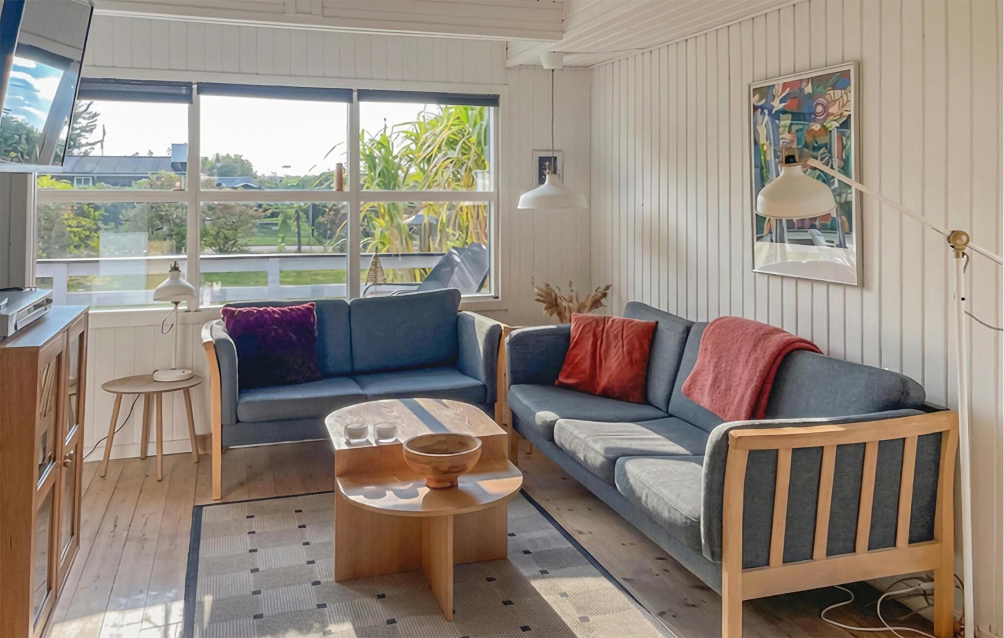 Betreten Sie den hellen Wohnbereich Ihres Ferienhauses und genießen Sie die freundliche Atmosphäre. Die großen Fenster lassen viel Licht herein und geben den Blick auf den Garten frei. Machen Sie es sich auf den bequemen Sofas gemütlich, während der Kaminofen an kühleren Tagen eine wohlige Wärme verbreitet. Die Einrichtung kombiniert klassische Holzelemente mit hellen Farben und schafft so eine angenehme, wohnliche Stimmung. Im angrenzenden Essbereich finden Sie Platz für gemeinsame Mahlzeiten, Spiele oder gemütliche Abende. Die gut ausgestattete Küche mit praktischen Arbeitsflächen und direktem Zugang zur Terrasse macht das Kochen leicht und gesellig.