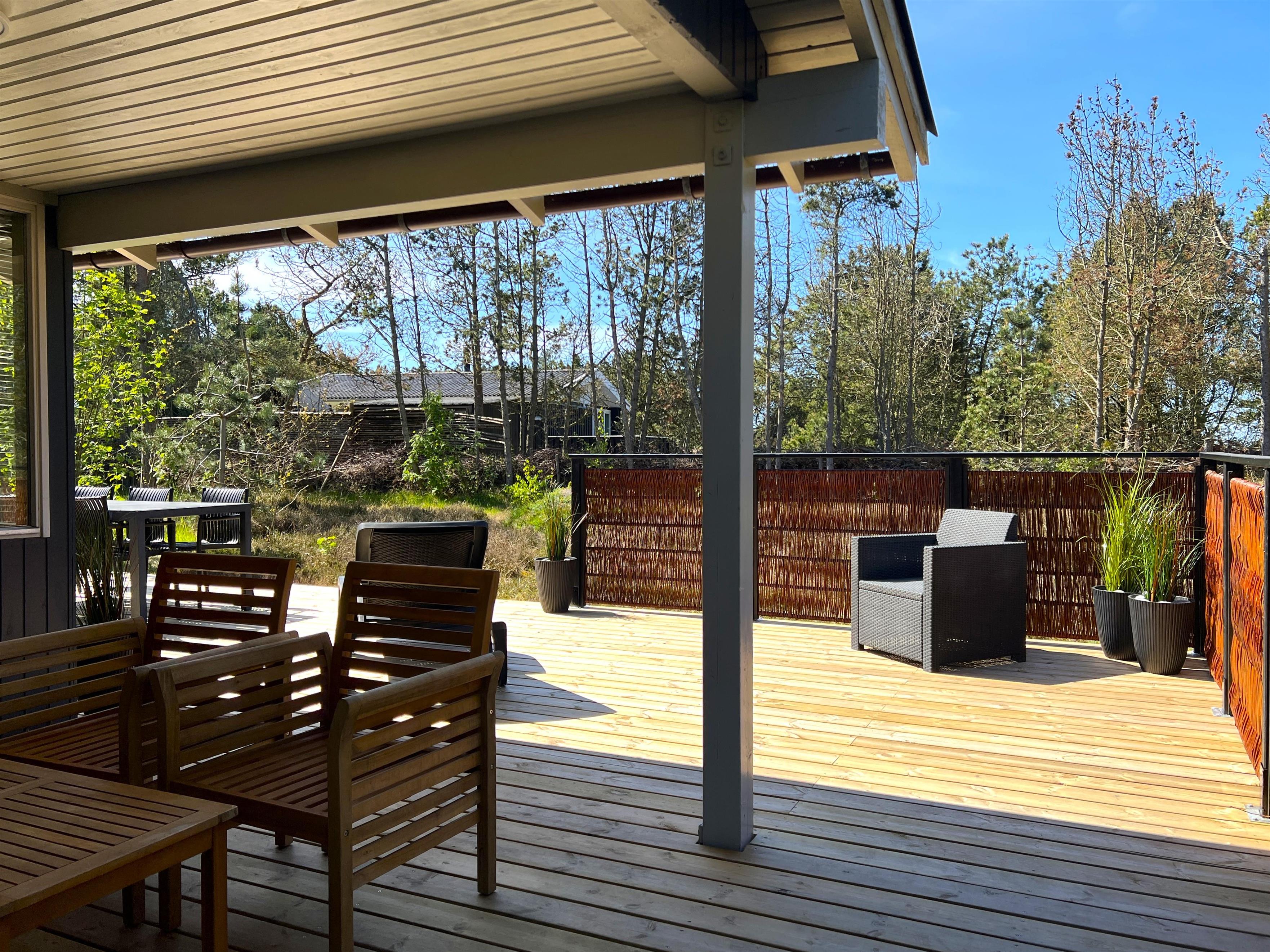 Es gibt eine Terrasse rund ums Haus, mit vielen Möglichkeiten um gemütliche Ecken in der Sonne zu finden. Darüber hinaus gibt es noch eine überdeckte Terrasse.