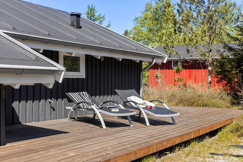 Die große Holzterrasse, die sich rund ums Haus zieht, ist ein echtes Highlight. Mehrere windgeschützte Ecken und sonnige Plätze bieten die perfekte Kulisse für entspannte Ferientage – sei es beim Morgenkaffee, einem Mittagsschläfchen in der Hängematte oder beim Grillabend unter dem nordjütländischen Sternenhimmel. Die grüne Bepflanzung sorgt für Privatsphäre und eine friedliche Atmosphäre, während der großzügige Außenbereich sowohl Rückzug als auch Geselligkeit ermöglicht. Hier können Sie das Leben unter freiem Himmel in vollen Zügen genießen.