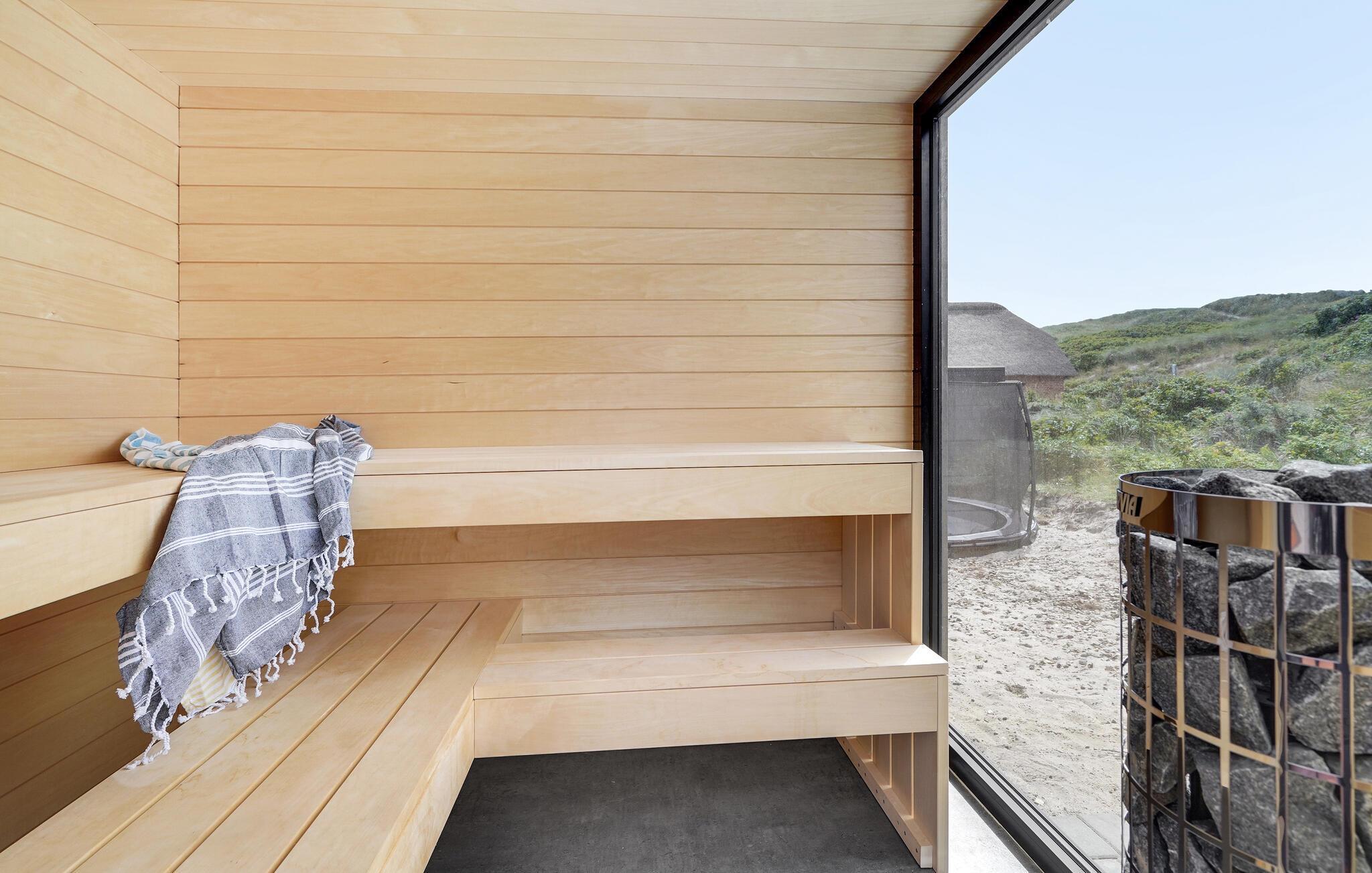 Komfortables Ferienhaus mit Innenpool, Sauna und Dünenblick in Årgab, ideal für Familien und Gruppen.