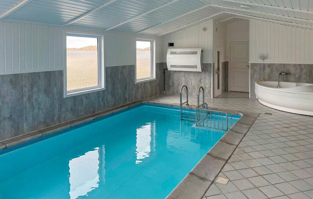 Eines der beliebtesten Gebiete auf Holmsland Klit ist Årgab, wo die Entfernung zwischen Meer und Fjord am geringsten ist. Genau hier liegt dieses gepflegte und gut ausgestattete Ferienhaus. Das Blockhaus hat in der Wohnküche einen schönen Holzböden, der ganz schnell zum natürlichen Treffpunkt des Hauses wird. Von hier aus haben Sie einen Blick auf das Schwimmbad, das mit einer umweltfreundlichen und energiesparenden Wärmepumpe beheizt wird. Neben dem Swimmingpool, in dem sich auch ein schönes kleines Kinderbecken befindet, können Sie im Whirlpool entspannen oder die Sauna genießen.