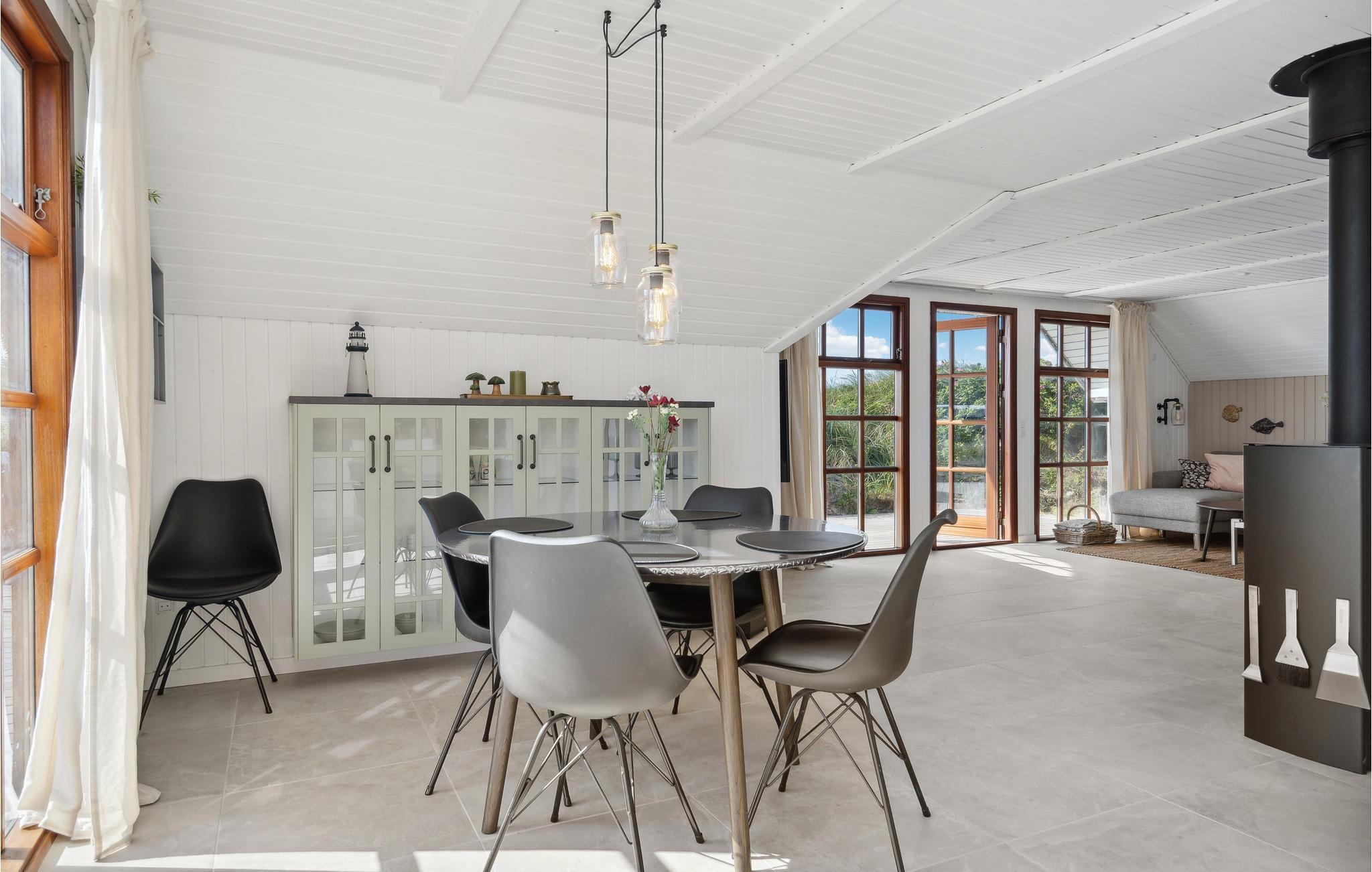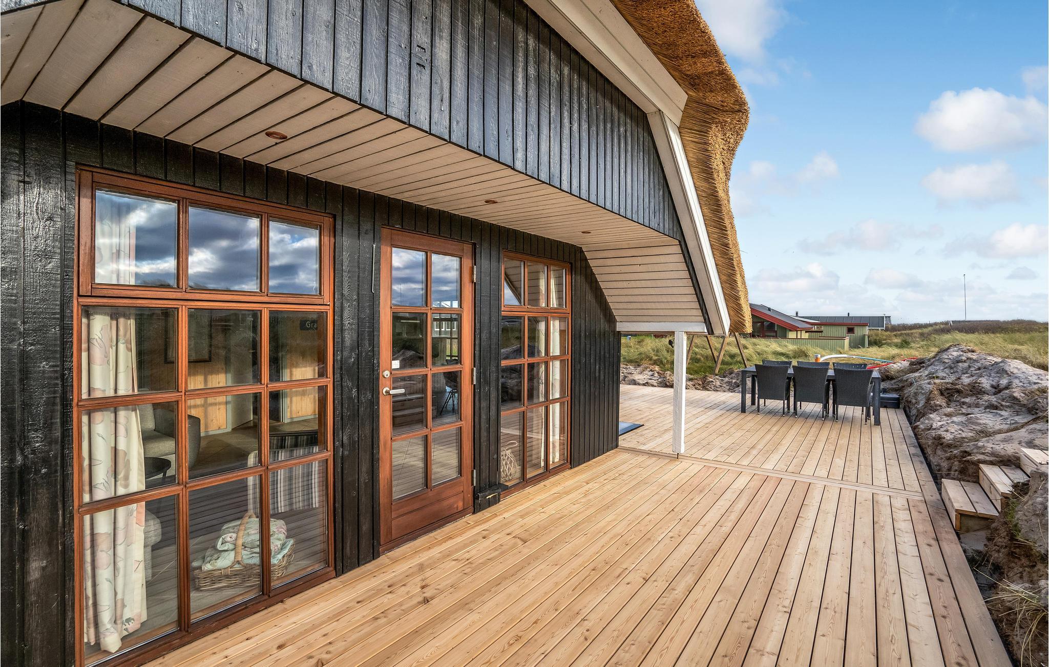 Dieses Ferienhaus liegt auf einem herrlichen Naturgrundstück an der Nordsee. In gutem Stand und mit einer modernen Einrichtung präsentiert sich das Haus seinen Gästen. Küche, Esszimmer und Wohnraum liegen in offener Verbindung miteinander und eine große Fensterpartie sorgen für viel Licht in den Wohnräumen. Ein Kaminofen sorgt für heimelige Athmosphäre in den Abendstunden. Sowohl von der Küche als auch vom Wohnzimmer führen Türen auf die möblierten Terrassen, die eine wendet gen Osten, die andere gen Süd/Südwest und Blick auf die Dünen.