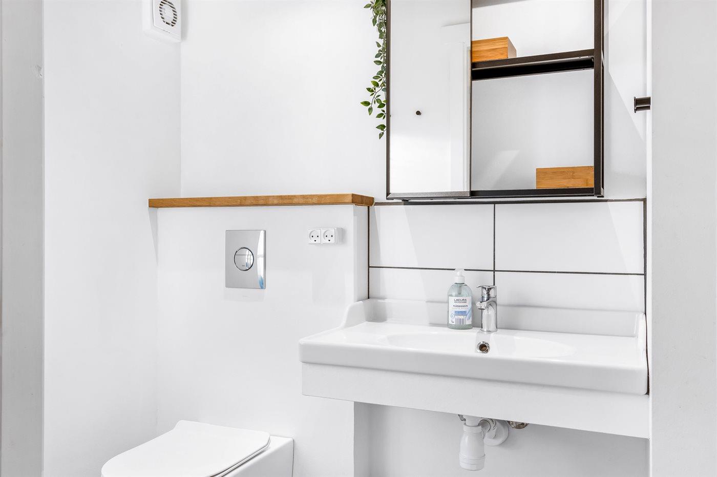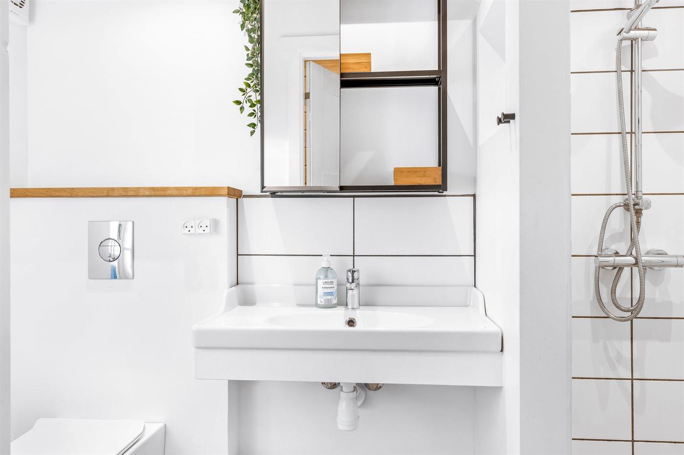 Es gibt ein neu renoviertes Badezimmer mit Duschnische und Toilette.