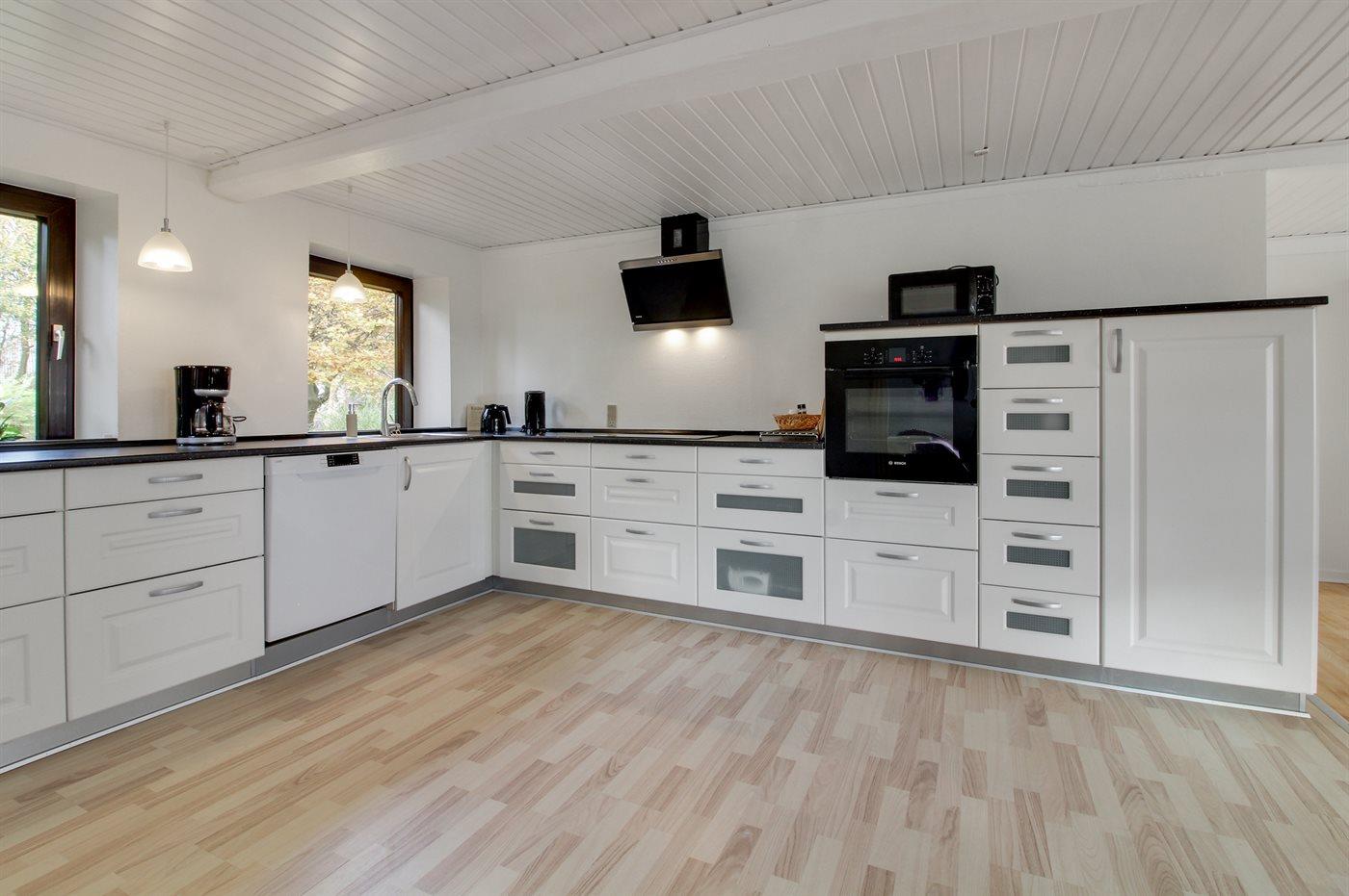 Die Küche ist mit Kühlschrank ausgestattet. Außerdem gibt es 4 Induktions-Kochzonen, Umluftofen, Mikrowelle sowie Geschirrspüler.