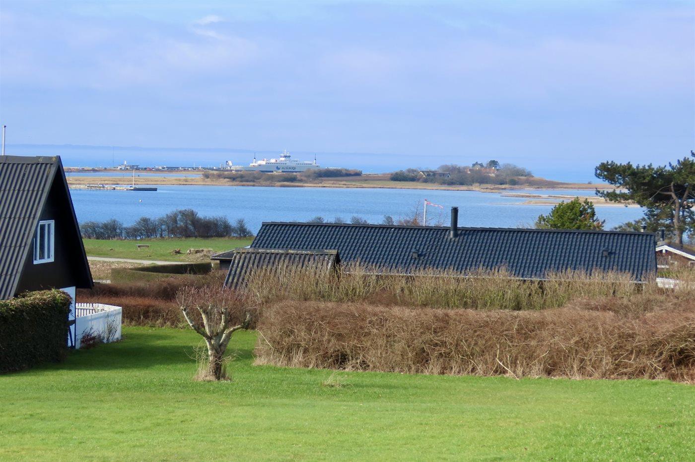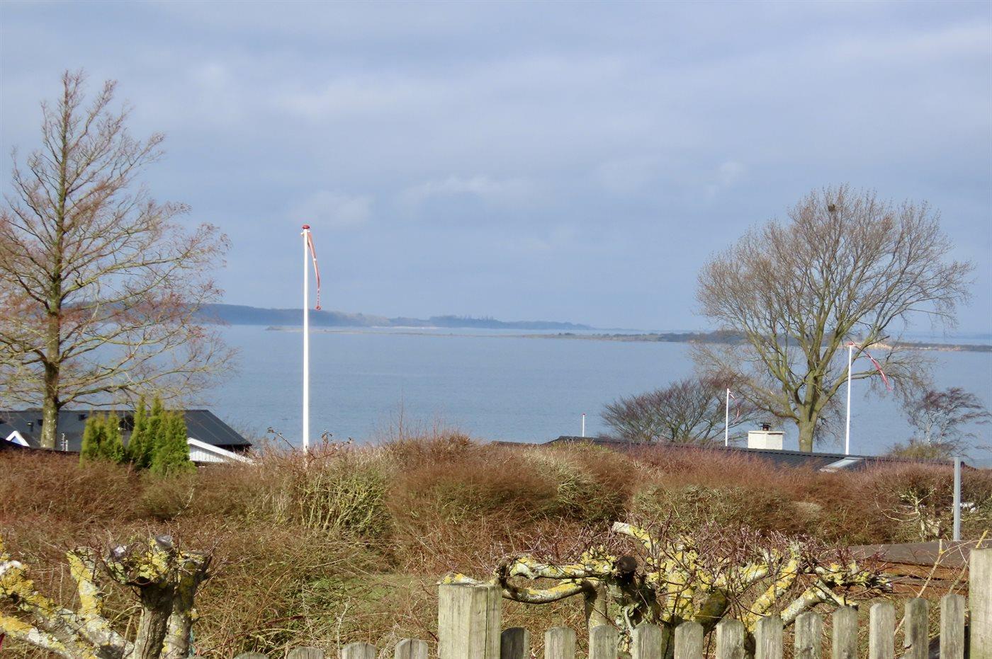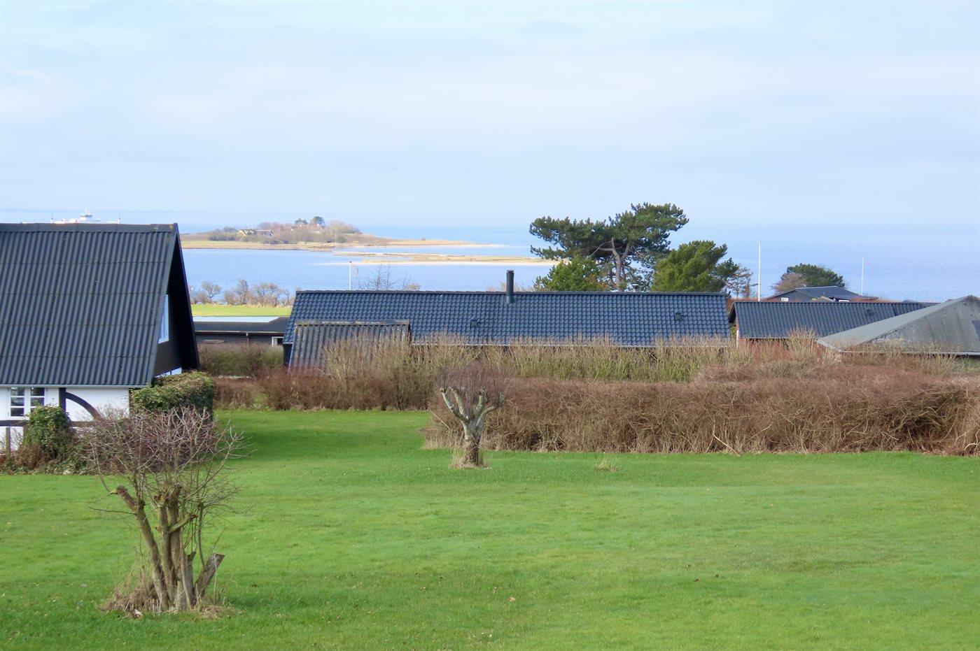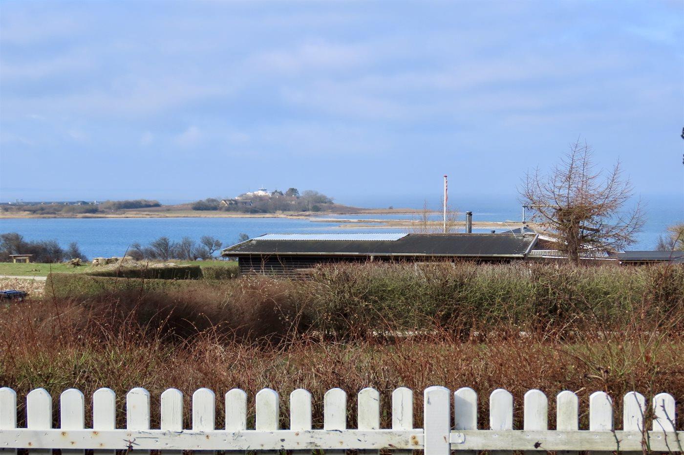 Am Ende des großen Grundstücks ist ein kleines Gästehaus errichtet, das über eine sich in erhöhter Lage befindenen Holzterrasse verfügt - von wo aus man Ausblick über die Bucht von Helnæs hat.