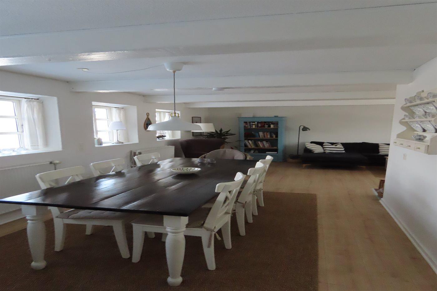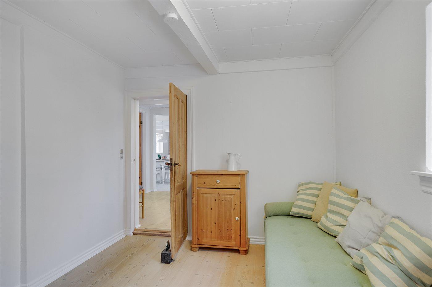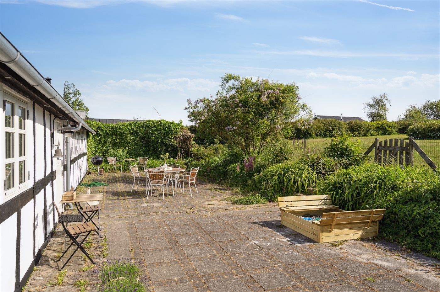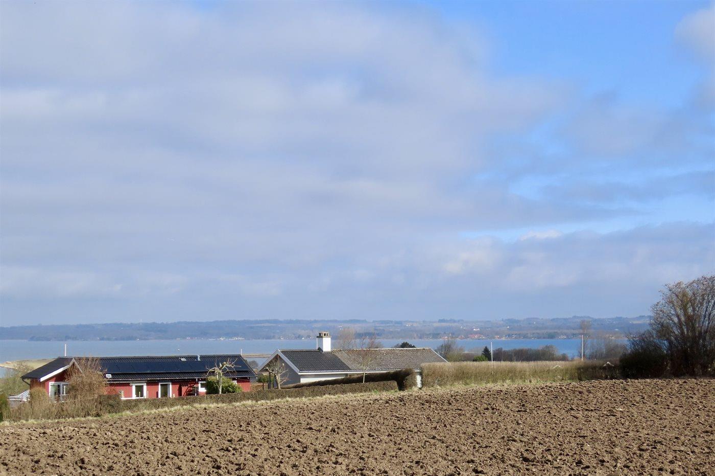 Am Ende des großen Grundstücks ist ein kleines Gästehaus errichtet, das über eine sich in erhöhter Lage befindenen Holzterrasse verfügt - von wo aus man Ausblick über die Bucht von Helnæs hat.