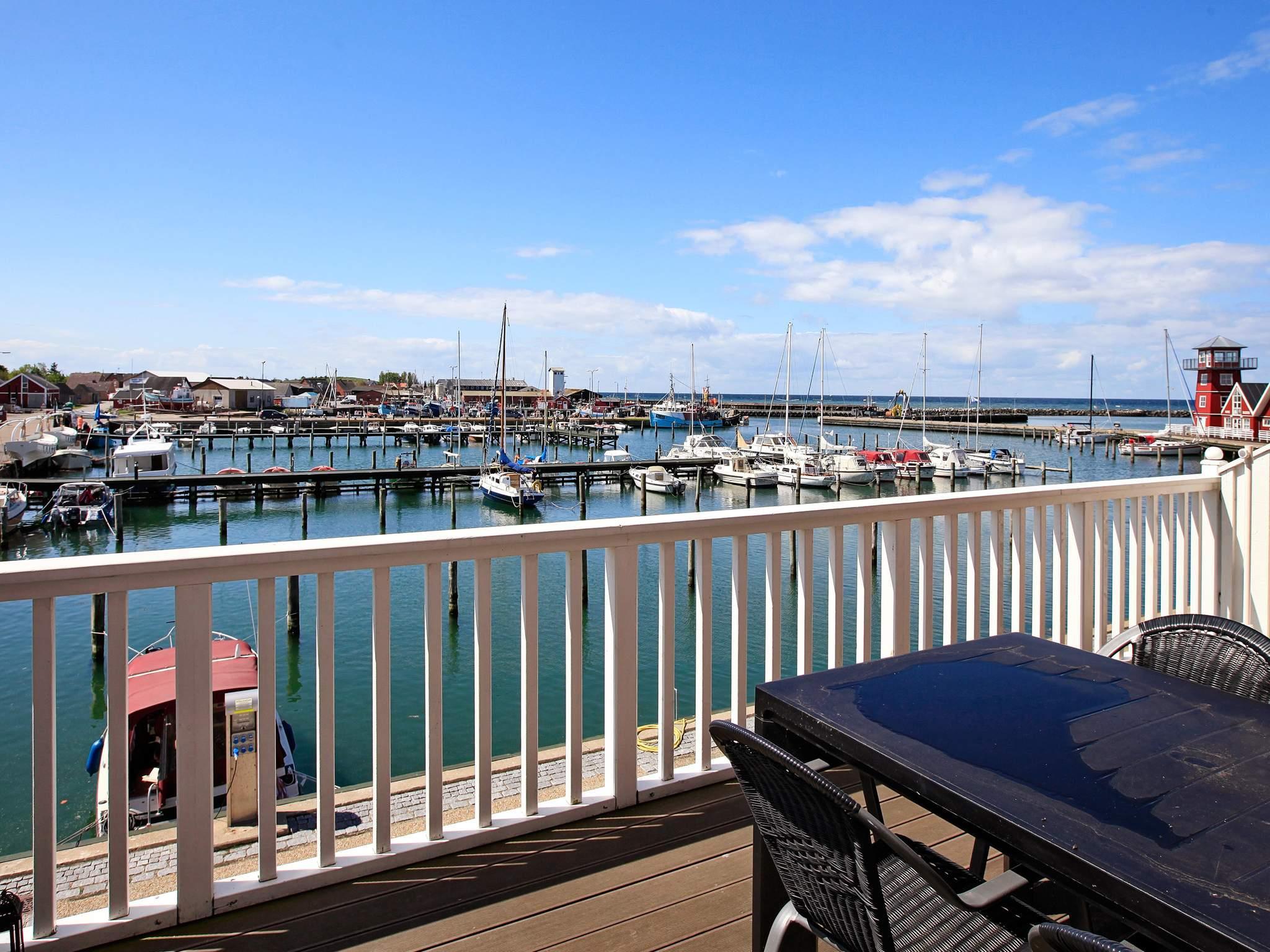 Auf der Terrasse mit Blick zum Hafen stehen Gartenmöbel und Grill für sonnige Tage und Sommerabende bereit. Auf der anderen Terrasse mit Blick zum Strand ebenfalls Gartenmöbel.