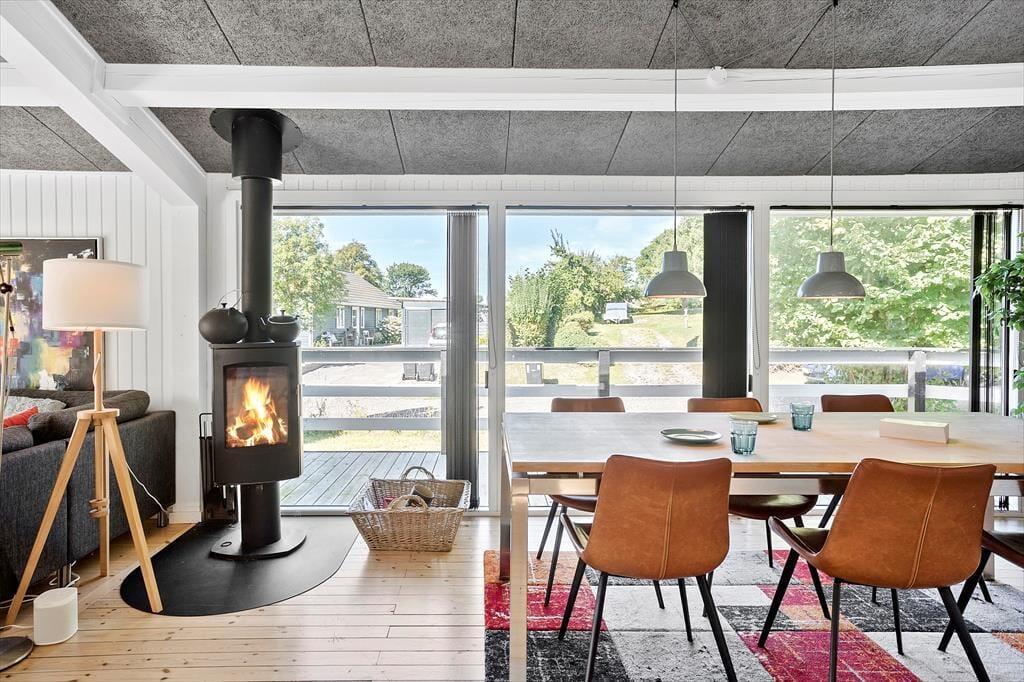 An die Küche schließt der Essbereich an. Etwa in der Mitte des Wohnraums steht ein neuer Kaminofen. Der Wohnraum umfasst zudem ein Ecksofa und einen Ausgang auf die Terrasse.