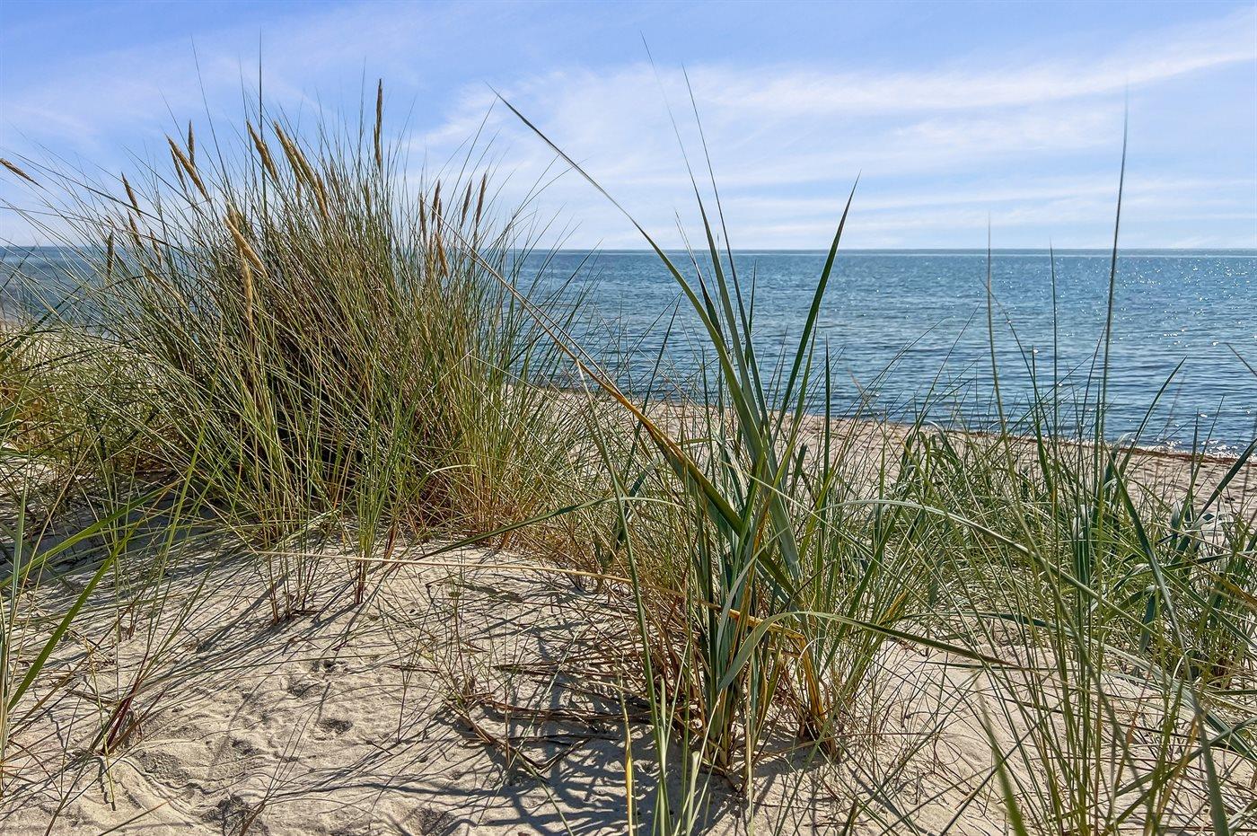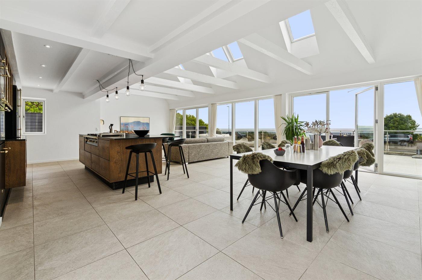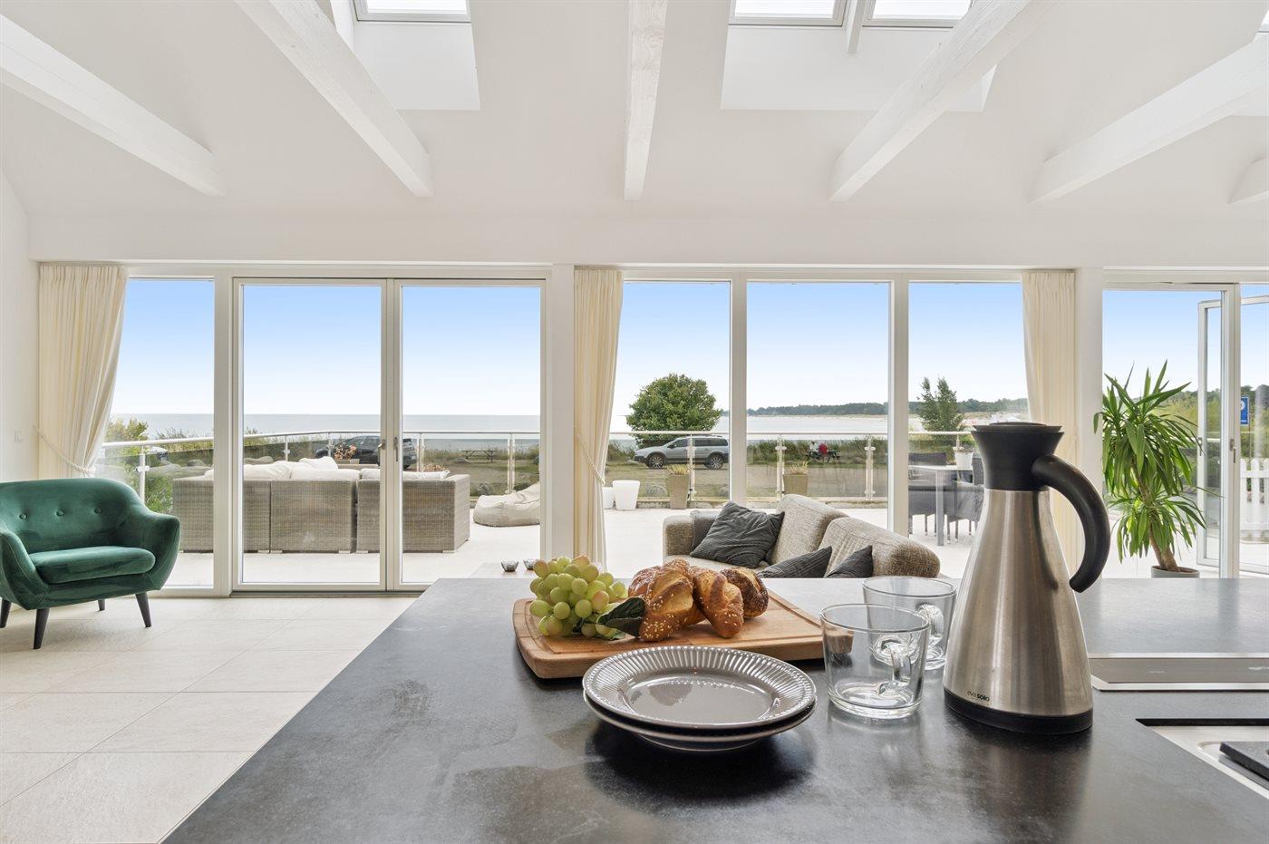Mit herrlichem Ausblick über den Strand von Balka auf der einen Seite und den kleinen idyllischen Yachthafen auf der anderen Seite liegt dieses feine Ferienhaus wirklich einzigartig – mit einer großen offenen, erhöhten Terrasse und beeindruckenden Fensterpartien zum Meer hin.