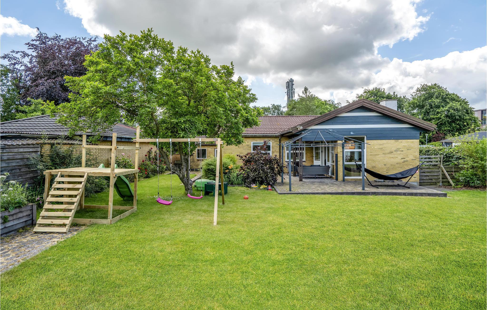 Modernes Ferienhaus mit großem Garten, Spielturm und Nähe zu Legoland in Billund, ideal für Familien.