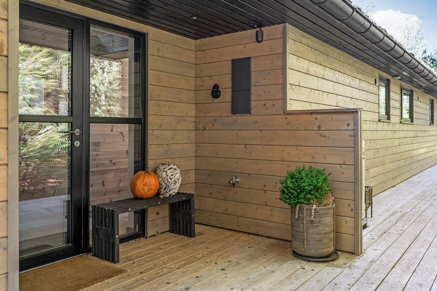 Die Ferienunterkunft liegt auf einem 1250 m² großen Naturgrundstück. Die Entfernung zum Meer beträgt 380 m. Die Entfernung zum Fjord beträgt 2050 m. Die nächste Einkaufsmöglichkeit liegt 2170 m entfernt. In einem Abstand von 1300 m gibt es einen Golfplatz. Es steht ein offenes Terrassenareal zur Verfügung. Außerdem gibt es überdachte Terrasse. Außendusche. Es beteht die Möglichkeit das Essen in der Außenküche zuzubereiten. Es steht ein Grill zur Verfügung. Es ist ein Ladestecker für Elektroautos installiert. Ladestecker Typ 2. Mit einer Ladeleistung von 11 kW. Parkplatz auf dem Grundstück.