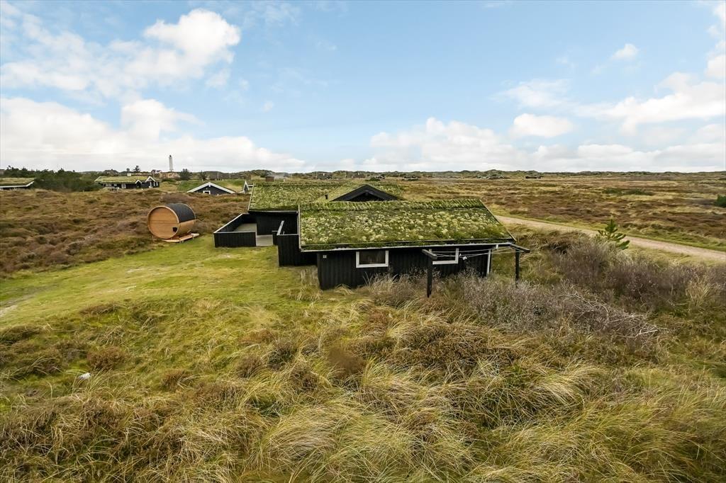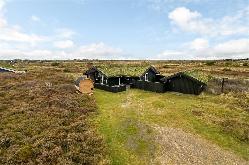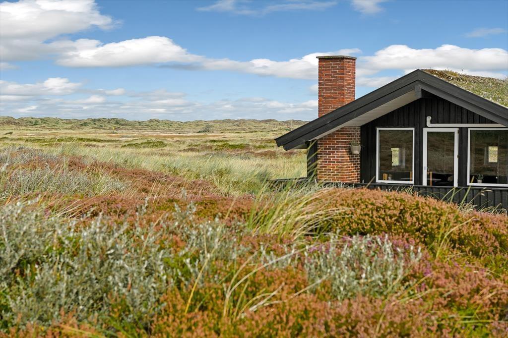 Mit seinem grünen Dach und der schwarzen Holzfassade fügt sich das Ferienhaus harmonisch in die offene Heidelandschaft ein, die sich hier erstreckt. Drinnen kannst du direkt auf das lila Heidekraut, die wogenden Strandhafer und den blauen Himmel blicken, sodass du auch dann die Natur genießen kannst, wenn du den ganzen Tag auf dem Sofa verbringen möchtest. Der Grundriss bietet drei Schlafzimmer und ein Badezimmer mit Fußbodenheizung; alle Räume sind hell und ansprechend gestaltet – natürlich auch der Wohnbereich, wo du den Kamin anzünden, dich in der Sofaecke zurücklehnen, mit deinem Strickzeug in den Sessel setzen oder ein leckeres Abendessen am Esstisch vorbereiten kannst.