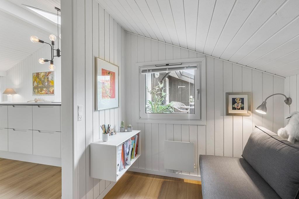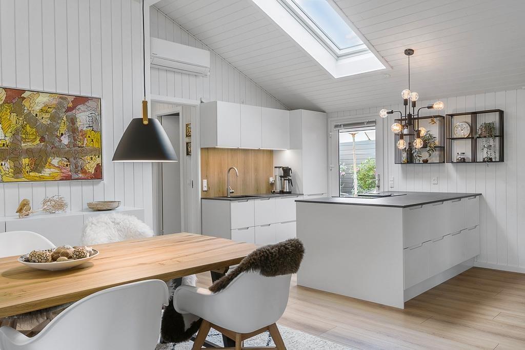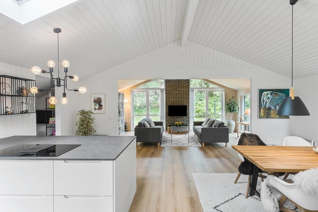 Drinnen empfängt dich eine luftige, skandinavisch inspirierte Atmosphäre. Der offene Wohnraum verbindet Küche, Essbereich und Sofaecke zu einem hellen Treffpunkt für die ganze Familie – ideal zum Kochen, Spielen oder Entspannen vor dem Fernseher mit Chromecast. Es gibt sowohl dänische als auch deutsche Programme, und die Wärmepumpe sorgt jederzeit für ein angenehmes Raumklima.