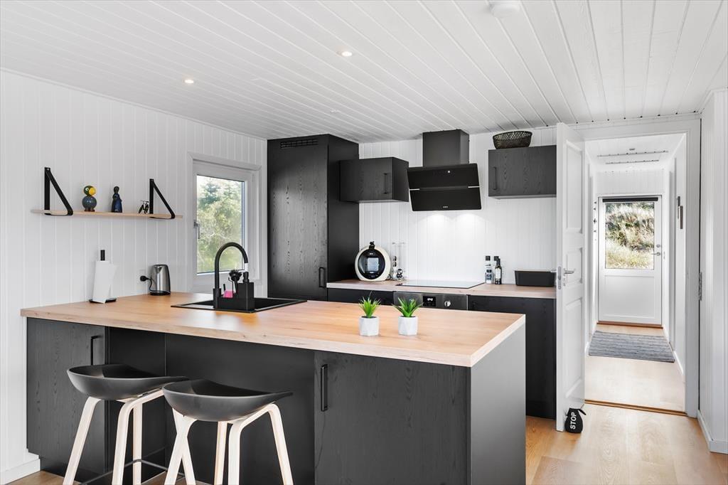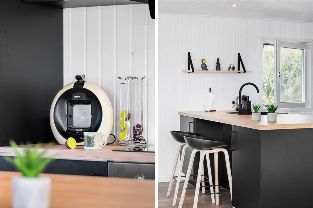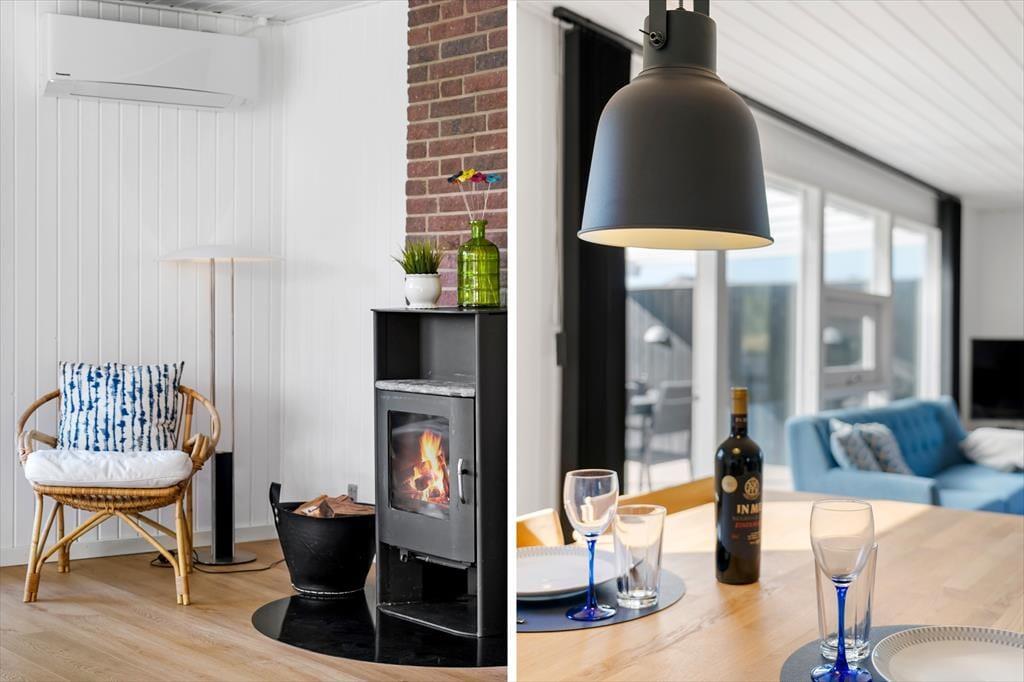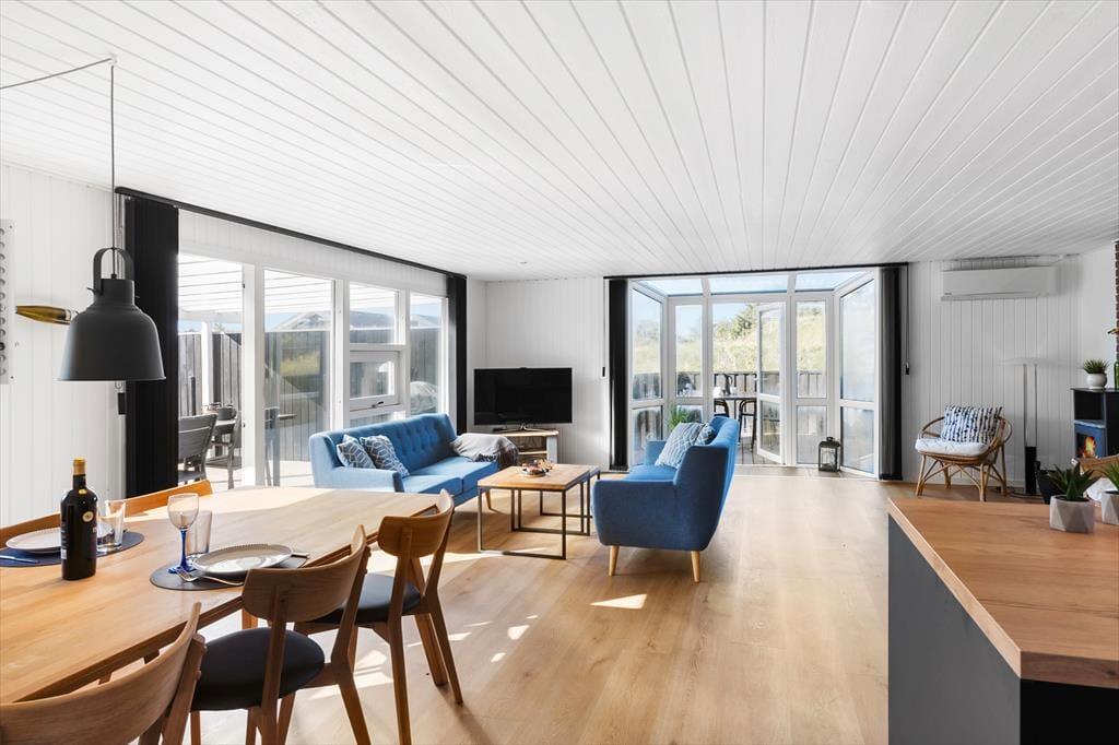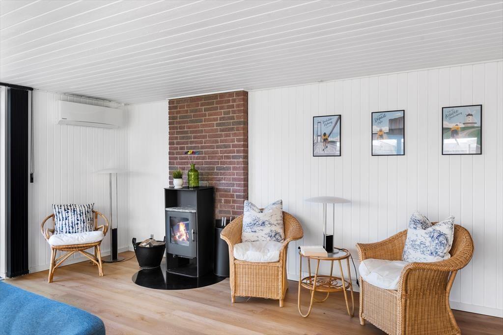 Im Inneren des Ferienhauses erwartet Sie eine helle und einladende Atmosphäre, die Sie sofort zu Hause fühlen lässt. Das gemütliche Wohnzimmer ist der ideale Ort, um sich nach einem langen Tag am Strand zu versammeln – hier können Sie vor dem Kamin entspannen oder sich mit einem guten Film verwöhnen. Die Küche ist offen und funktional, sodass Sie gemeinsam kochen und die Mahlzeiten am Esstisch genießen oder sie nach draußen mitnehmen können. Das Haus verfügt auch über zwei Schlafzimmer, sodass genügend Platz für Erholung und eine gute Nacht Schlaf vorhanden ist.