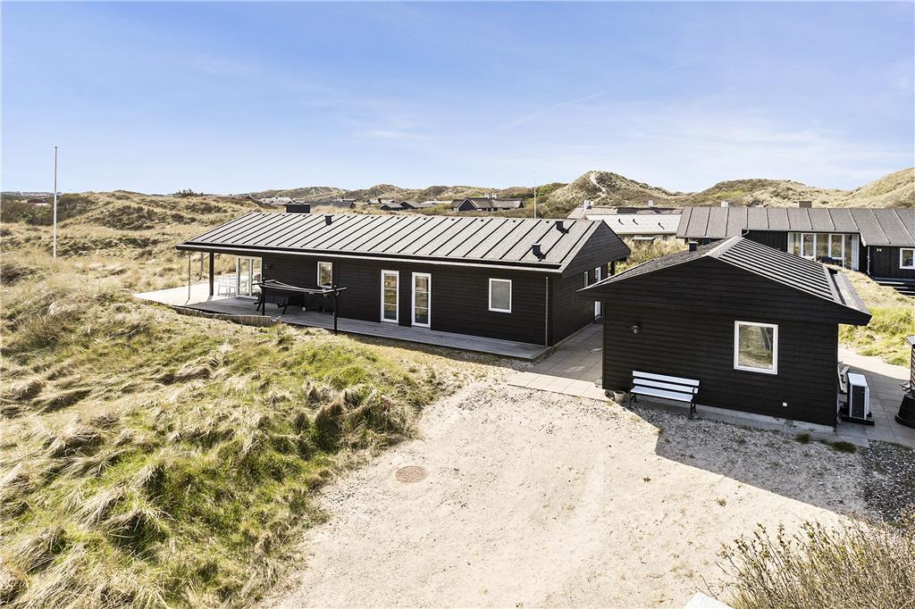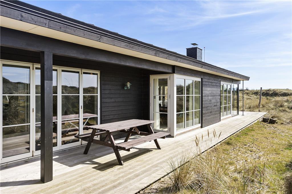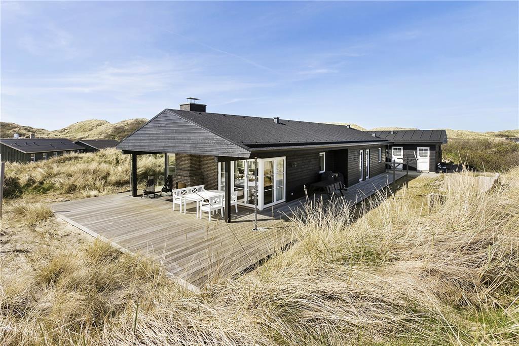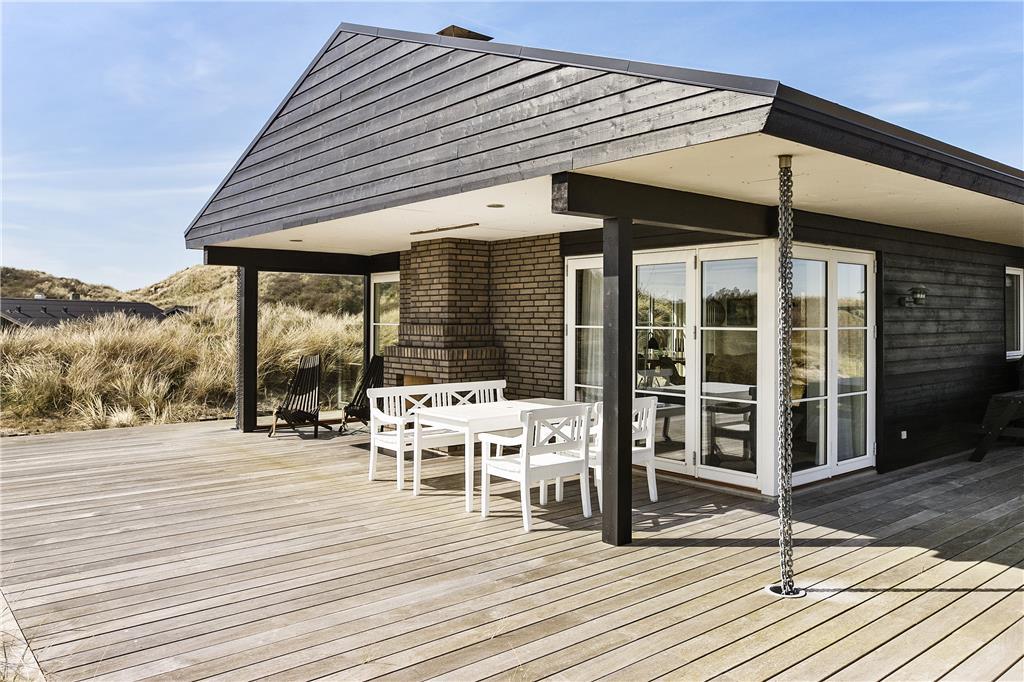 Das Ferienhaus liegt auf einem großen Naturgrundstück in den hügeligen Dünen mit massenhaft Strandhafer. Vom Wohnbereich wird eine erstklassige Terrasse mit genügend Platz, Außenkamin und einem überdachten Bereich betreten, unter den Sie sich mit Einsetzen des Abendtaus zurückziehen können. Gartenmöbel, Liegestühle und ein Grill sind vorhanden. Sand und Salz können Sie sich unter Außendusche nach dem Sprung in die Nordsee abspülen.