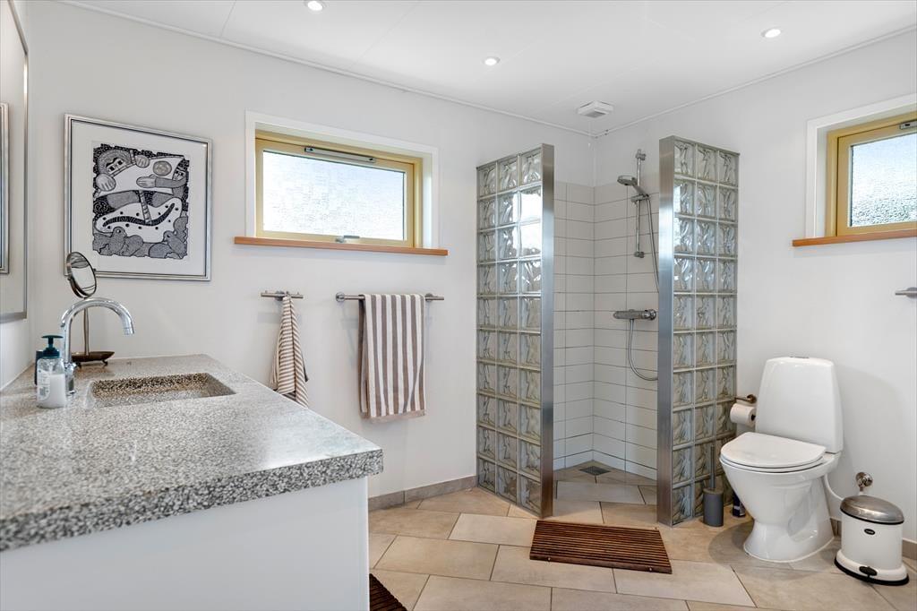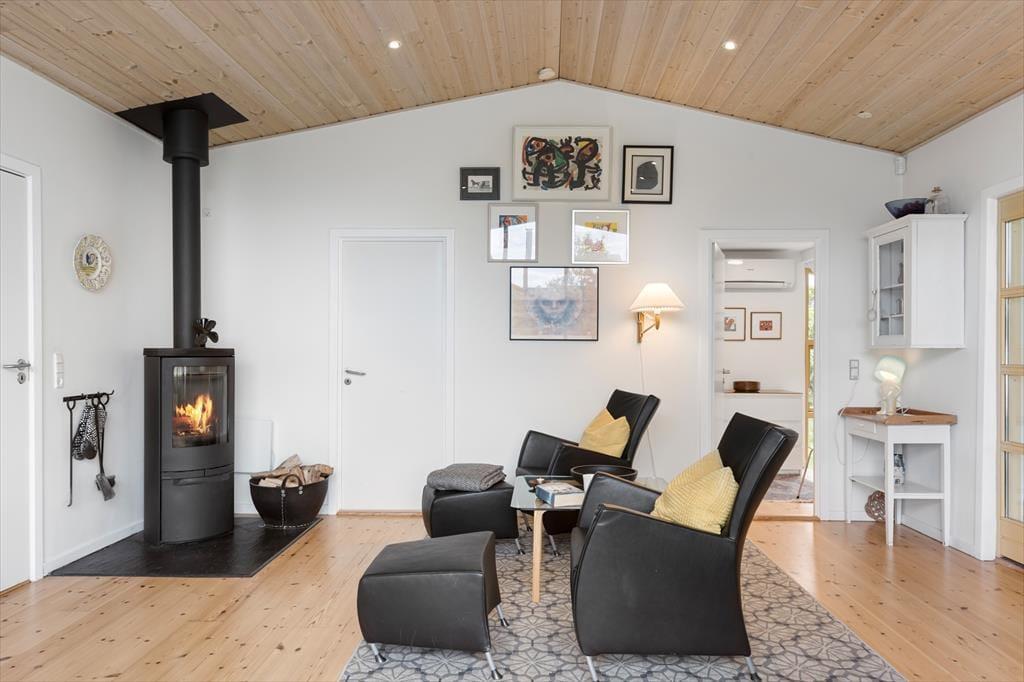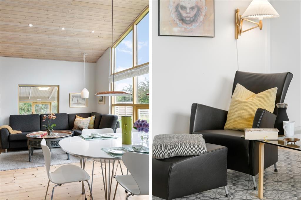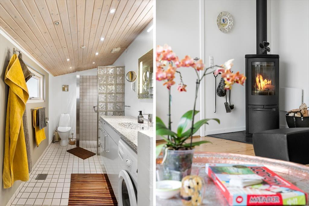 Das angenehm geräumige Ferienhaus mit einer Wohnfläche von 92 m² wird durch ein Nebengebäude mit weiteren 55 m² ergänzt. Beide Gebäude verfügen über ein Badezimmer. Zwei der drei Schlafräume begrüßen Sie mit je einem Doppelbett. Im dritten Schlafraum stehen zwei Einzelbetten zur Verfügung. Alle Räumlichkeiten bestechen mit einer einladenden, heimeligen Atmosphäre. Dieses Haus zählt definitiv nicht zu den "standardisierten Haustypen" und bietet eine persönliche Einrichtung. Der schönste Raum ist der Wohnraum, in dem Sie auf einen gemütlichen Aufenthaltsplatz mit Lehnstühlen vor dem Kaminofen, auf ein Sofa und auf einen Esstisch vor der großen Fensterpartie gen Westen treffen. Die gute Küche fügt sich offen in den Wohnraum ein. Durch eine Tür gelangen Sie in den schönen Wintergarten.