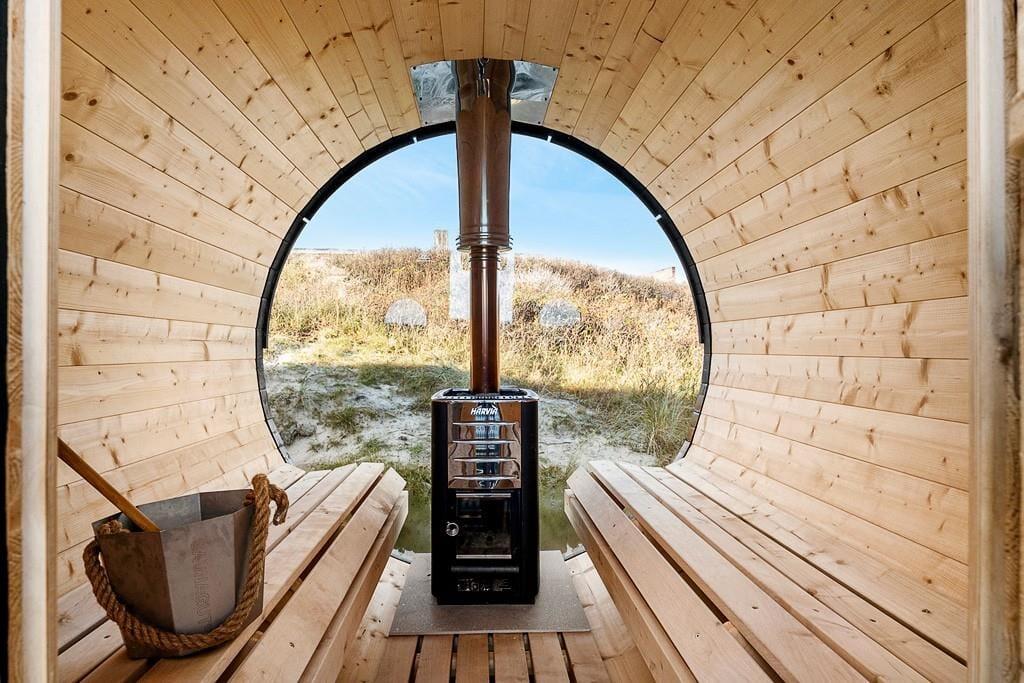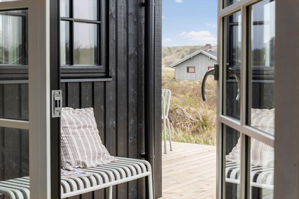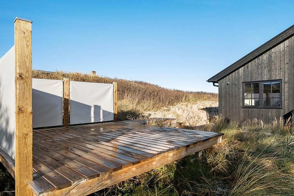 Unter freiem Himmel erfreuen Sie sich ebenfalls an bester Ferienhausstimmung. Das Haus liegt auf einem hügeligen Naturgrundstück mit einem tollen Terrassenareal. Vom Wohnraum und von einem der Schlafräume aus treten Sie durch französische Flügeltüren hinaus in die Sonne und an die frische Seeluft. Gartenmöbel, Liegestühle, ein Grill und ein Sonnenschirm stehen für Sie bereit. Gleiches gilt für eine Außendusche, die Ihnen nach einem Abstecher an den Strand den Sand und das Salz des Meeres von der Haut spült. Eine Lademöglichkeit für E-Autos ist verfügbar.
