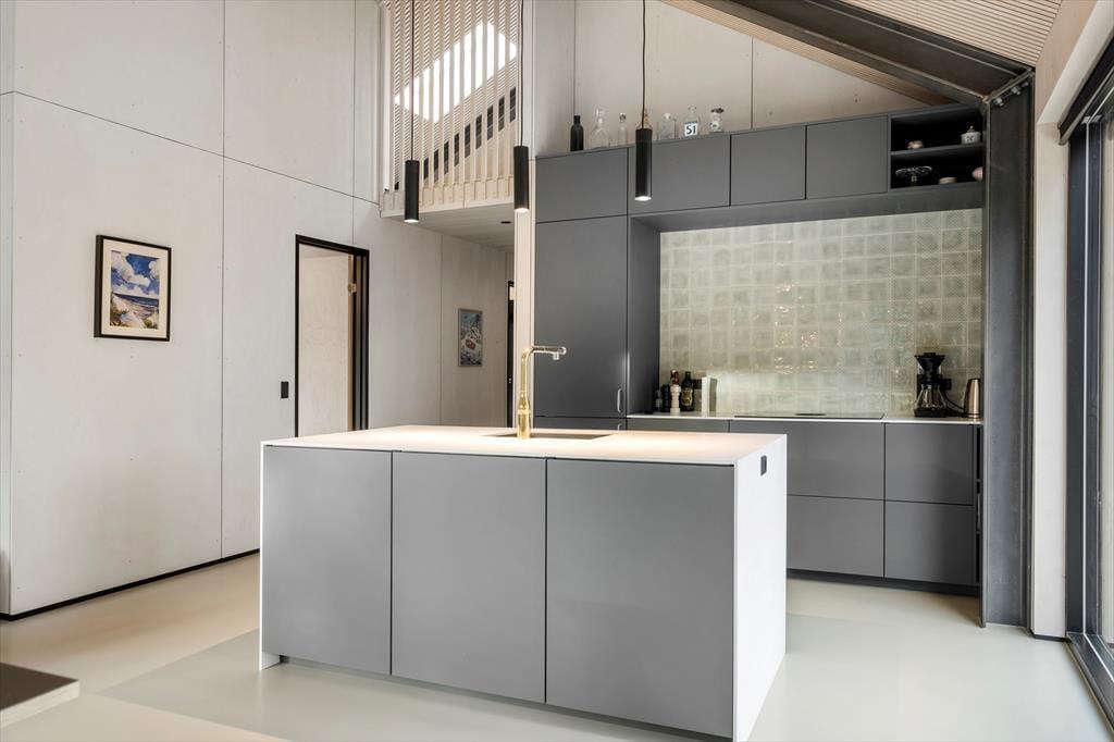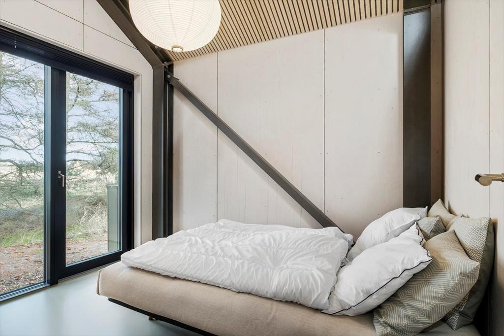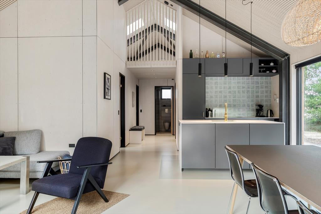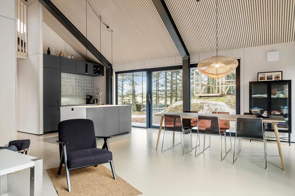 Mit seinem begrünten Dach und der schönen Holzfassade fügt sich das Ferienhaus optisch perfekt in die Umgebung ein. Die großen Fenster erwecken im Inneren das Gefühl, als würde die Wohnfläche mit dem hügeligen Naturgrundstück verschmelzen. Die Wohnfläche umfasst zwei Duschbadezimmer und drei Schlafräume mit je einem Doppelbett. Der Eingangsbereich ist mit einer Garderobe und einer Waschmaschine ausgestattet. Der Wohnraum begeistert mit seiner imposanten Deckenhöhe und den bereits erwähnten riesigen Fenstern. In der tollen Küche wird die gemeinsame Zubereitung der Mahlzeiten zum Vergnügen. Die Profildecken sind nicht nur schön anzusehen, sondern auch angenehm geräuschhemmend. Sämtliche Räumlichkeiten sind mit einer Fußbodenheizung versehen.