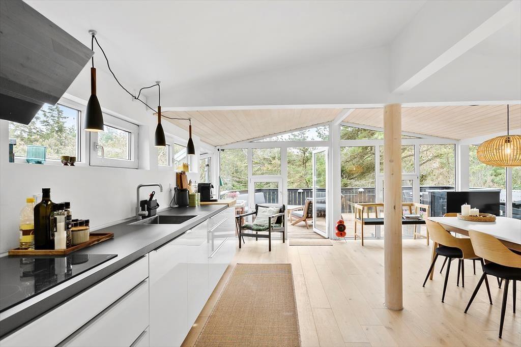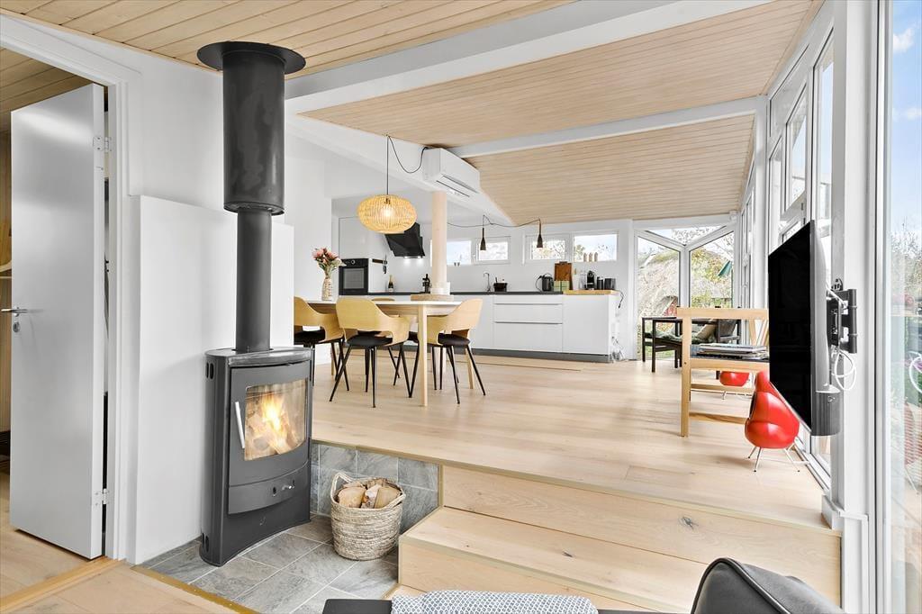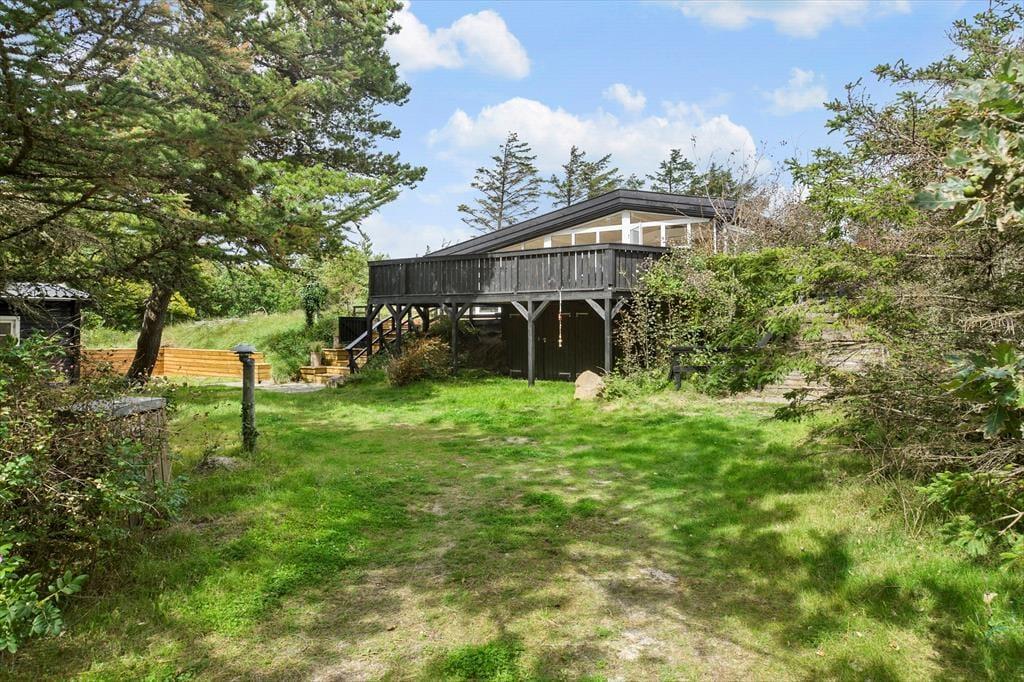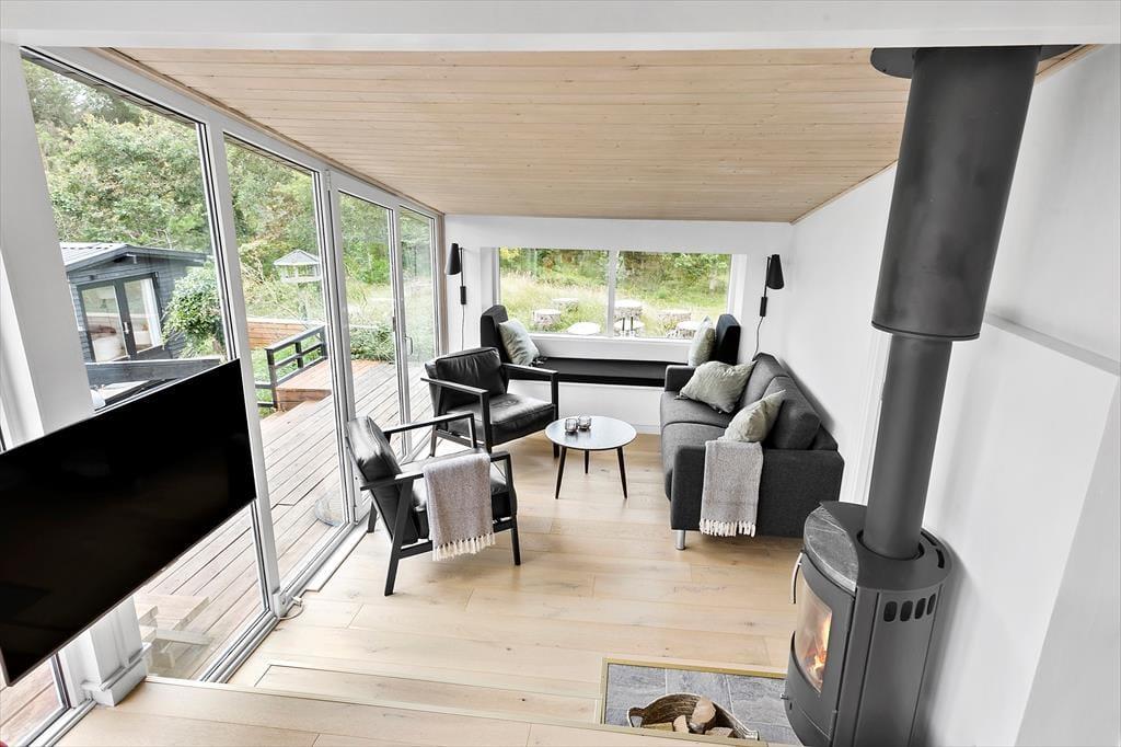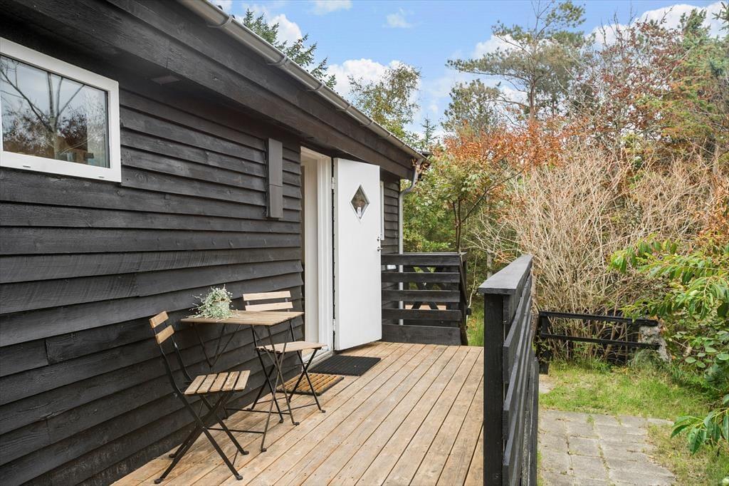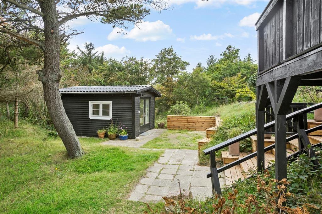Zwischen Bäumen und Büschen liegt dieses Mietobjekt verborgen auf einem hügeligen Naturgrundstück. Eine Treppe führt Sie hinauf zur Eingangstür. Im Haus markieren ein paar Stufen den Übergang zwischen dem Küchen- und Essbereich und dem Wohnraum mit einem Kaminofen. Dies ist nur eines der schönen Details, die in diesem 80 m² großen Haus zu finden sind. Beachten Sie in diesem Zusammenhang auch die eingebaute Liege und den Vorbau im Wohnraum. Letztgenannter sorgt für in der Küche für einen schönen Tageslichteinfall. Die Räumlichkeiten präsentieren sich allesamt mit geschmackvollem Inventar und einer schönen Wohnatmosphäre. Ein ansprechendes Badezimmer und drei Schlafräume stehen für Sie bereit. Hinzu gesellen sich mehrere Schlafplätze im Nebengebäude, sodass Sie ohne weiteres weitere Familienmitglieder oder gute Freunde in den Urlaub einladen können.