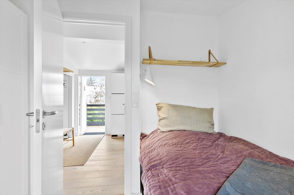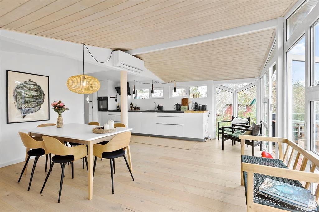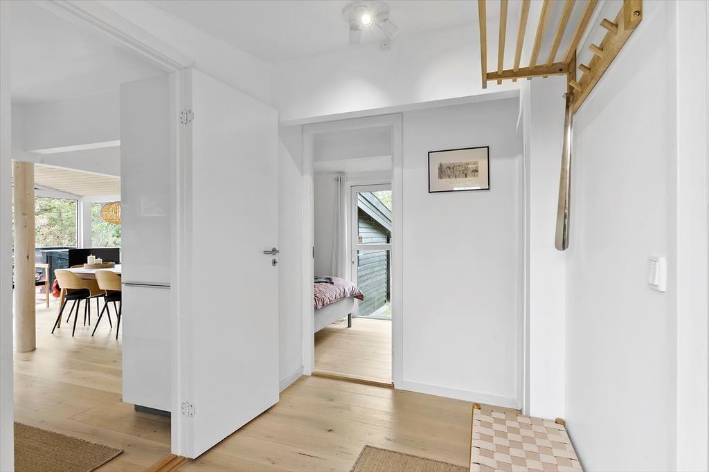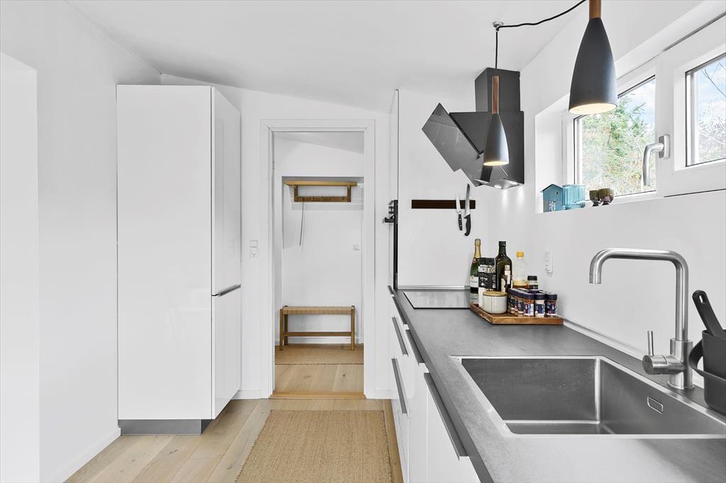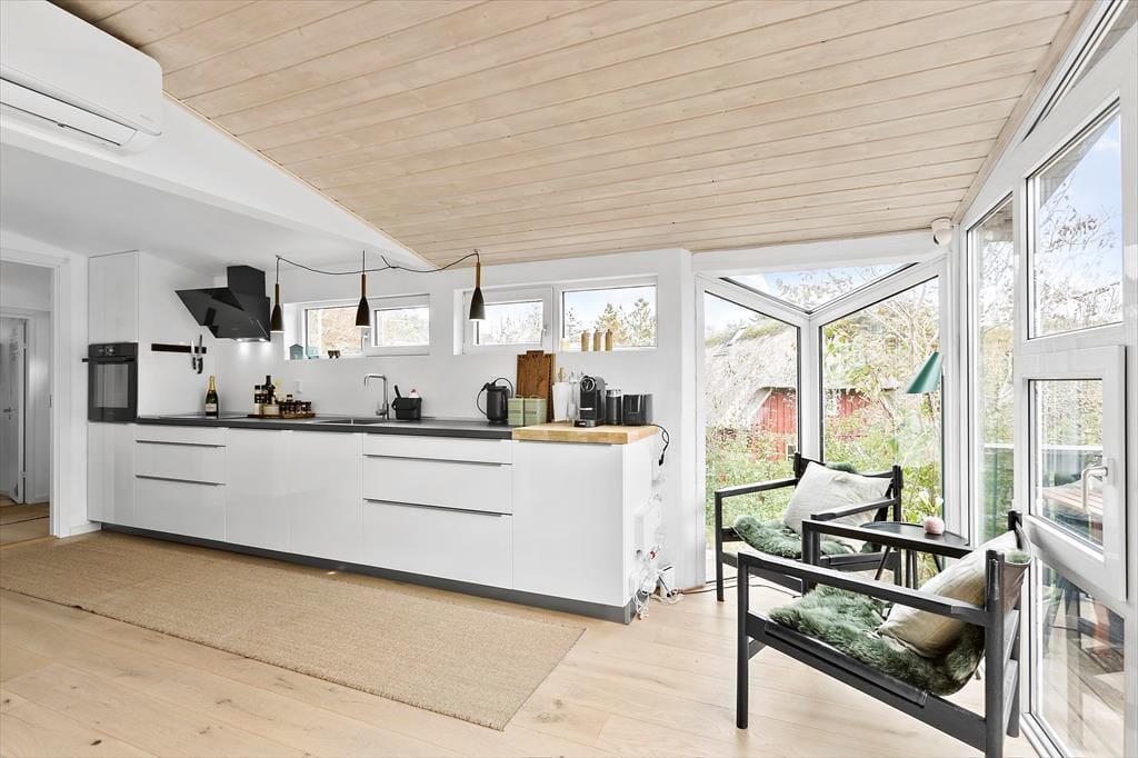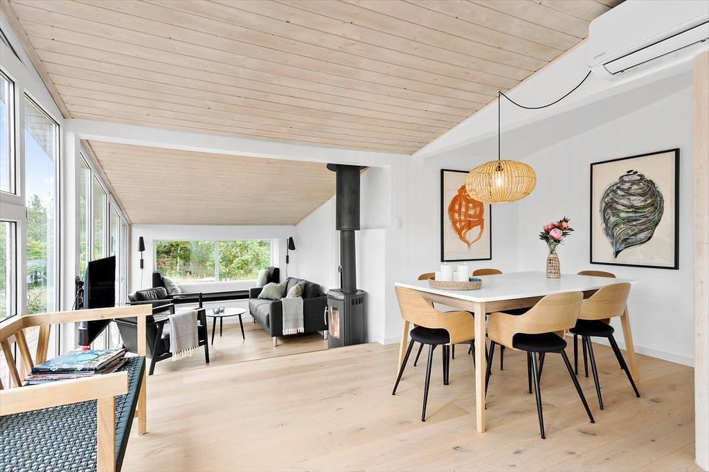 Zwischen Bäumen und Büschen liegt dieses Mietobjekt verborgen auf einem hügeligen Naturgrundstück. Eine Treppe führt Sie hinauf zur Eingangstür. Im Haus markieren ein paar Stufen den Übergang zwischen dem Küchen- und Essbereich und dem Wohnraum mit einem Kaminofen. Dies ist nur eines der schönen Details, die in diesem 80 m² großen Haus zu finden sind. Beachten Sie in diesem Zusammenhang auch die eingebaute Liege und den Vorbau im Wohnraum. Letztgenannter sorgt für in der Küche für einen schönen Tageslichteinfall. Die Räumlichkeiten präsentieren sich allesamt mit geschmackvollem Inventar und einer schönen Wohnatmosphäre. Ein ansprechendes Badezimmer und drei Schlafräume stehen für Sie bereit. Hinzu gesellen sich mehrere Schlafplätze im Nebengebäude, sodass Sie ohne weiteres weitere Familienmitglieder oder gute Freunde in den Urlaub einladen können.