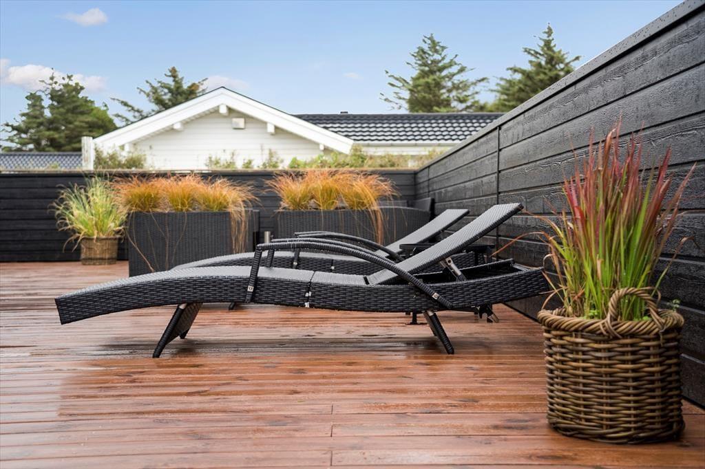 Das Urlaubsdomizil ruht auf einer grünen Grasfläche, die von einer Hecke und einem Sichtschutzzaun umgeben ist. Ihre Kinder und Ihre Hunde können hier nach Herzenslust spielen und umhertollen. Das Terrassenareal ist komplett geschlossen - ein Umstand, den Hundebesitzer und Eltern abenteuerlustiger Kleinkinder ebenfalls sehr schätzen dürften. Die Terrasse ist groß und sonnig und lädt mit ihren Gartenmöbeln, den Liegestühlen, dem Sonnenschirm und dem Grill zu traumhaft erholsamen Stunden und geselligen Runden ein.