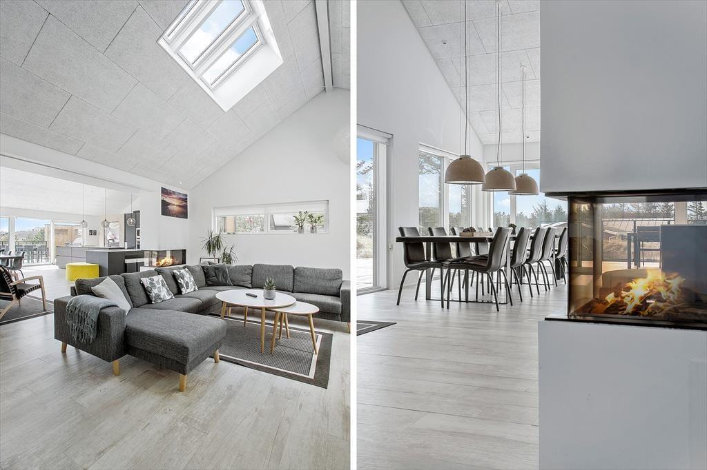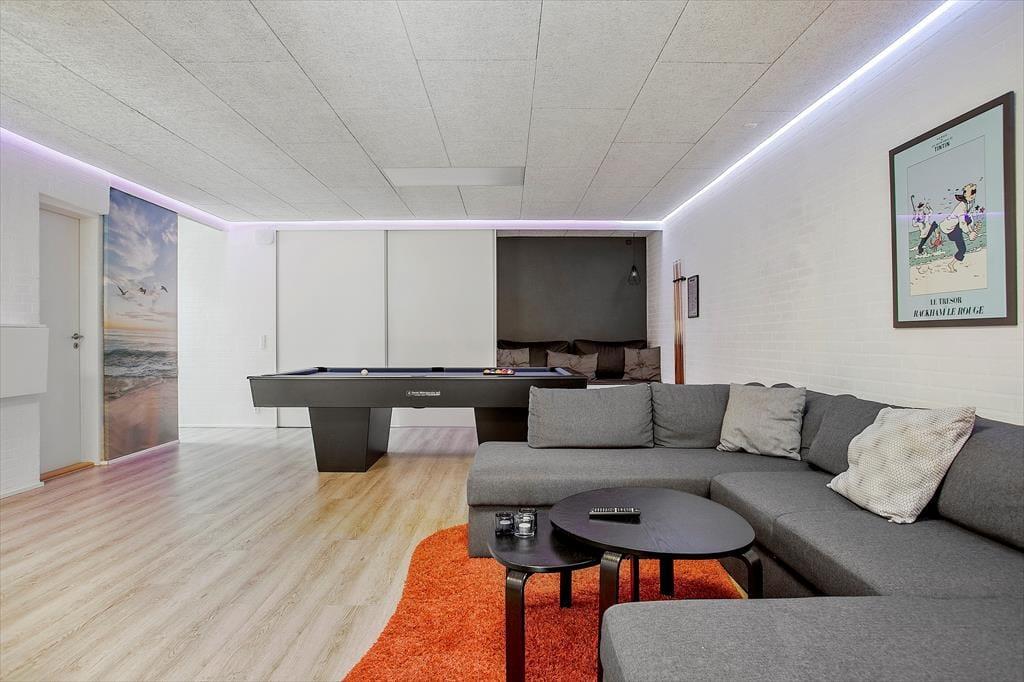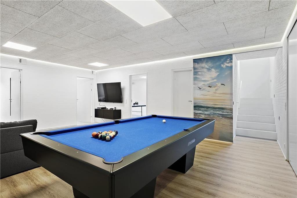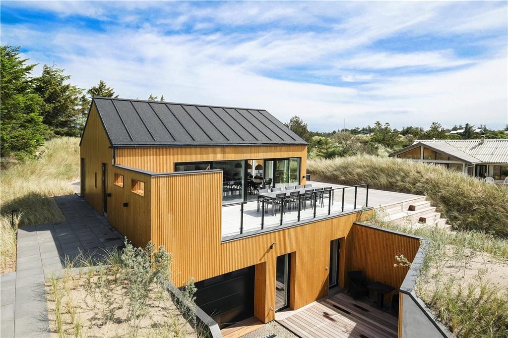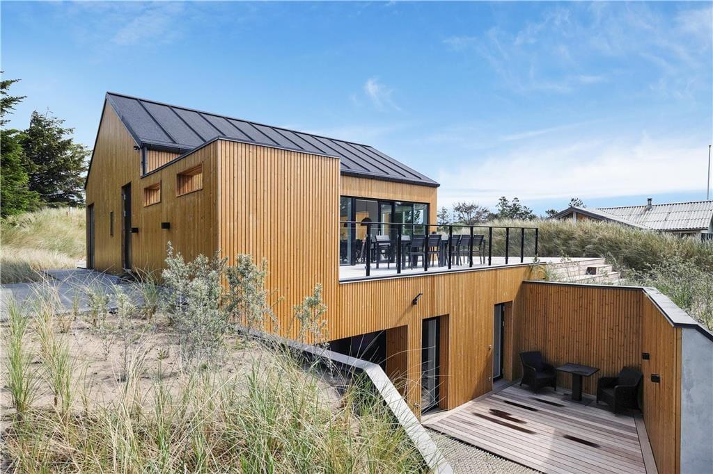Bereits von außen werden Sie sofort erkennen, dass sich dieses moderne Ferienhaus ganz weit vom Durchschnitt abhebt. Das in eine Düne gebaute Haus empfängt Sie mit einer Wohnfläche von unglaublichen 200 Quadratmetern, die sich über zwei Ebenen erstrecken. Die besonders geschmackvolle Architektur wird sehr gut durch die Verwendung hochqualitativer Materialien untermalt. Der prächtige Eindruck setzt sich auch Inneren des Mietobjektes fort. Im Erdgeschoss begeistert besonders der große Aufenthaltsbereich mit einer grandiosen Küchenabteilung und dem stimmungsvollen Einbaukamin. Sollte Ihnen und Ihren Kindern der Sinn nach ein wenig Abwechslung stehen, so ist hierfür im Aktivitätsbereich im Untergeschoss gesorgt. Die Tischtennisplatte, der Billardtisch/pool und auch die PS4-Spielekonsole lassen zu keiner Zeit Langeweile aufkommen. Mit seinen im Ober- und Untergeschoss untergebrachten Schlafräumen beherbergt das Haus bis zu 14 Personen und macht es somit neben einem perfekten Domizil für einen Sommerurlaub auch zu einer idealen Wahl für Familientreffen, Geburtstage und andere Feierlichkeiten.
