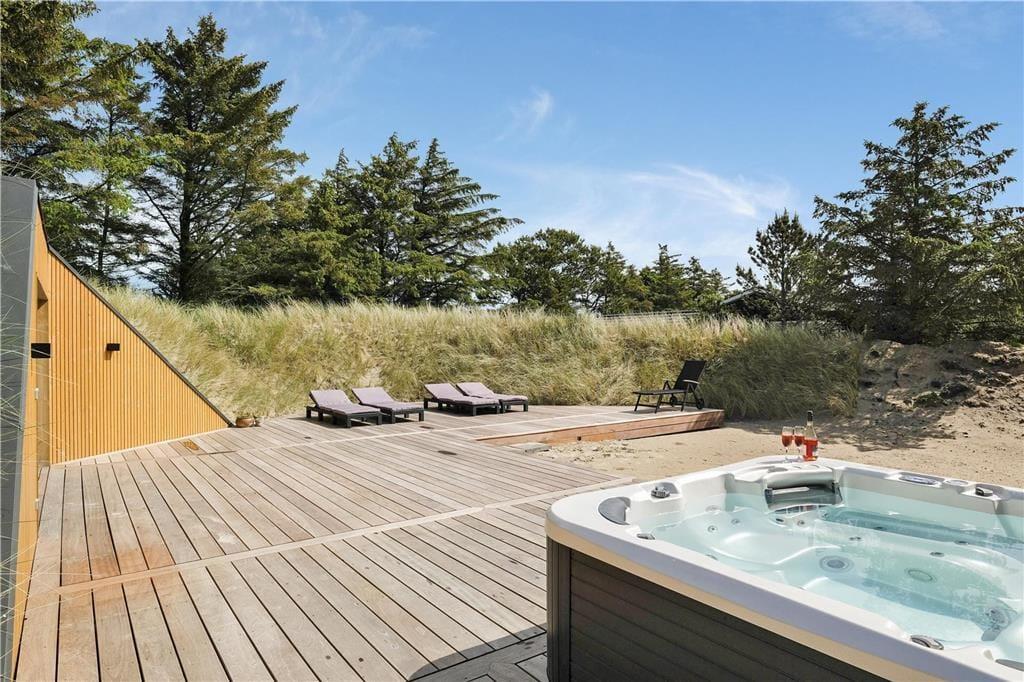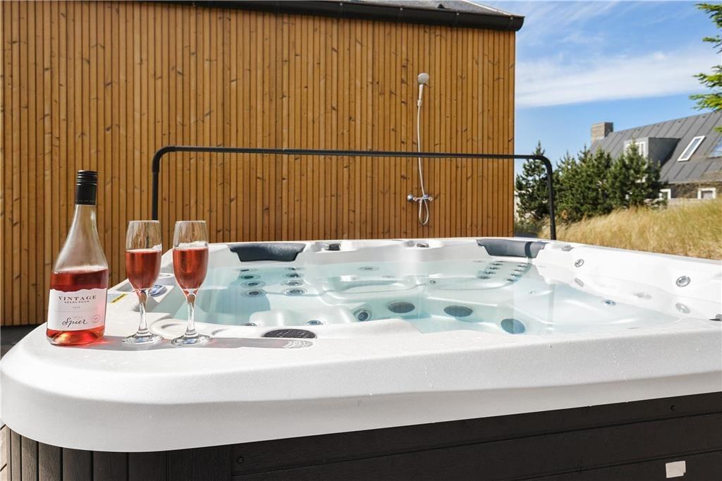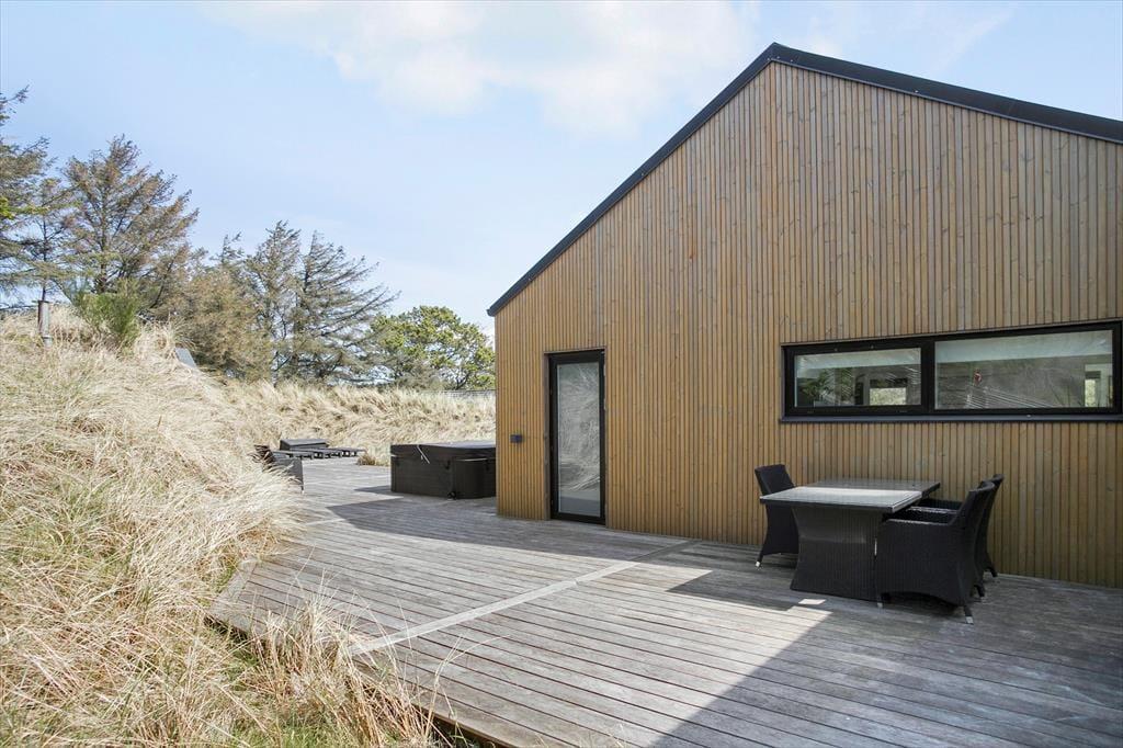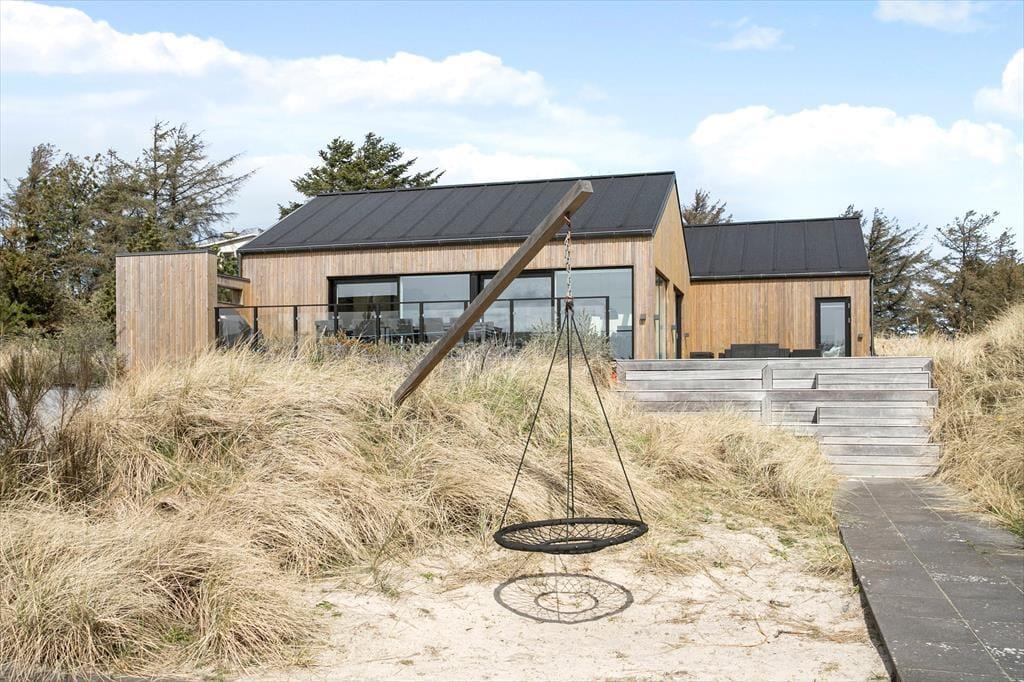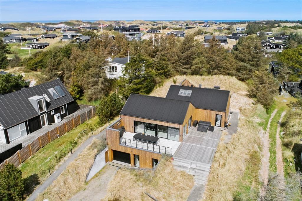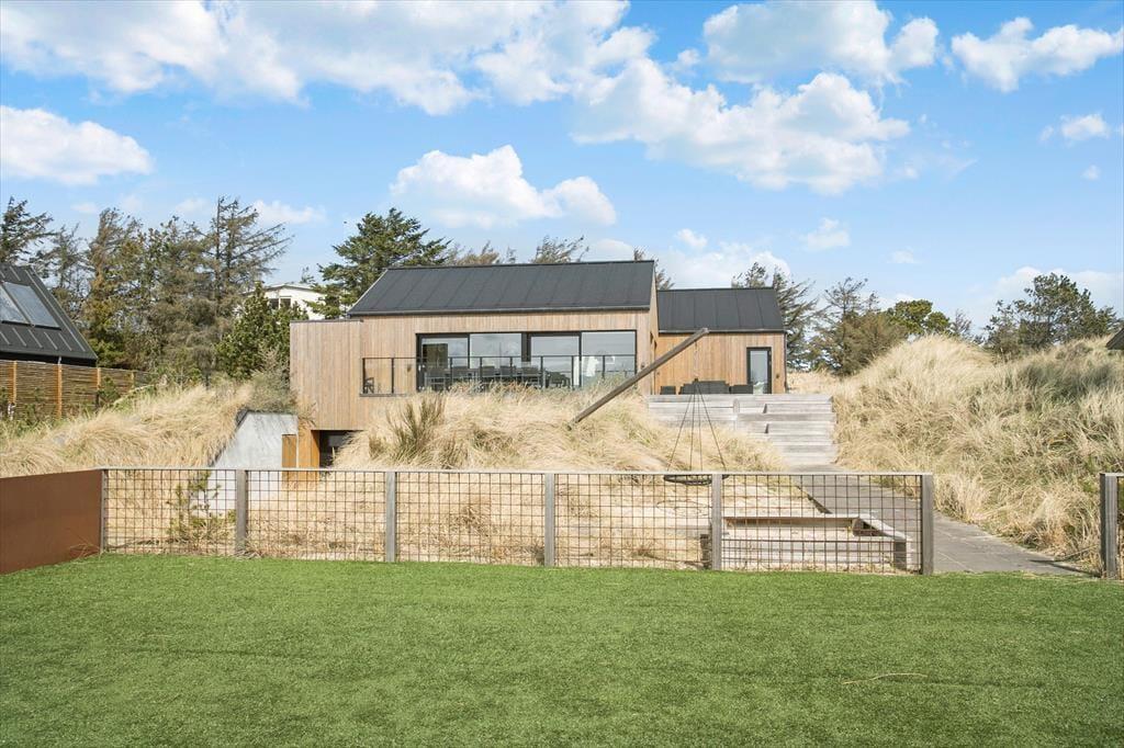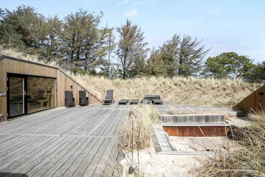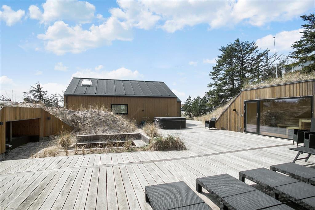 Auch der Außenbereich bietet eine einzigartige Kulisse für Ihren Urlaub. Das Gelände ist wunderschön angelegt und verfügt über große Terrassenflächen, die von mit Seegras bewachsenen Dünen und niedrig wachsenden Koniferen umgeben sind. Auf den Terrassen können Sie sich in den schönen Gartenmöbeln entspannen, den Grill anfeuern und den großen und komfortablen Außen-Spa nutzen oder in die große Sauna springen, die wunderschön in die Düne integriert ist. Das Haus verfügt auch über einen Unterstand, der ebenfalls in die Düne gebaut ist. Kinder, die gerne Fußball spielen, können ihre Tricks auf dem Kunstrasenplatz üben, so dass Sie Ihre Fußballkünste während Ihres Urlaubs problemlos aufrechterhalten können.