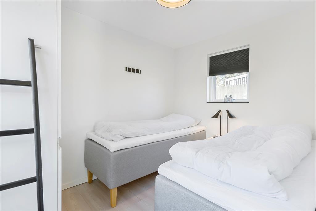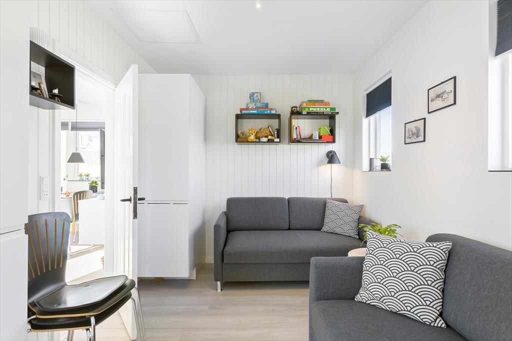 Die mit 59 m² eher klein ausfallende Wohnfläche wurde bestmöglich genutzt, sodass dieses Ferienhaus bis zu sechs Personen beherbergt. In einem der Schlafräume stehen zwei Einzelbetten zur Verfügung. Im anderen Schlafraum sind zwei doppelte Schlafsofas mit insgesamt vier Schlafplätzen untergebracht. Beide Zimmer präsentieren sich angenehm hell und einladend. Die gilt übrigens auch für das Duschbadezimmer und den Aufenthaltsraum, der die Küche und den Wohnraum offen in sich vereint. An kühlen Tagen sorgen die Wärmepumpe und der Kaminofen für angenehme Temperaturen. An warmen Tagen stellen Sie hingegen die doppelte Terrassentür weit auf und lassen die frische Seeluft durch das Haus ziehen.