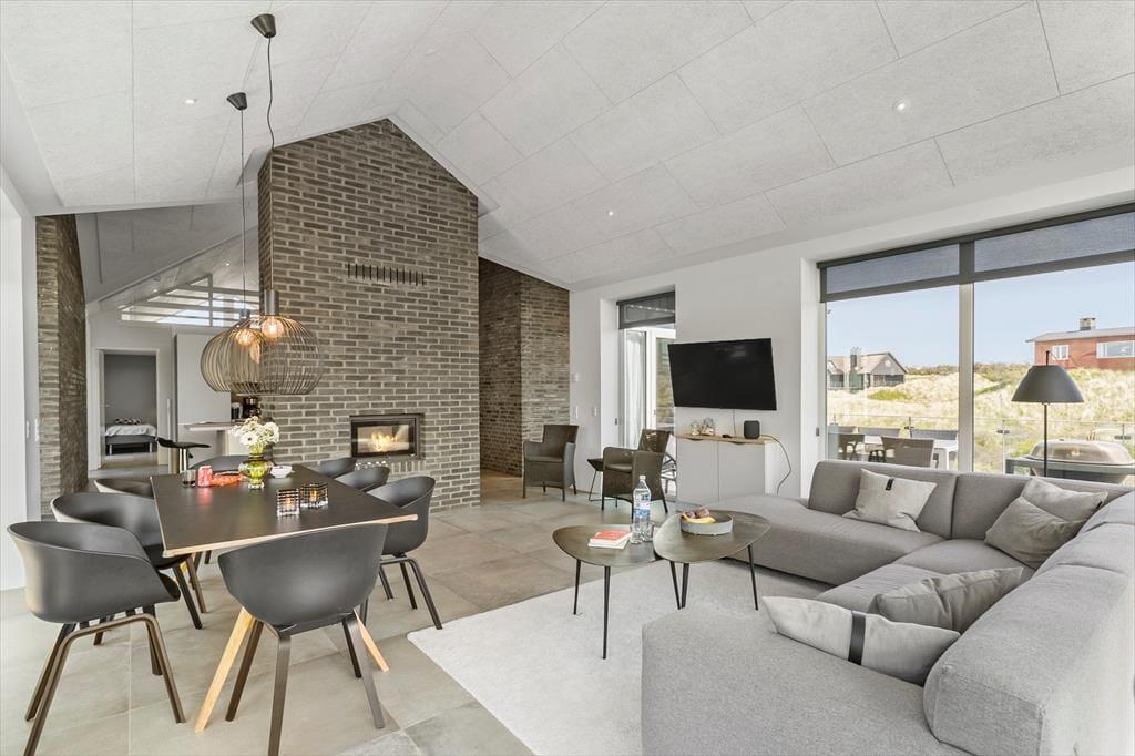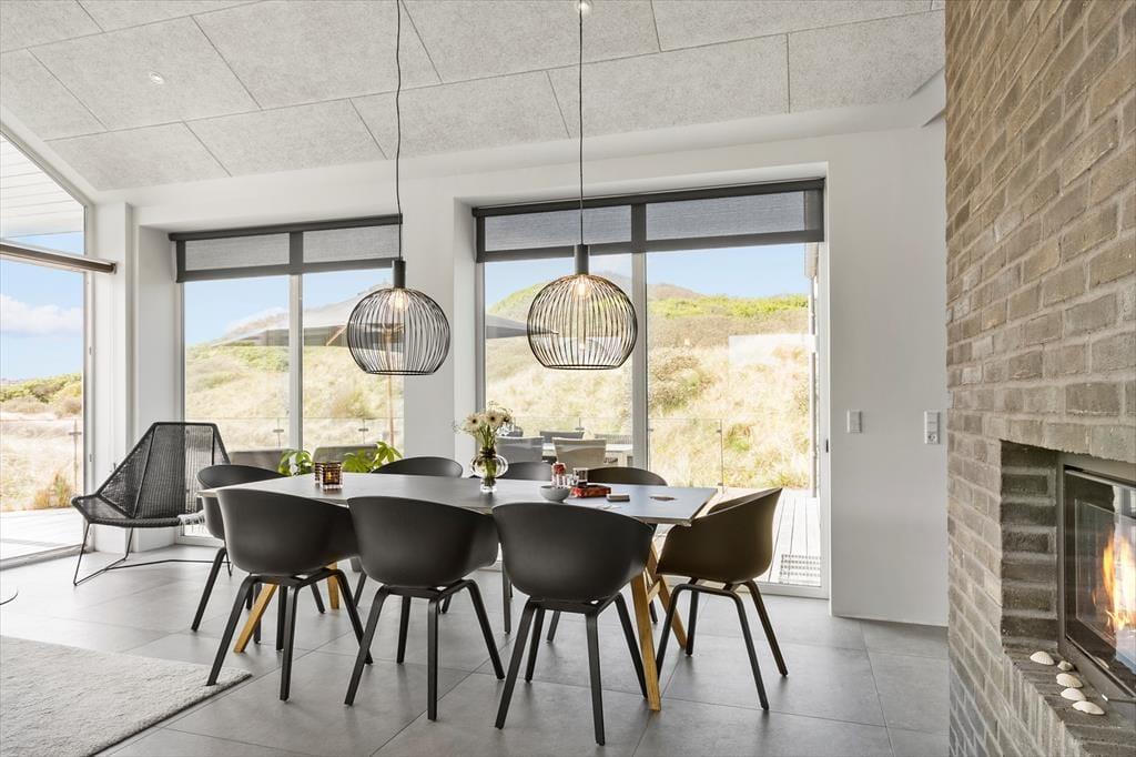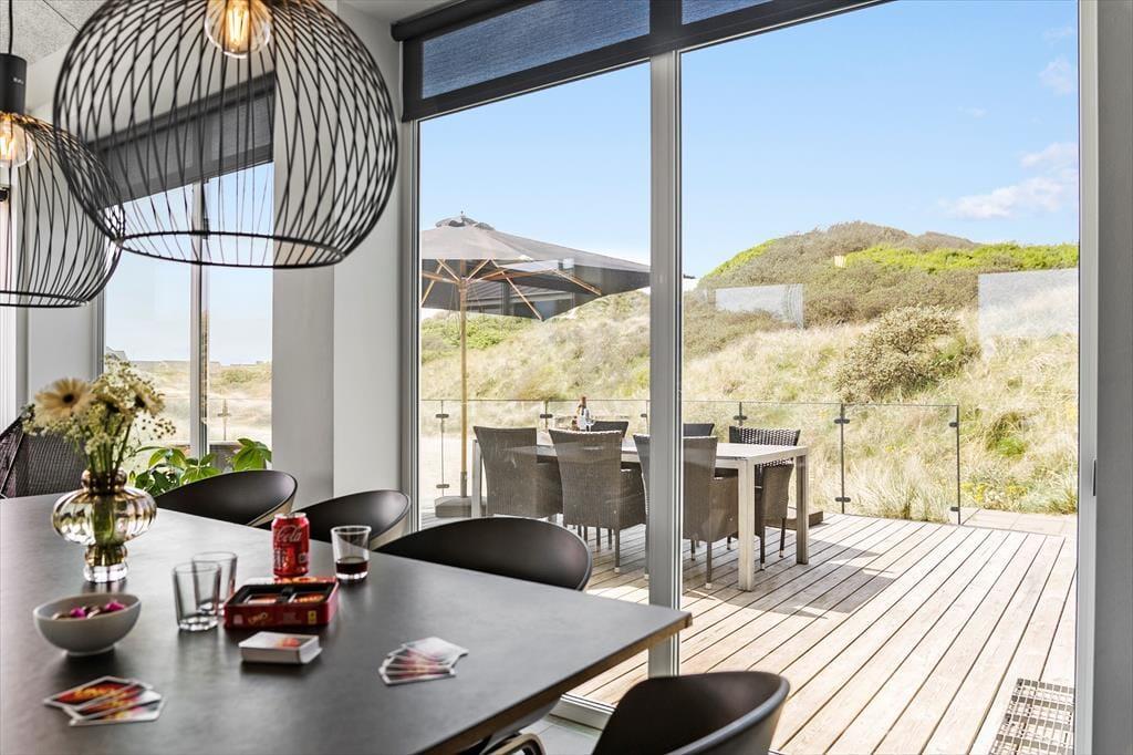 Die Bilder dieses Hauses sprechen für sich! Bereits nach einem kurzen Blick auf die Bilder werden Sie erkennen, dass es sich hier ein außergewöhnlich schönes Exemplar mit exklusiver Lage und Dünenblick handelt. Aufgrund der wohldurchdachten Raumaufteilung beherbergt es bis zu acht Personen. Die vier Schlafzimmer verteilen sich auf drei Flügel, die alle mit einem eigenen Badezimmer ausgestattet sind. Im Untergeschoss erwartet Sie sogar ein viertes Badezimmer, das mit seinem Whirlpool und der Sauna zu traumhaft erholsamem Momenten einlädt. Unten im Haus befindet sich außerdem der Aktivitätsraum, in dem sich Jung und Alt gemeinsam an der Wii-Spielkonsole vergnügen, Tischkicker, Tischtennis und Billard spielen können. Der Wohnraum ist der perfekte Sammelpunkt für alle Mitreisenden. Er begeistert mit einer herrlichen Atmosphäre, die unter anderem auf die stilvolle Einrichtung, die tolle Deckenhöhe und den beeindruckenden Ausblick auf die Natur zurückzuführen ist. Gemütlichkeit und Charme verströmt der eingemauerte Kaminofen. Dank der offenen Verbindung zur Küche ist es ein Leichtes, die Zubereitung der Mahlzeiten mit gemütlichen Stunden im Kreise Ihrer Lieben zu kombinieren.