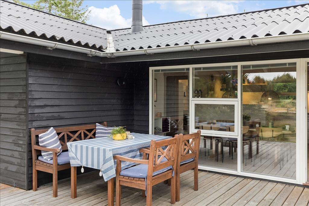 Wenn der Sonnenschein Sie ins Freie lockt, ist es leicht einen passenden Aufenthaltsplatz zu finden. Um das Haus herum breitet sich eine große Holzterrasse aus mit vielen schönen Sonnenplätzen und ungestörten Arealen – und außerdem gibt eine Außen Dusche, herrlich für die warmen Sommertage. Die jüngsten Feriengäste können schaukeln und im Sandkasten spielen, während die ganze Familie an Versteckspielen und anderen Freiluftaktivitäten auf dem 2400 m2 grossen Naturgrundstück Teil haben kann.