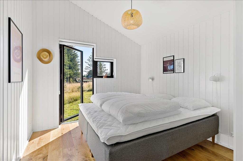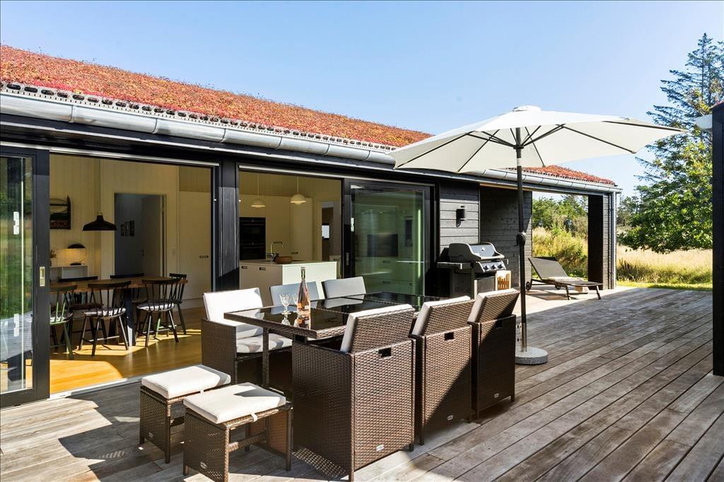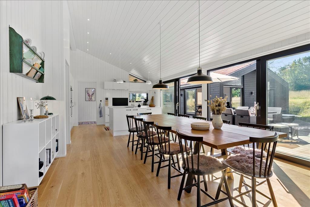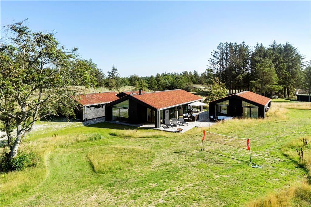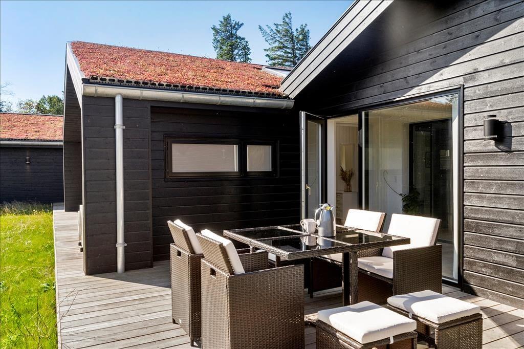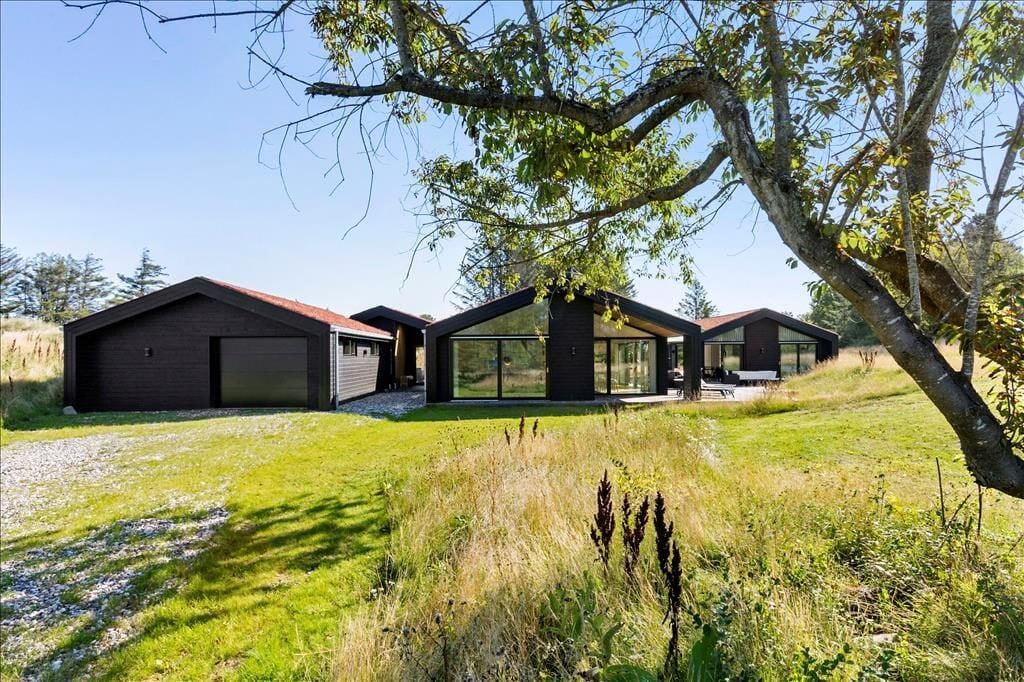 Das Ferienhaus imponiert schon beim ersten Hinsehen mit seiner stillsicheren Architektur und harmonischen Platzierung in der naturschönen Landschaft. Sie bekommen ein Haupthaus von 139 m2 und ein Nebengebäude von 53 m2, die durch Terrassenareale miteinander verbunden sind. Im Haupthaus herrscht eine helle und einladende Stimmung, und die grossen Fensterfronten sorgen zum einen für reichliche Mengen natürlichen Lichts und zum anderen für einen schönen Blick auf die vielfältige grüne Natur außerhalb des Hauses. Ein großer Küchen-/Aufenthaltsraum mit offenem Dachgeschoss bildet einen guten Rahmen für die gemeinsamen Mittage, und in Verlängerung hierzu finden Sie ein gemütliches Wohnzimmer mit Kaminofen. Von sowohl Aufenthaltsraum wie auch vom Wohnzimmer gibt es einen Ausgang zu Terrassen, welche natürlich mit den Aufenthaltsräumen verschmelzen. Im Haupthaus gibt es außerdem drei Schlafzimmer und ein Badezimmer, während das Nebengebäude über weitere drei Schlafzimmer und ein Badezimmer verfügt. Letztendlich muss der Aktivitätsraum im Nebengebäude mit Tischtennisplatte und eine Garage hervorgehoben werden.