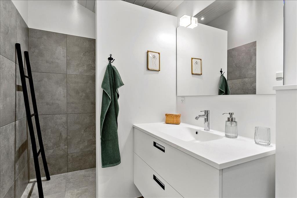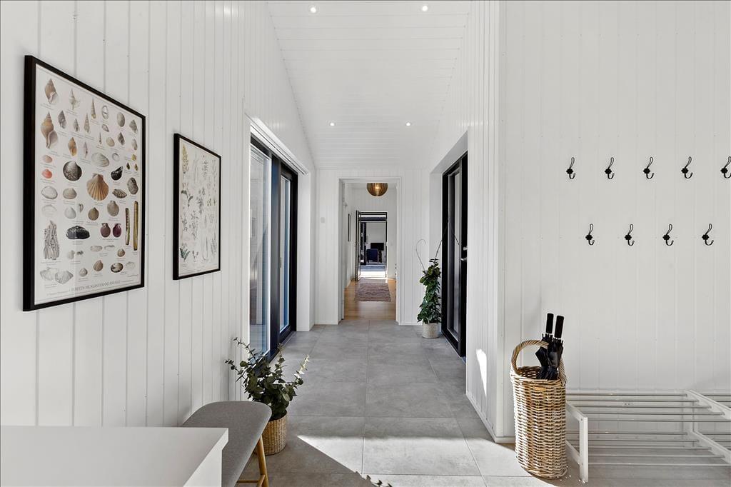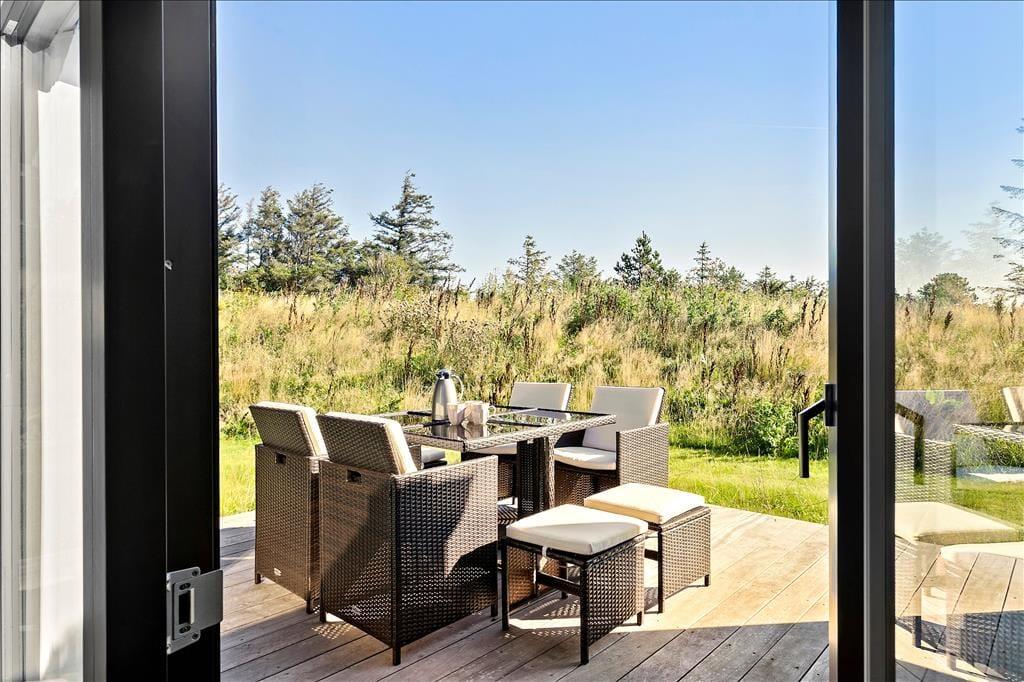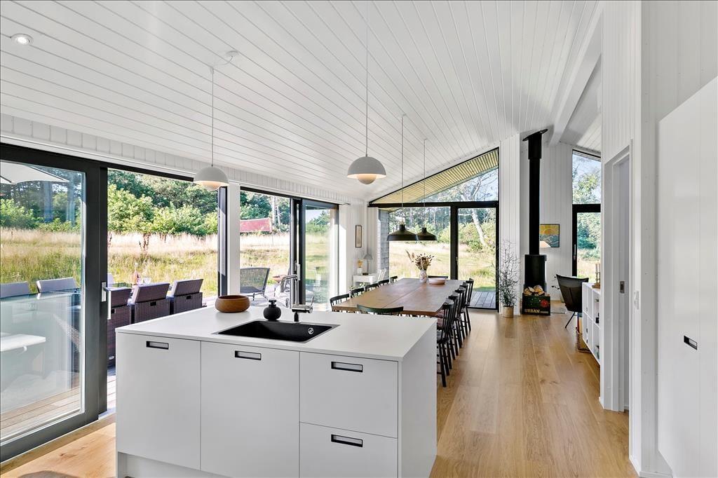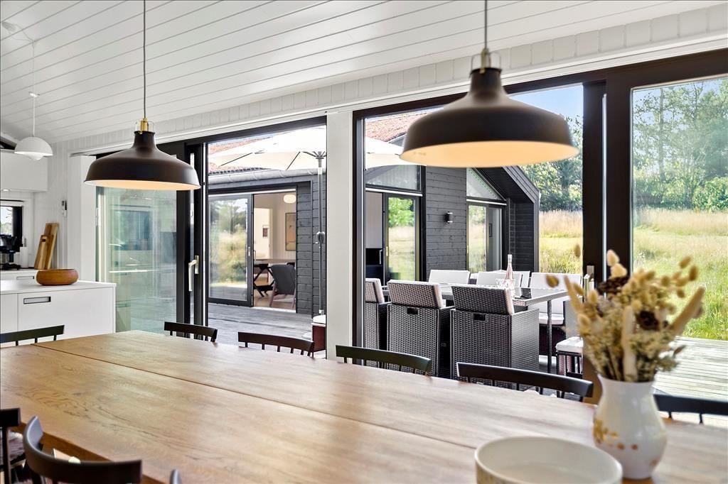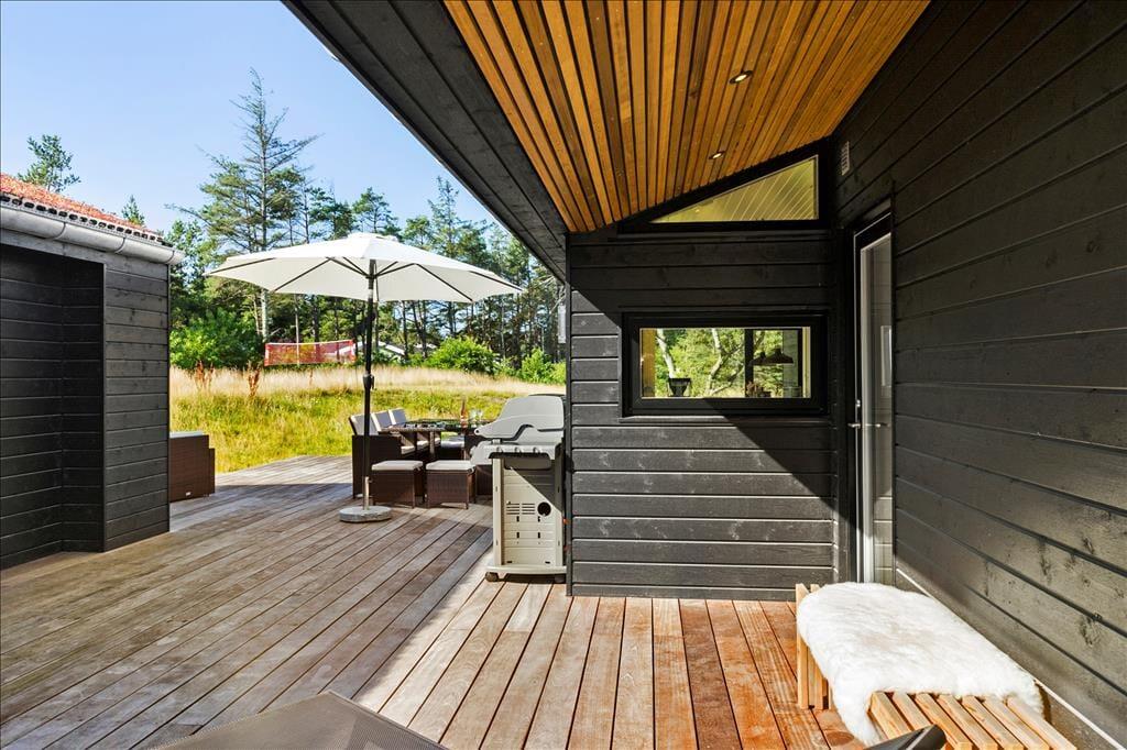 Das Ferienhaus imponiert schon beim ersten Hinsehen mit seiner stillsicheren Architektur und harmonischen Platzierung in der naturschönen Landschaft. Sie bekommen ein Haupthaus von 139 m2 und ein Nebengebäude von 53 m2, die durch Terrassenareale miteinander verbunden sind. Im Haupthaus herrscht eine helle und einladende Stimmung, und die grossen Fensterfronten sorgen zum einen für reichliche Mengen natürlichen Lichts und zum anderen für einen schönen Blick auf die vielfältige grüne Natur außerhalb des Hauses. Ein großer Küchen-/Aufenthaltsraum mit offenem Dachgeschoss bildet einen guten Rahmen für die gemeinsamen Mittage, und in Verlängerung hierzu finden Sie ein gemütliches Wohnzimmer mit Kaminofen. Von sowohl Aufenthaltsraum wie auch vom Wohnzimmer gibt es einen Ausgang zu Terrassen, welche natürlich mit den Aufenthaltsräumen verschmelzen. Im Haupthaus gibt es außerdem drei Schlafzimmer und ein Badezimmer, während das Nebengebäude über weitere drei Schlafzimmer und ein Badezimmer verfügt. Letztendlich muss der Aktivitätsraum im Nebengebäude mit Tischtennisplatte und eine Garage hervorgehoben werden.