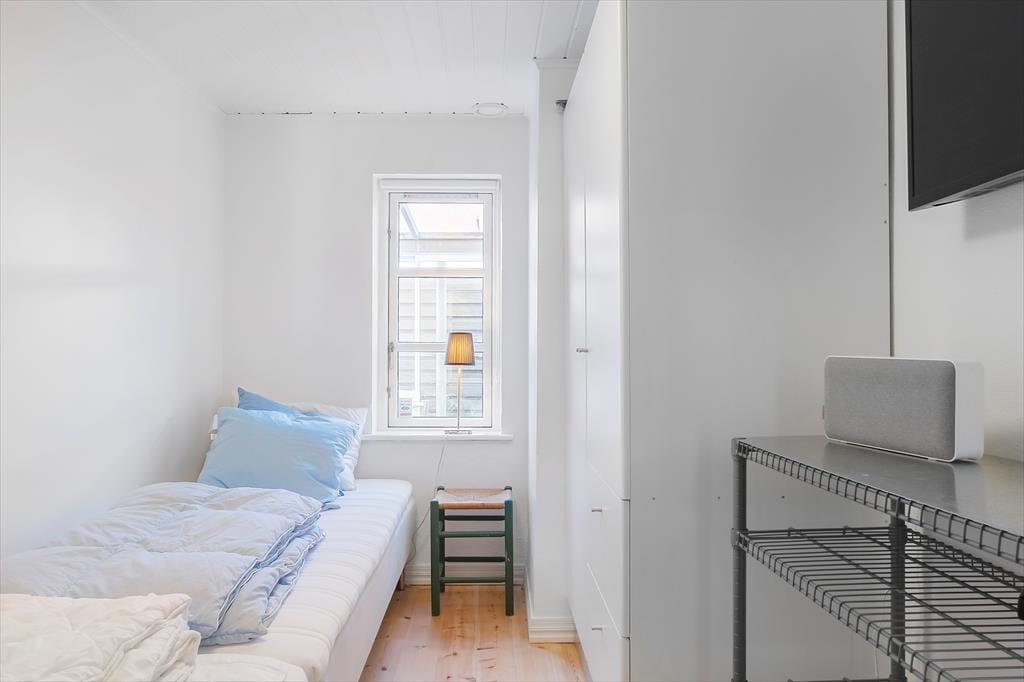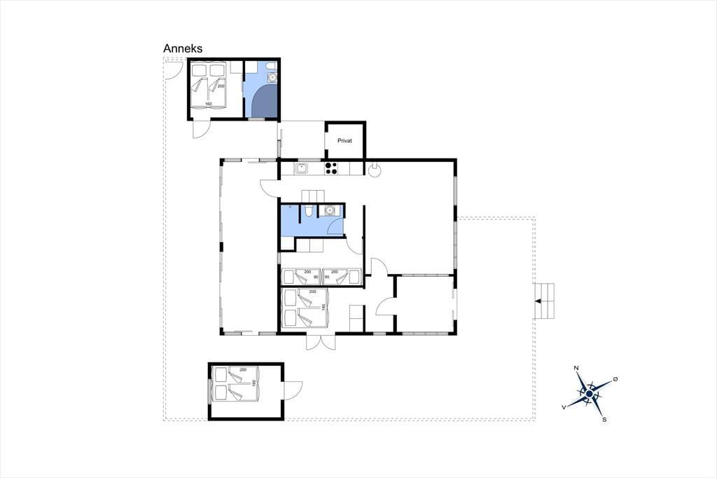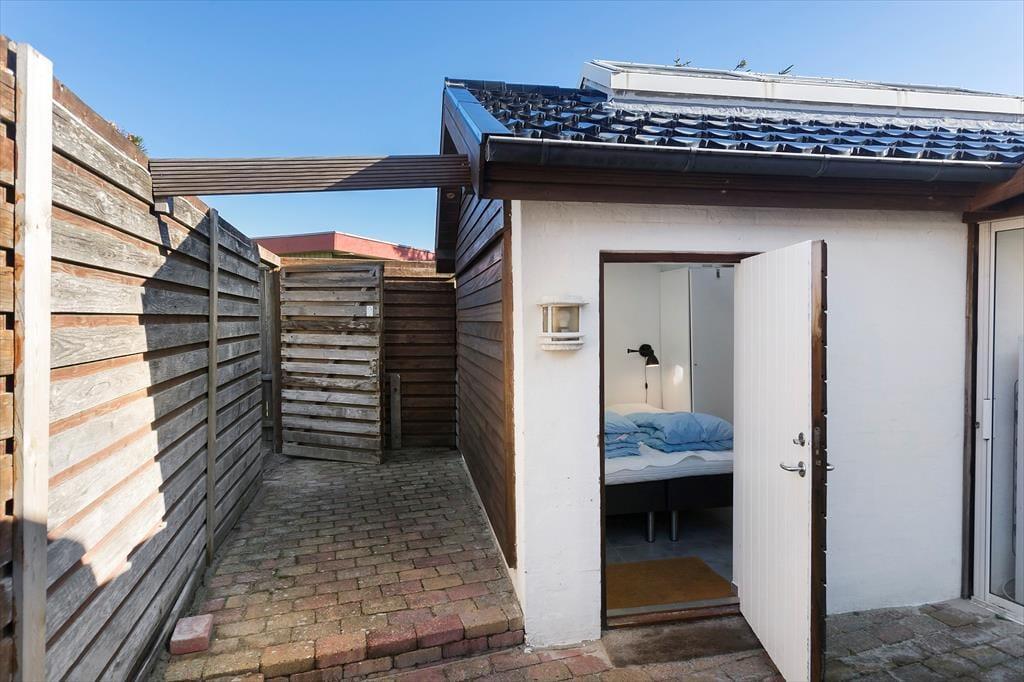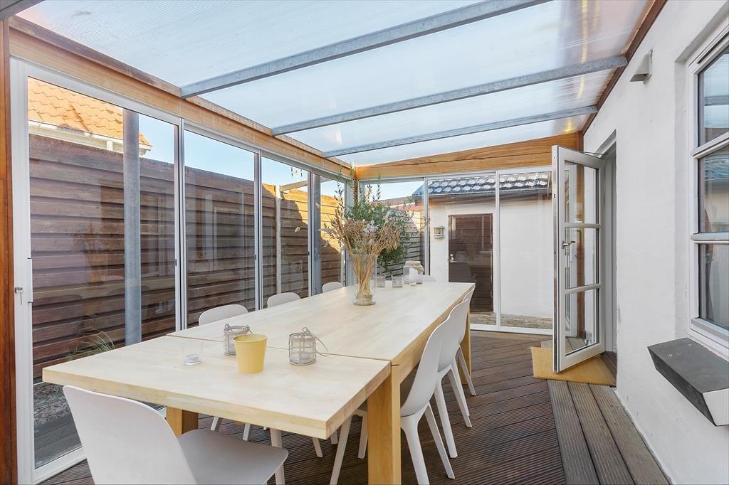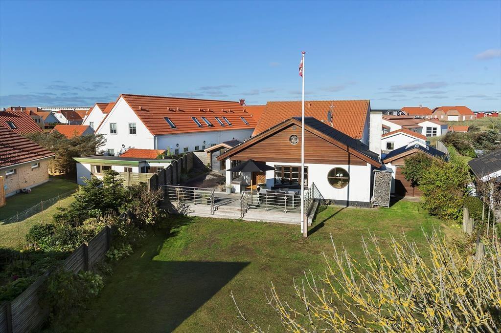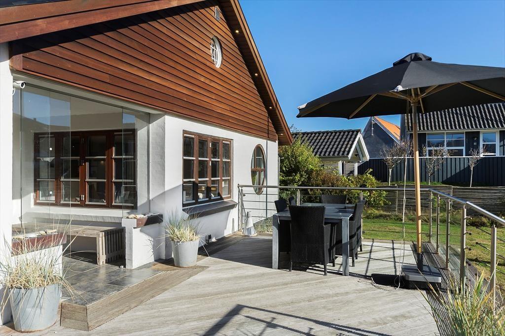 Der Wintergarten, welcher mit Esstisch und Lounge Möbeln eingerichtet ist, bildet einen perfekten Übergang zwischen den innen- und außen Arealen des Ferienhauses, weshalb Sie die langen Sommerabende hier wirklich ausnutzen können. Im Laufe des Tages können Sie auf den Terrassen ein Sonnenbad nehmen, welche der Fassade des Hauses folgen und etwas angehoben über der Rasenfläche liegen. Das ungestörte Grundstück ist mit einem Zaun zu allen Seiten abgeschlossen – und es ist wert bemerkt zu werden, dass Sie Ihren eigenen kleinen Weg zum Hauptweg Klitvejen haben, so dass Sie sich besonders leicht im Gebiet bewegen können.