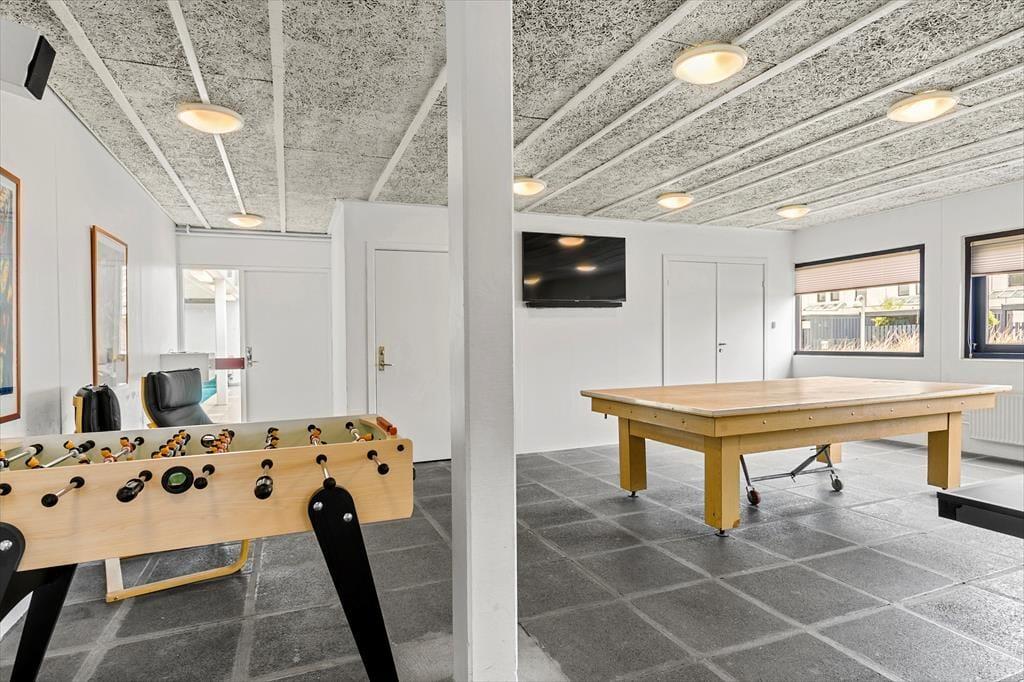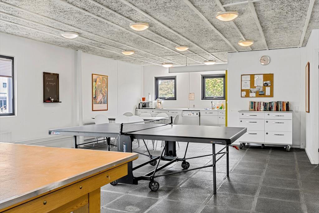 Die Reihenhaussiedlung Ferren glänzt mit einer Reihe verschiedener Gemeinschaftseinrichtungen, die von Ihnen frei genutzt werden können. Freuen Sie sich unter anderem auf einen Indoorpool oder auch auf einen Aktivitätsraum, in dem Sie mit Ihren Kindern Tischtennis und Tischkicker spielen können. Eine Sauna und eine Wäscherei können gegen Bezahlung genutzt werden. Darüber hinaus sorgen ein Tennisplatz, eine Bocciabahn und ein Spielplatz für Spiel und Spaß unter freiem Himmel. Von Ihrem Ferienhaus aus gelangen Sie im Nu in die attraktive Umgebung ringsum - beispielsweise in das üppig grüne Waldgebiet Blokhus Klitplantage und zum dort befindlichen Blokhus Gateway. Blokhus Gateway, das "Zentrum für aktive Naturerlebnisse", begeistert große und kleine Besucher mit tollen Wanderwegen, einem Trimm-Dich-Pfad, einem grandiosen Naturspielplatz, einem Pizzaofen, Grillhütten, einem Bolzplatz und vielem mehr. Binnen kurzer Zeit ist auch der pulsierende Ortskern des beliebten Badeortes Blokhus erreicht, in dem schöne Geschäfte und gute Restaurants zum Bummeln und Verweilen einladen. Selbstverständlich lockt auch stets der grandiose Badestrand von Blokhus, der natürlich ebenfalls problemlos zu Fuß erreichbar ist.