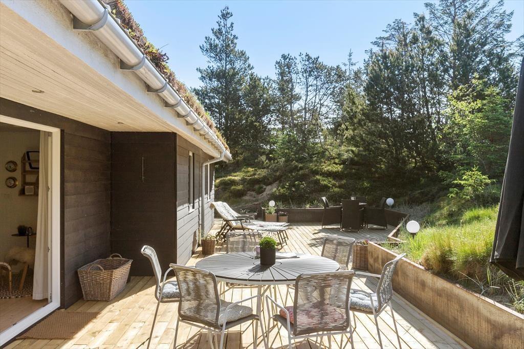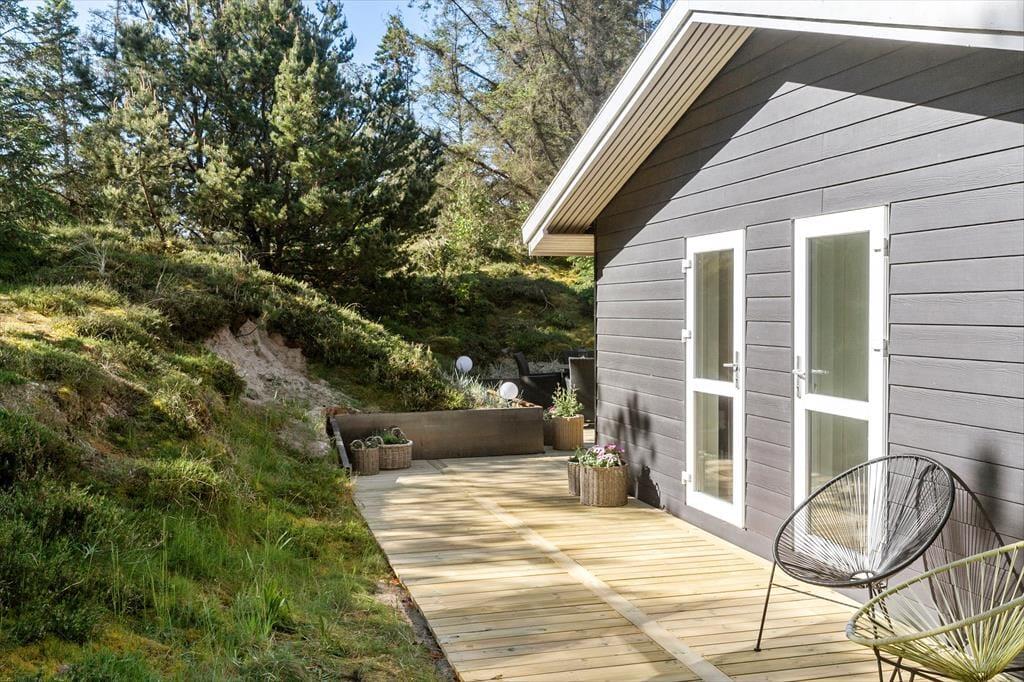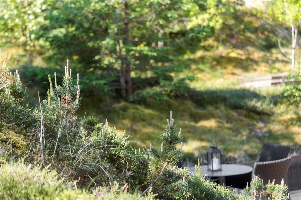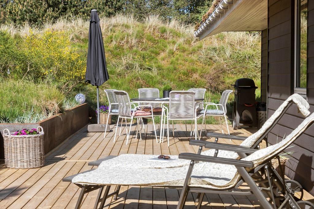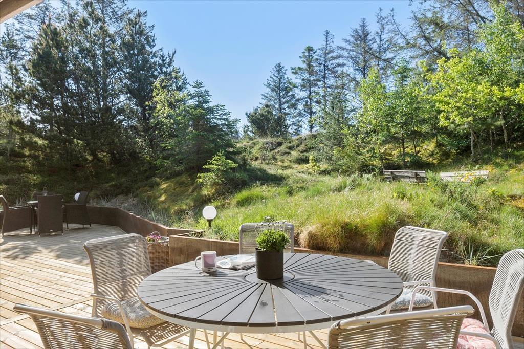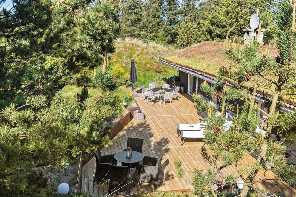 Unter freiem Himmel werden Sie feststellen, dass es von Vorteil ist, in einer Senke zu wohnen. Die südlich und östlich des Hauses liegenden Terrassen sind meist gut vor Wind geschützt und für Nachbarn und Spaziergänger nicht einsehbar. Sie selber blicken hingegen ins Grüne und genießen den Duft der Nadelbäume, der Heide und der anderen Wildpflanzen, während Sie sich in aller Ruhe auf den Gartenmöbeln und Liegestühlen entspannen.