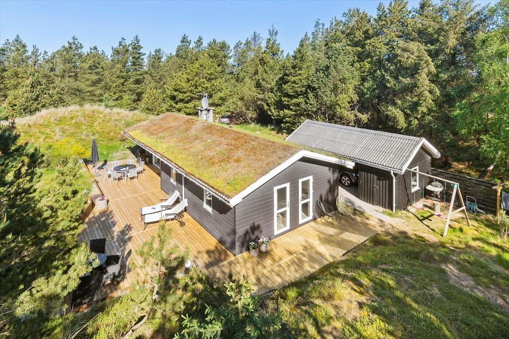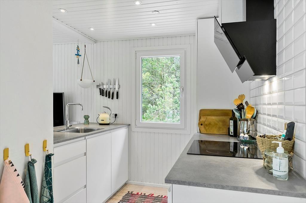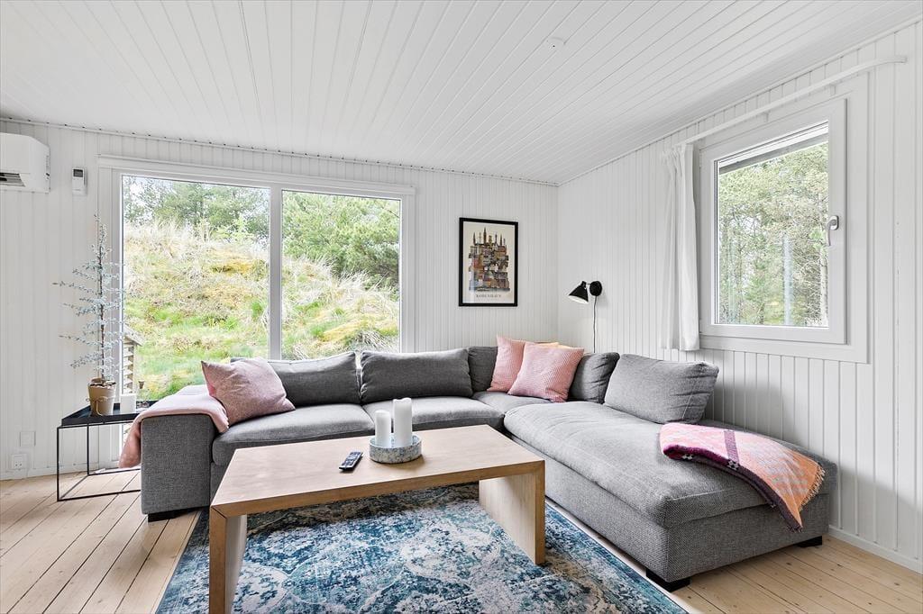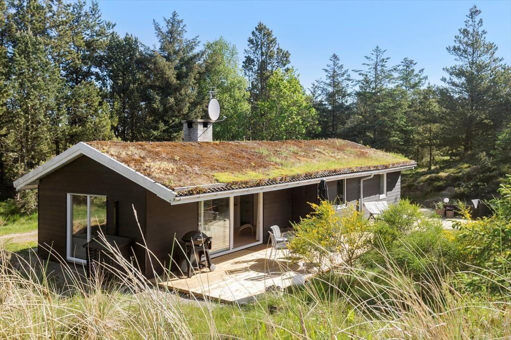 Mit seinem begrünten Dach und der dunklen Holzfassade fügt sich das Haus perfekt in die Natur ringsum ein. Das Hausinnere präsentiert sich nach einer gelungenen Renovierung im Jahr 2020 angenehm schlicht, hell und luftig. Die Renovierung und Modernisierung umfasste unter anderem das gute Badezimmer und die schöne Küche. Letztgenannte ist offen mit dem Wohnraum verbunden. Beim Wohnraum handelt es sich um einen ansprechenden Aufenthaltsraum mit einem Kaminofen, einem Flachbild-TV und großen Fenstern, die einen Ausblick auf das Naturgrundstück gewähren. Die Möblierung verleiht dem Raum eine schön warme Wohnatmosphäre - kurzum genau das, was man im Urlaub benötigt. Die drei Schlafzimmer sind mit je einem Doppelbett eingerichtet.