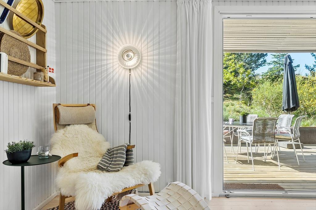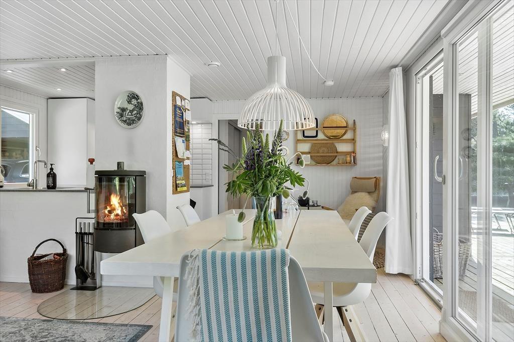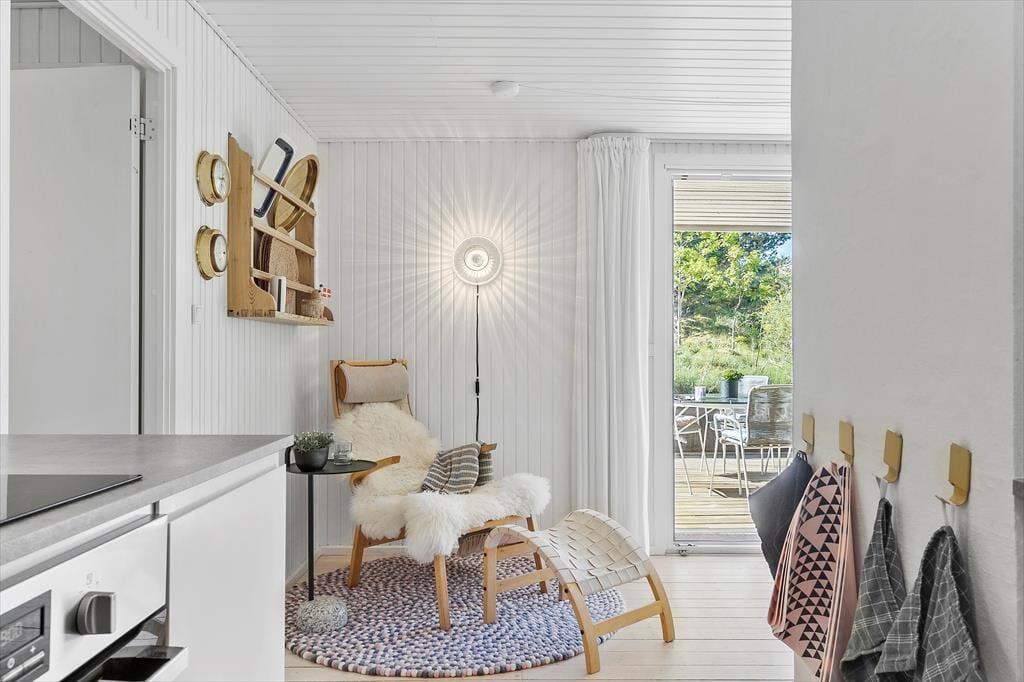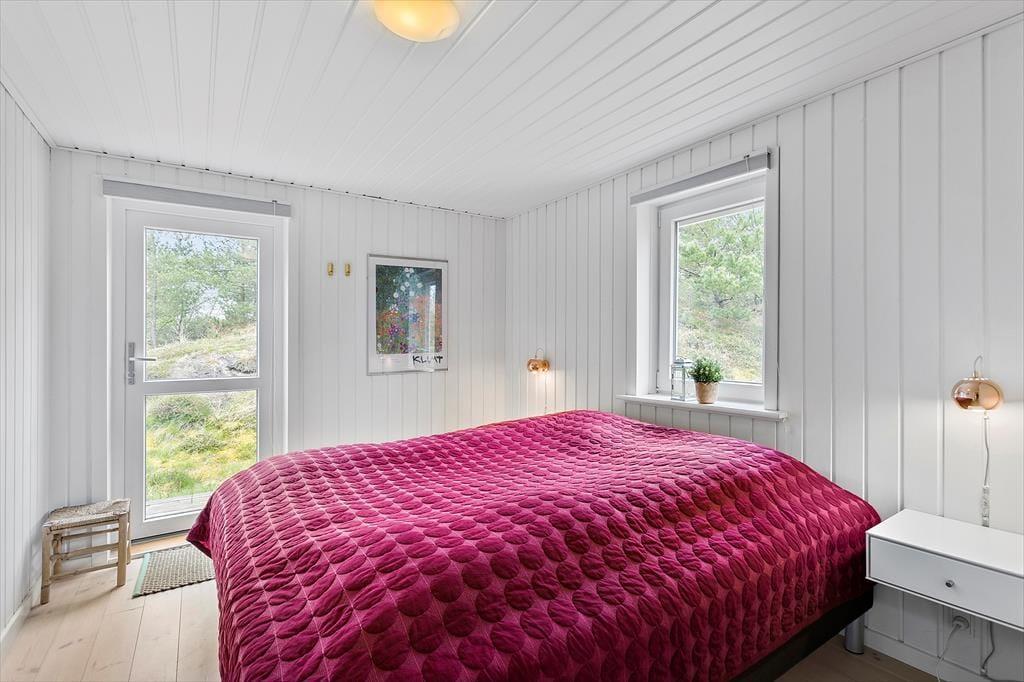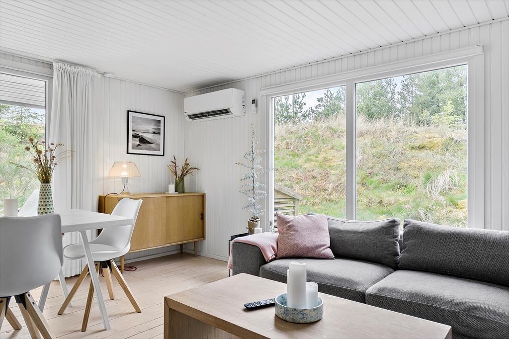 Mit seinem begrünten Dach und der dunklen Holzfassade fügt sich das Haus perfekt in die Natur ringsum ein. Das Hausinnere präsentiert sich nach einer gelungenen Renovierung im Jahr 2020 angenehm schlicht, hell und luftig. Die Renovierung und Modernisierung umfasste unter anderem das gute Badezimmer und die schöne Küche. Letztgenannte ist offen mit dem Wohnraum verbunden. Beim Wohnraum handelt es sich um einen ansprechenden Aufenthaltsraum mit einem Kaminofen, einem Flachbild-TV und großen Fenstern, die einen Ausblick auf das Naturgrundstück gewähren. Die Möblierung verleiht dem Raum eine schön warme Wohnatmosphäre - kurzum genau das, was man im Urlaub benötigt. Die drei Schlafzimmer sind mit je einem Doppelbett eingerichtet.
