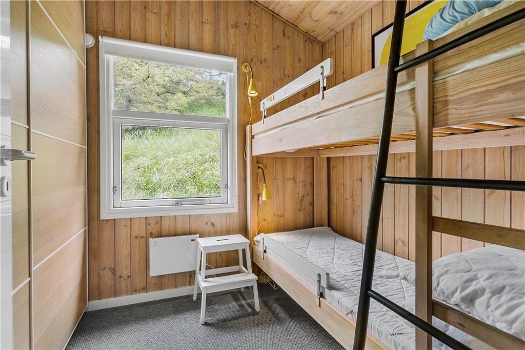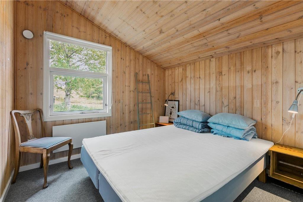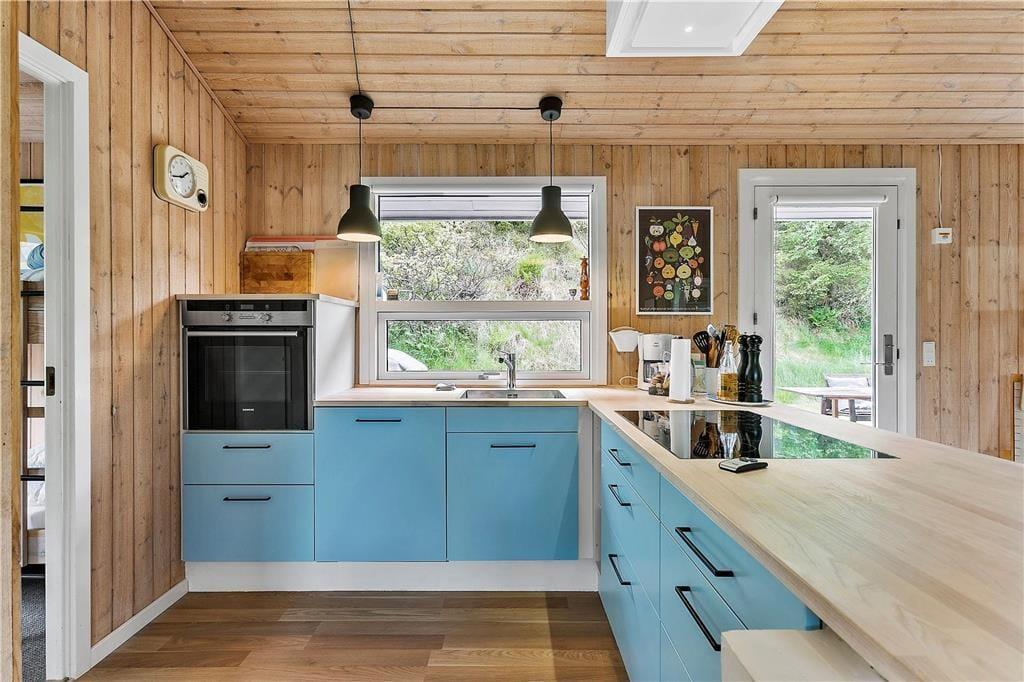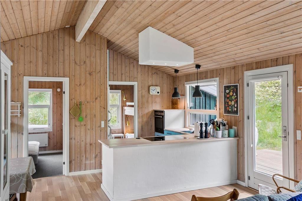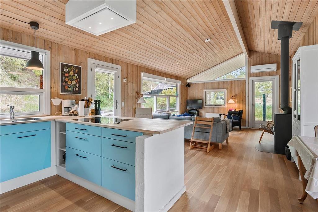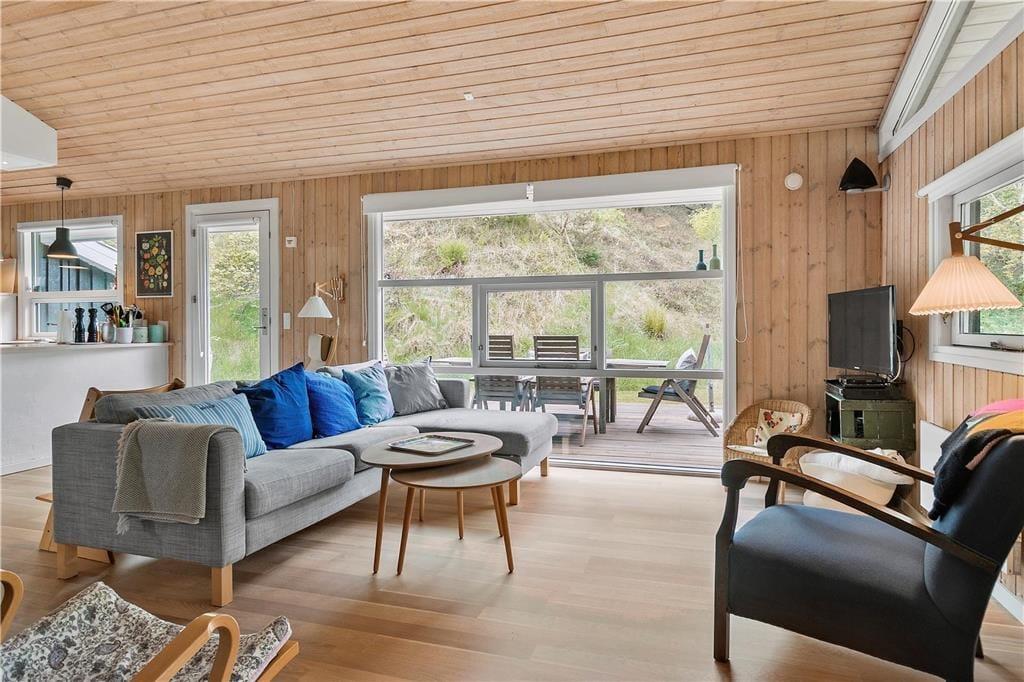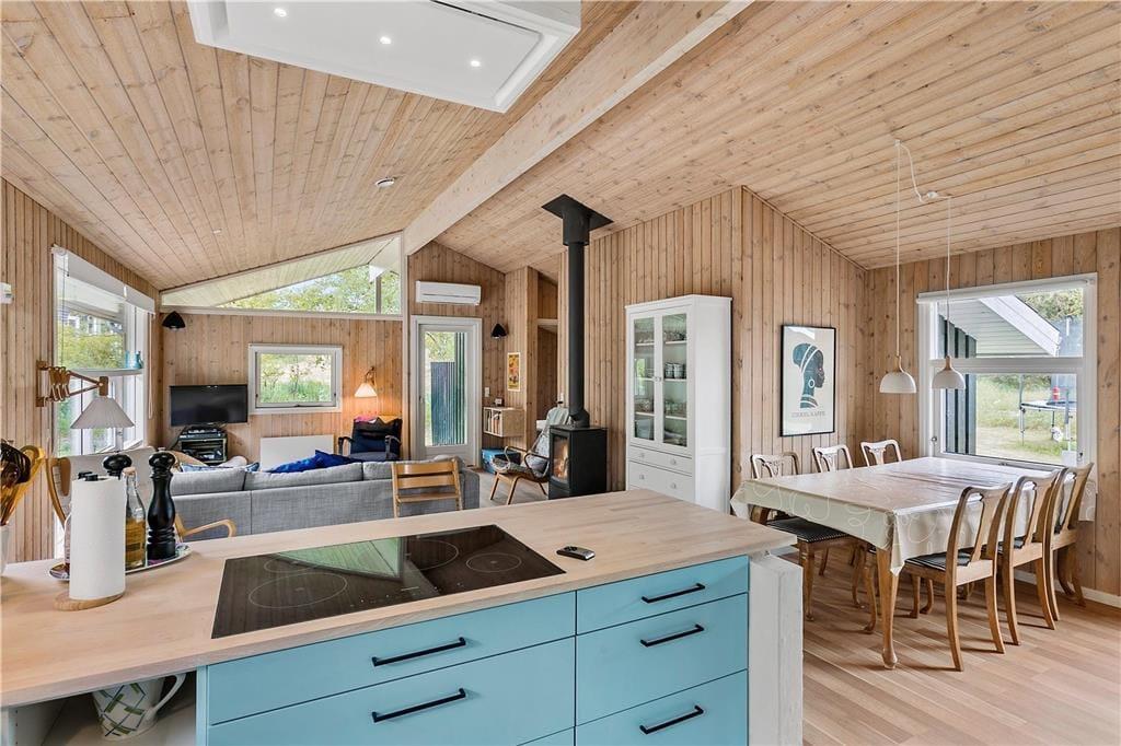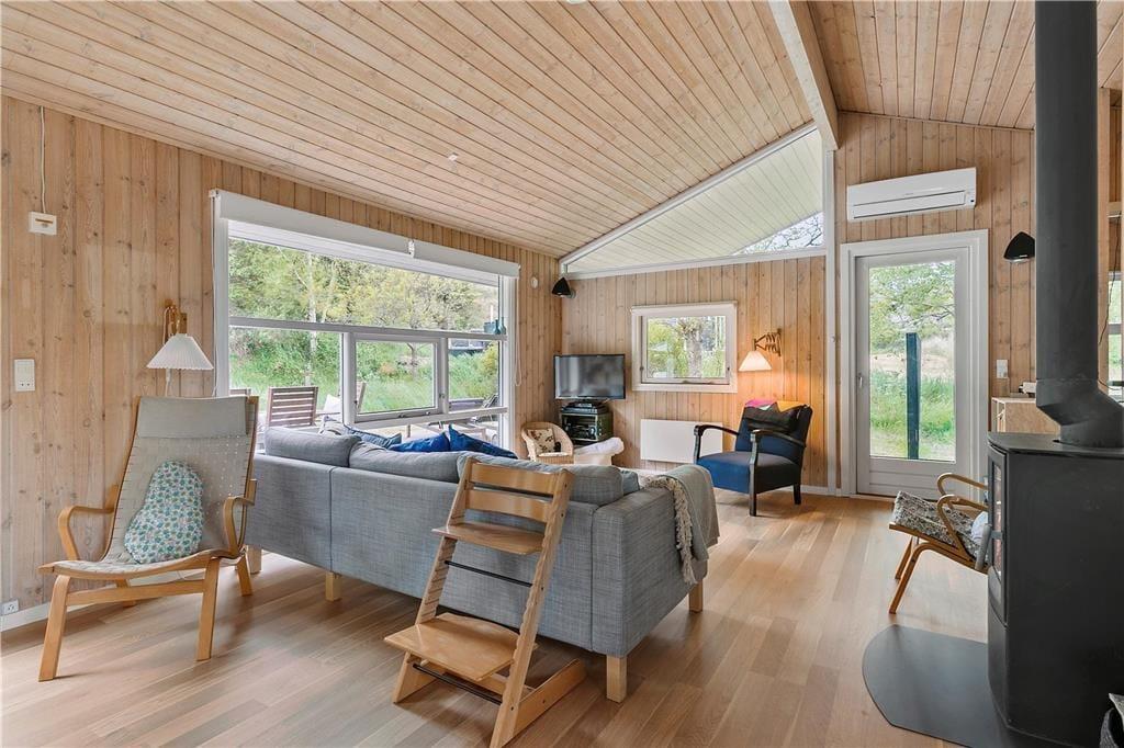 Dank der hellen und luftigen Wohnatmosphäre werden Sie sich im Hausinneren schnell heimisch und willkommen fühlen. Die zahlreichen Fenster des Wohnraumes sorgen für einen schönen Lichteinfall und eine Aussicht auf das grüne Grundstück. Die wohl durchdacht ausgewählten Möbelstücke und die attraktive, offene Küche verleihen diesem Raum seinen ganz eigenen Charakter. Dank der Wärmepumpe und des romantisch knisternden Kaminofens erwarten Sie gemütliche Stunden an kühleren Abenden. Sobald die Sommersonne vom Himmel lacht, stellen Sie einfach die Terrassentüren weit auf und lassen die herrlich frische Seeluft durch das Haus strömen. Zur Wohnfläche zählen auch ein attraktives Badezimmer und drei gute Schlafräume, von denen zwei mit je einem Doppelbett eingerichtet sind. Im dritten Schlafraum steht ein Etagenbett für Sie bereit.