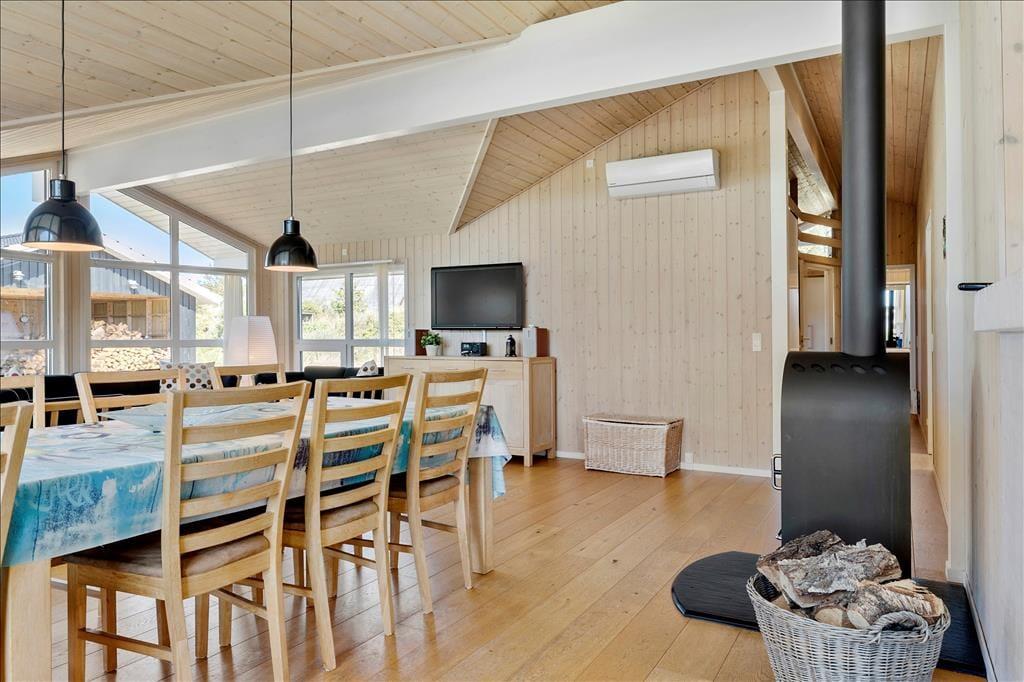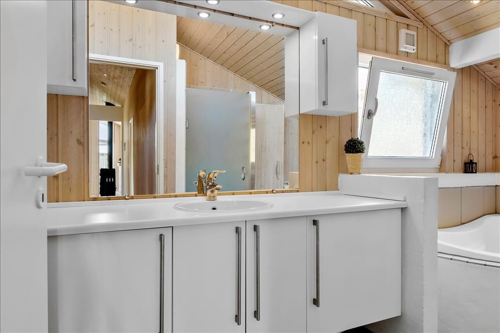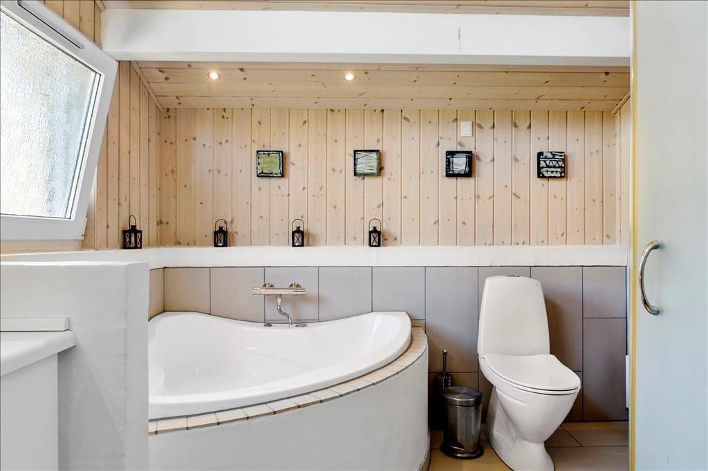 Alle Räume des 103 m2 großen Ferienhauses sind hell und einladend – nicht zuletzt der Aufenthaltsraum, wo Wohnzimmer und Küche offen miteinander verbunden sind. Hier sorgen große Fensterfronten für einen herrlichen Lichteinfall, und ein Kaminofen steht bereit um sowohl Wärme wie auch Gemütlichkeit zu verbreiten, wenn das Wetter zur Entspannung mit einem guten Buch oder einem spannenden Film auf der Couch einlädt. Letztgenanntes können Sie passend auf dem TV im Wohnzimmer finden, denn dieses hat sowohl Parabolantenne wie auch Chromecast. Vom Aufenthaltsraum haben Sie Zugang zu einem großen Schlafboden, darüber hinaus bietet der funktionelle Bauplan einen Flur mit Waschmaschine und Trockner, zwei Badezimmer und drei Schlafzimmer. Besonders das eine Badezimmer verdient es hervorgehoben zu werden, denn hier gibt es einen Whirlpool und Sauna, die das Ferienerlebnis zu einem Wellness Erlebnis in Reinkultur machen.