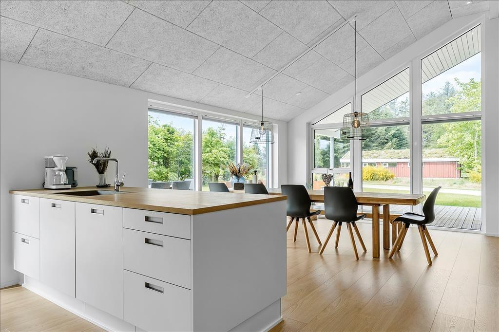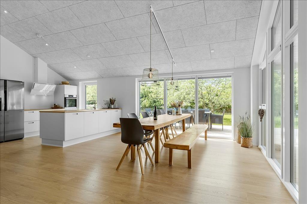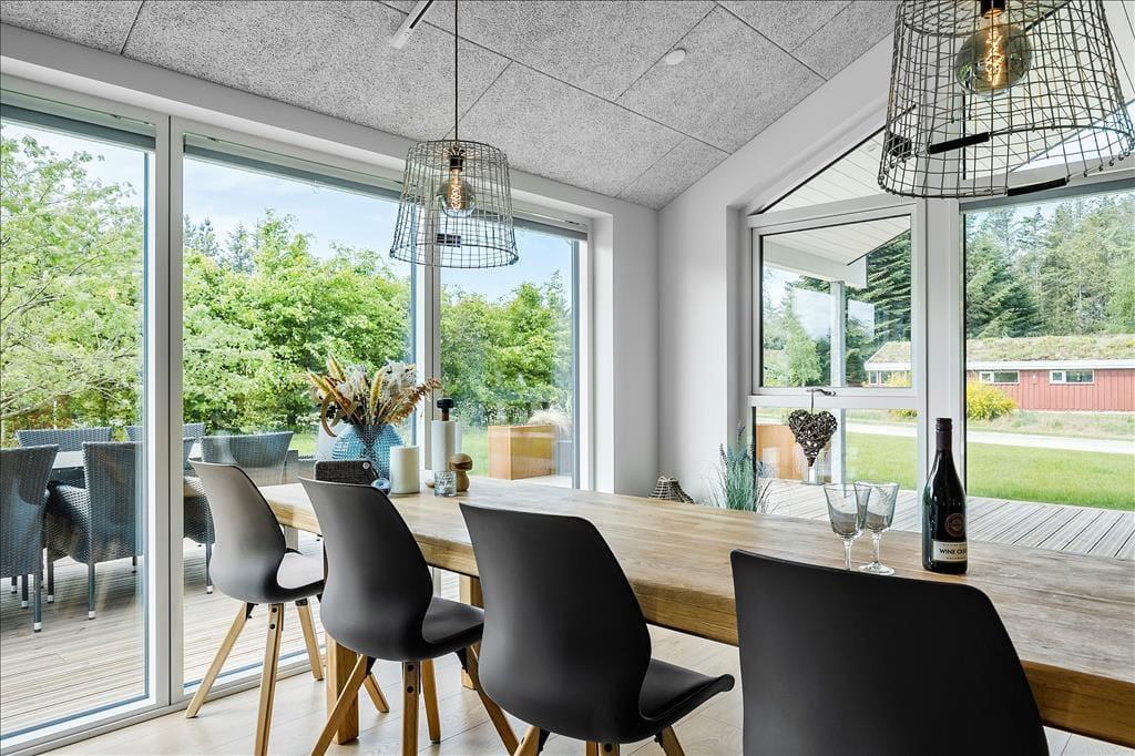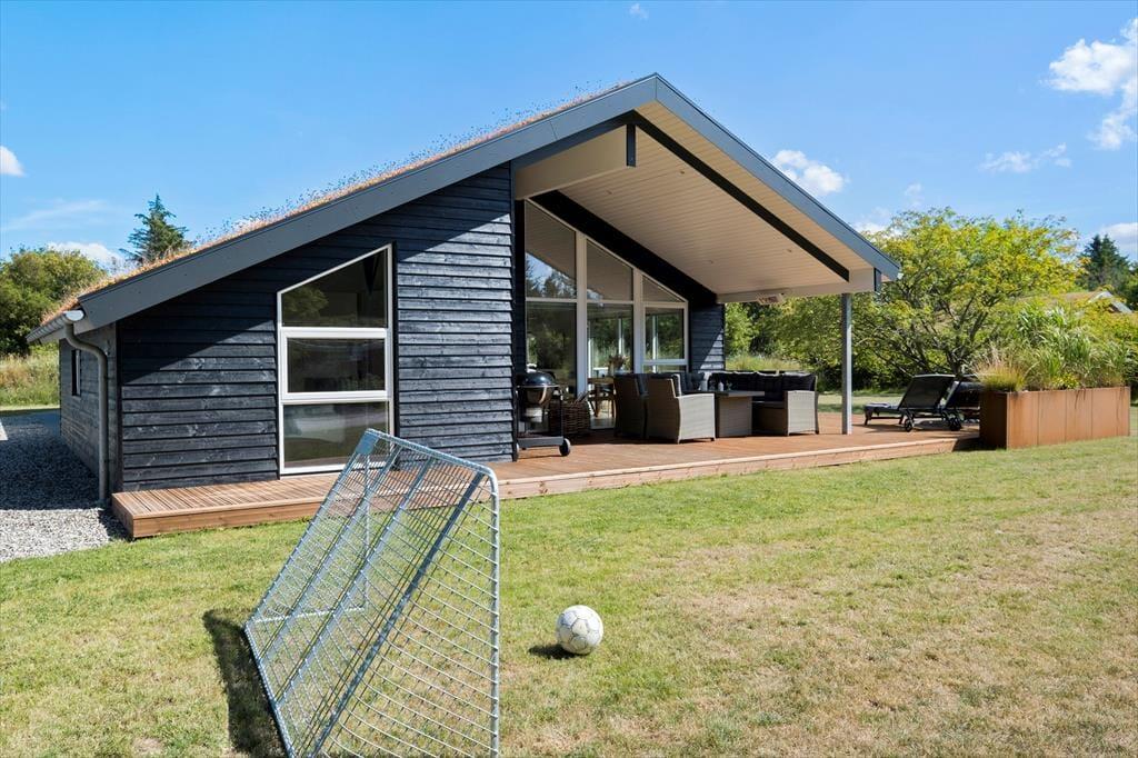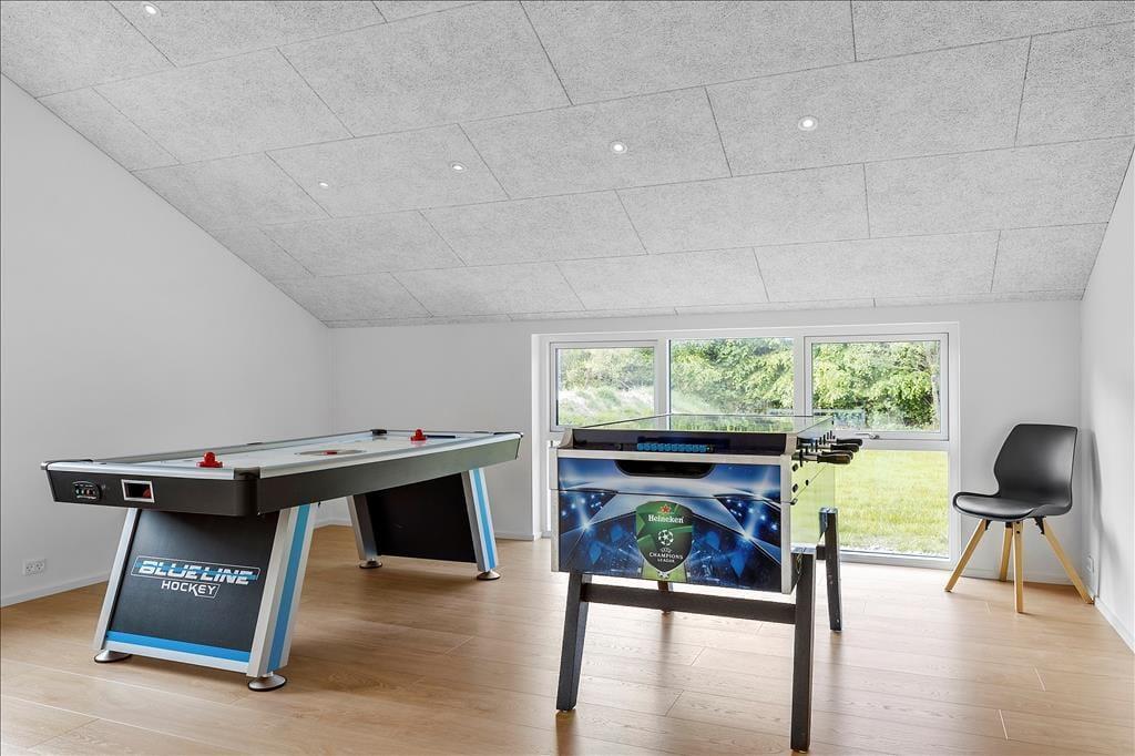 Das Ferienhaus, welches 2020 erbaut wurde, ist ein richtiges Familienhaus, und mit ganzen 149 m2 gibt es vielfältige Möglichkeiten die Großeltern oder eine andere befreundete Familie mit Kindern mit in die Ferien einzuladen. Alles in allem kann das Ferienhaus 10 Personen beherbergen, die sich in der Nacht auf fünf Schlafzimmer verteilen können, wovon die drei mit Doppelbetten und die anderen mit jeweils 2 Einzelbetten eingerichtet sind. Zwei gute Badezimmer gehören auch zum Bauplan sowie der vorgenannte Aktivitätsraum, der mit Airhockey, Tischfußballspiel und TV mit WII ausgestattet ist. Hier können Spielkinder jeden Alters darum wetteifern der unbestrittene Meister der Ferien zu werden, und wenn der Gewinner gefunden ist, können Sie sich im Wohnzimmer um den Esstisch zusammenfinden und eine gute Mahlzeit genießen, oder Sie machen sich es in der Sofaecke gemütlich. Das Wohnzimmer liegt in offener Verbindung mit der flotten Küche, so dass Sie während der Zubereitung des Essens an dem gemütlichen Familienleben Teil haben können.