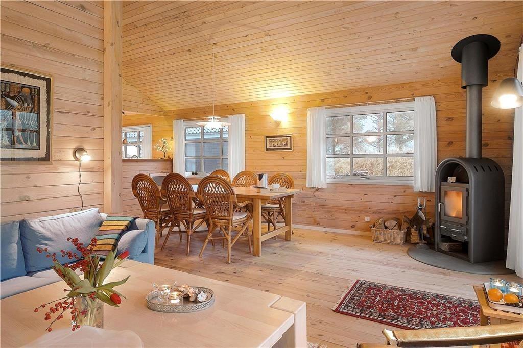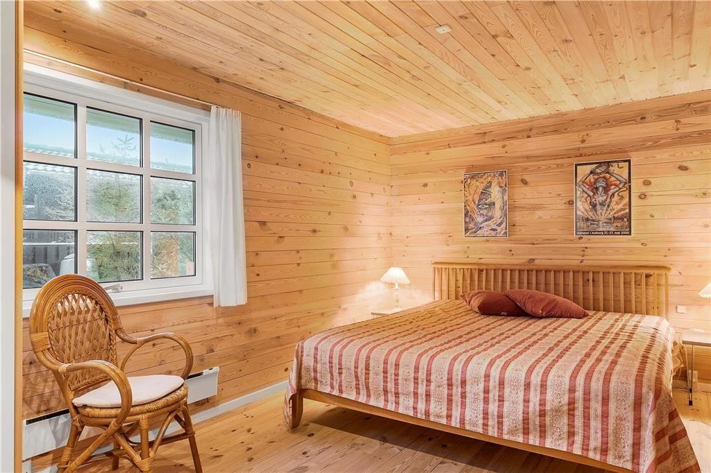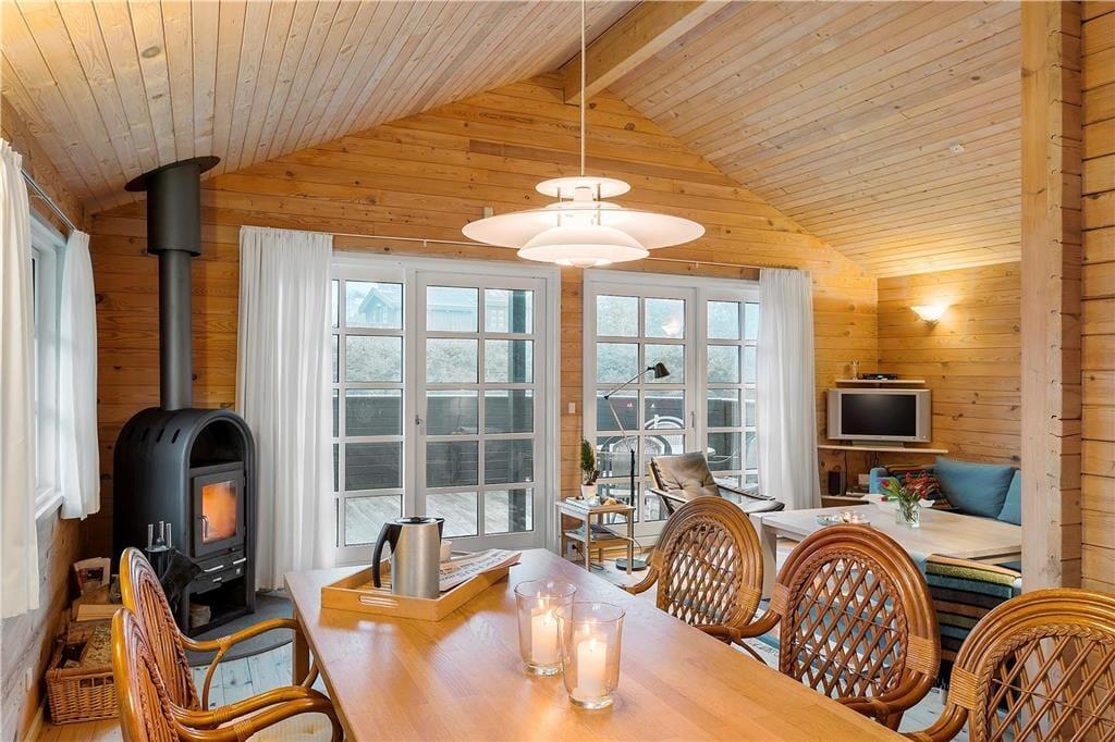 Hier auf dieser Adresse liegt ein schönes und klassisch ausgeformtes Holzferienhaus von 92 m2. Innerhalb des Ferienhauses steht die Gemütlichkeit an erster Stelle, da die natürlichen Holzwände, schrägen Decken und Sprossenfenster den Räumen eine außerordentlich charmierende Note verleihen. Das Interieur ist sehr hübsch, so dass Sie sofort Lust verspüren sich rund um den Esstisch zu versammeln oder es sich in der Couchecke bequem zu machen – eventuell mit Feuer im Kaminofen, wenn das Wetter danach ist. Ist es kalt, gibt es auch die Möglichkeit sich in der Sauna zu entspannen, welche sich in Verlängerung des grossen und gut eingerichteten Badezimmers befindet. Wenn es Zeit ist ins Bett zu gehen, können alle sich zur Ruhe begeben in drei Schlafzimmern, welche alles in allem über sechs Schlafplätze verfügen.