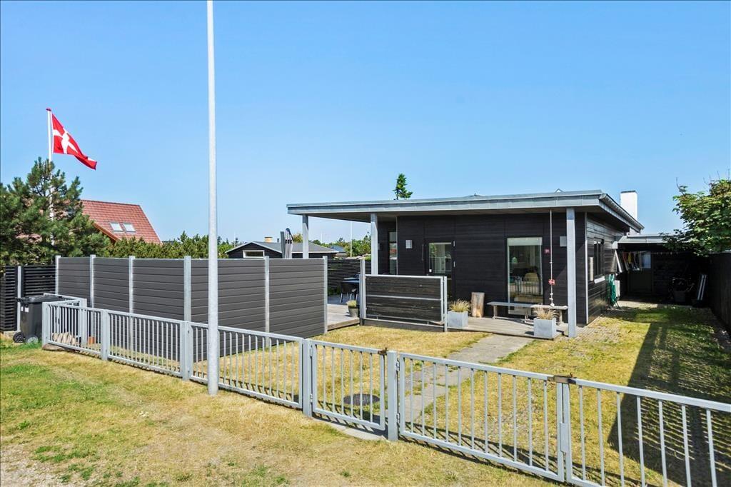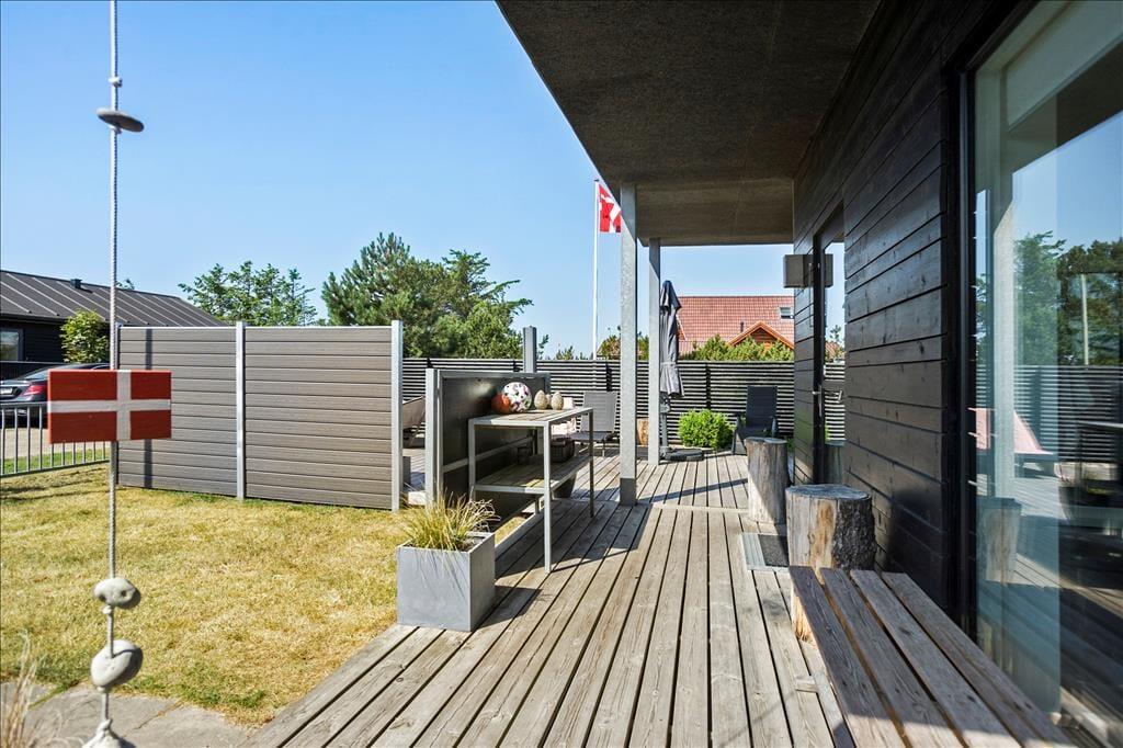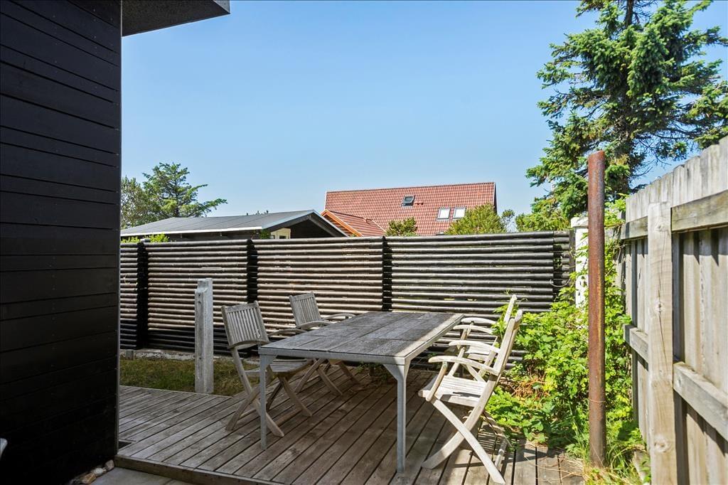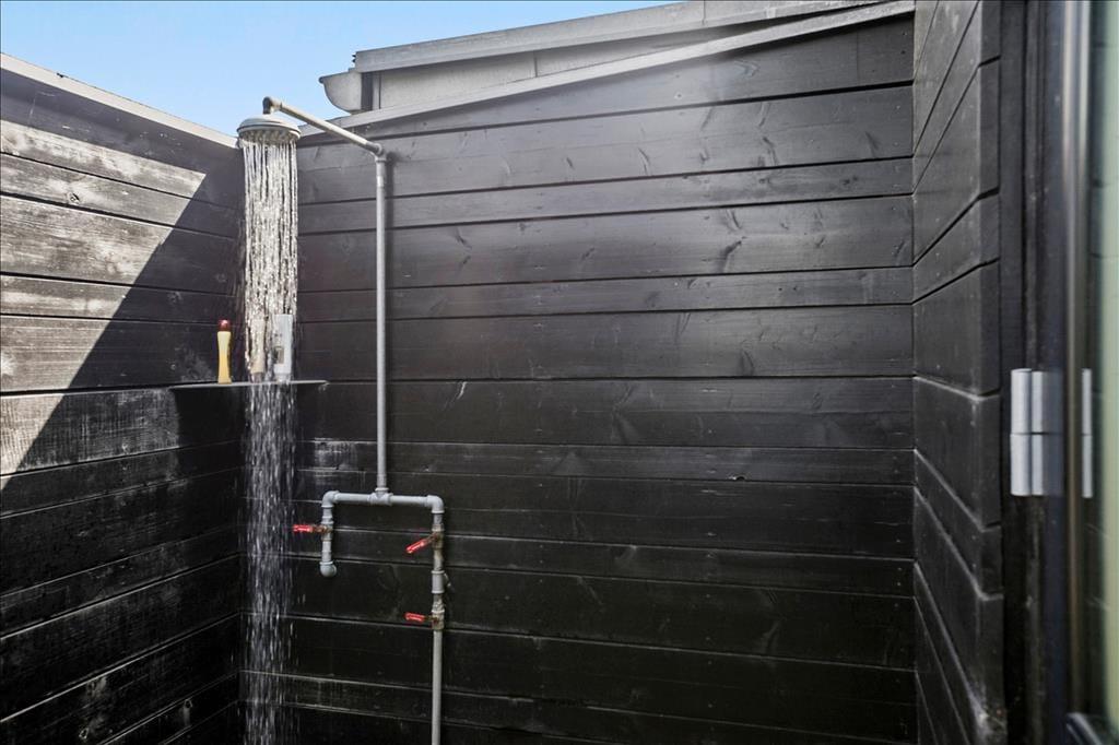 Wenn die Sommersonne vom blauen Himmel scheint, ist das Terrassenmilieu des Ferienhauses genau die richtige Stelle um sich aufzuhalten. Es gibt sowohl überdachte wie auch offene Sitzplätze, und dank der Abschirmung fühlt es sich beinahe so an, als ob Sie in einem geschossenen Sonnenhof sitzen würden, weshalb Sie sich in dieser ungestörten Umgebung herrlich sonnen und Ihren Lunch zu sich nehmen können. Mit komfortablen Gartenmöbeln, Liegestühlen, Grill und Sonnenschirm haben Sie es sicher gut und behaglich, und draußen vor dem Badezimmer befindet sich eine abgeschirmte Außen Dusche, wo Sie bequem den Sand und das Salzwasser vom Körper abspülen können, wenn Sie von der Strandtour nach Hause kommen.