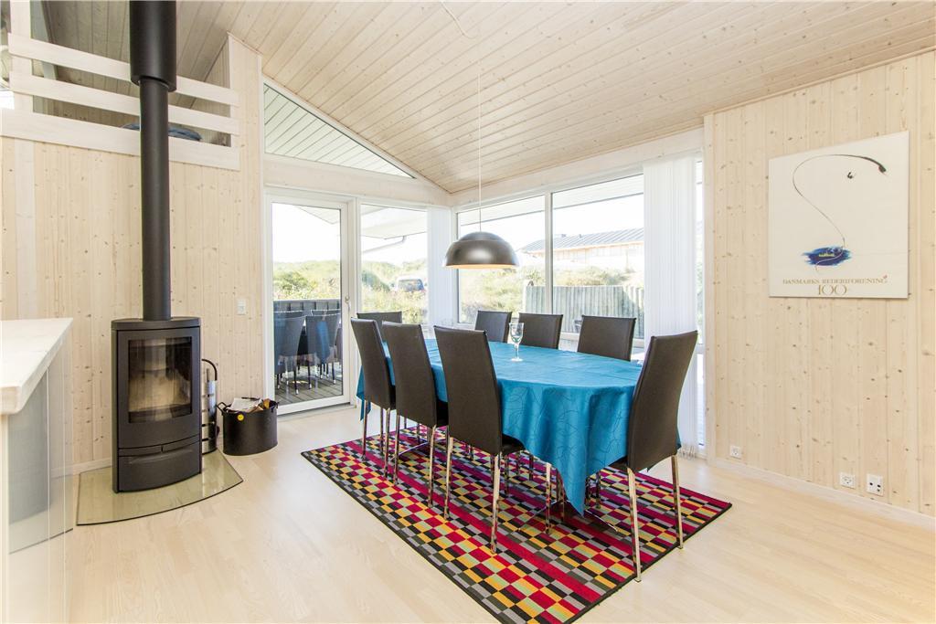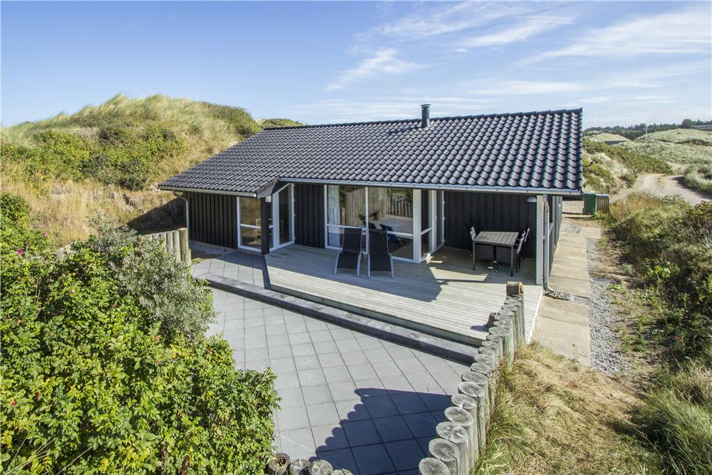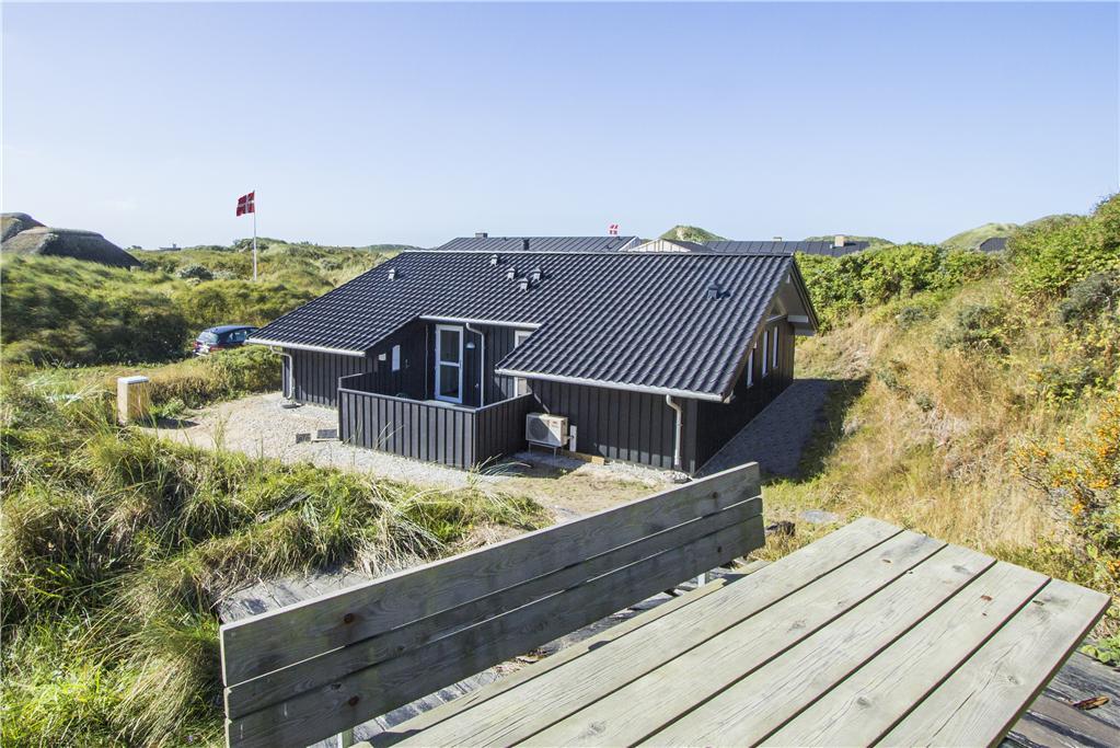 Das schöne Dünengrundstück ist mit Dünengras und Heidebüschen bedeckt, die es im barschen Klima mit Sand, Salz und Wind gut aushalten. Windgeschützt steht das Haus durch einen Dünenhügel. Von einer Bank lassen sich der dänische Sommer und das Rauschen der Nordsee unweit des Hauses genießen. Gemütliche Stunden tagsüber und abends lassen sich auf den beiden Terrassen nach Süden und Westen verbringen.