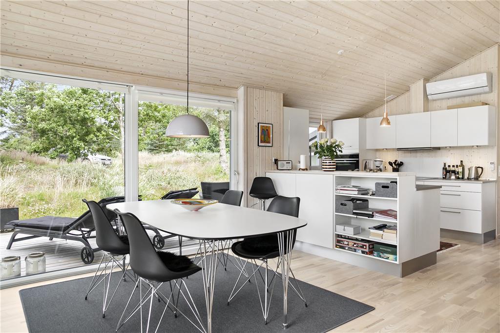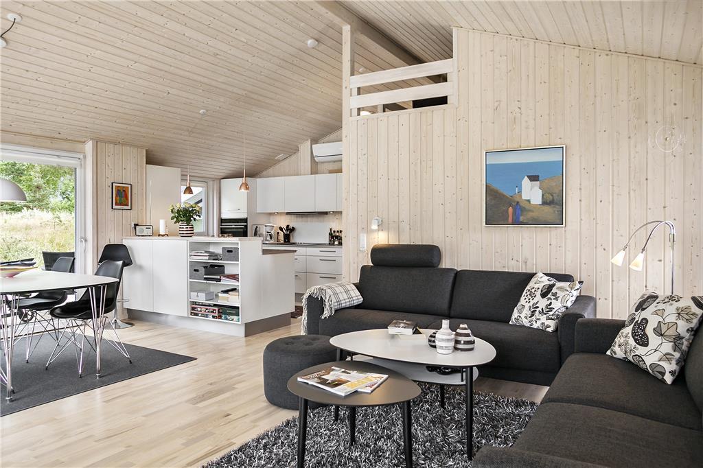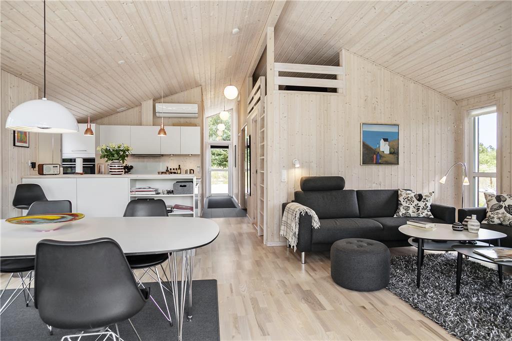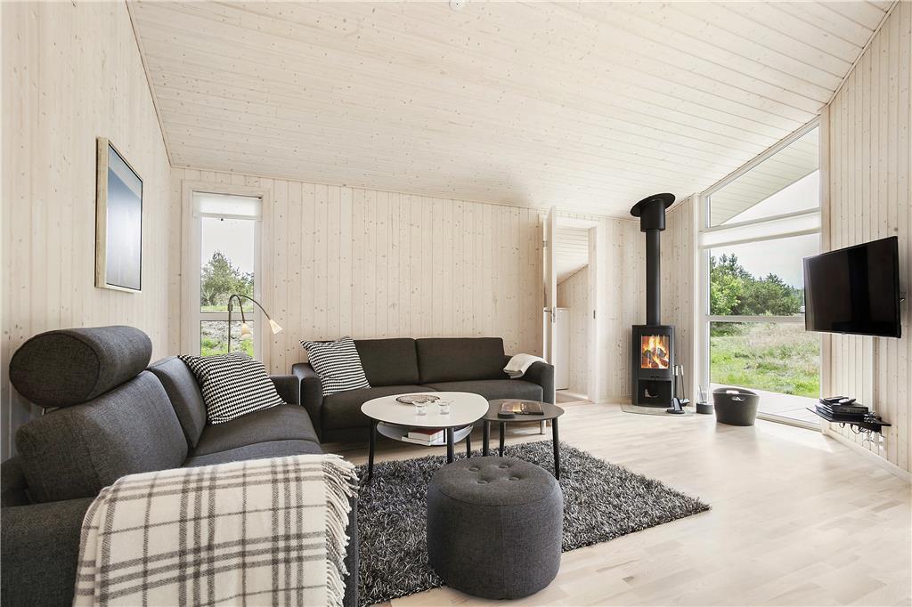Stell dir vor, du betrittst ein Haus, in dem Ruhe und Licht verschmelzen – genau so fühlst du dich, sobald du durch die Tür von Maxvej 9 gehst. Die hohe Decke verleiht Luftigkeit und Raum, und die Panoramafenster lassen Sonnenstrahlen direkt ins Herz des Wohnbereichs. Die offene Küche ist mit dem Wohnzimmer verbunden, sodass du beim Gemüse schneiden am Tisch dennoch Teil der Gespräche auf dem Sofa sein kannst. Der Kaminofen steht bereit, um an kühleren Abenden Wärme zu spenden, während ihr euch mit einem guten Buch oder Film entspannt und das Knistern des Feuers genießt. Jeder Raum ist mit Liebe zum Detail und hellem Holz eingerichtet – sofort fühlt man sich willkommen.