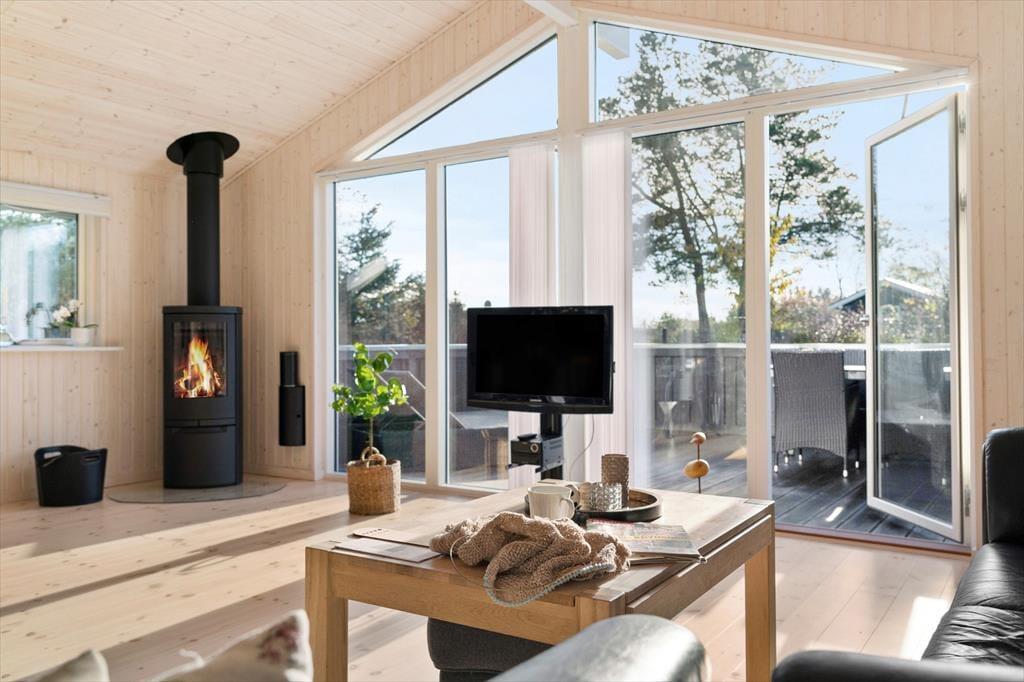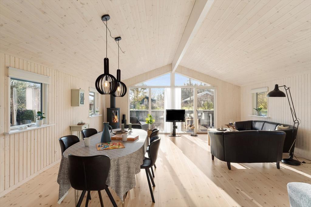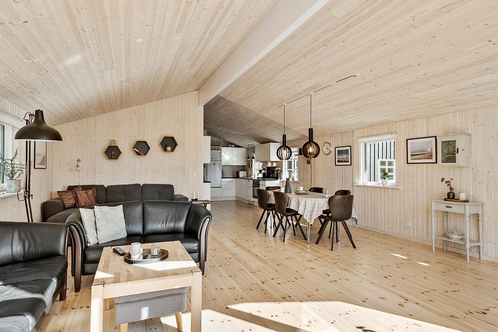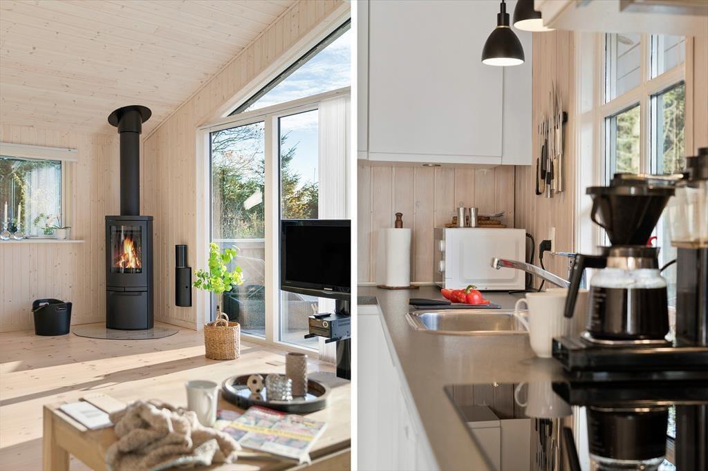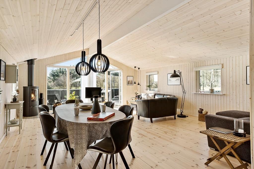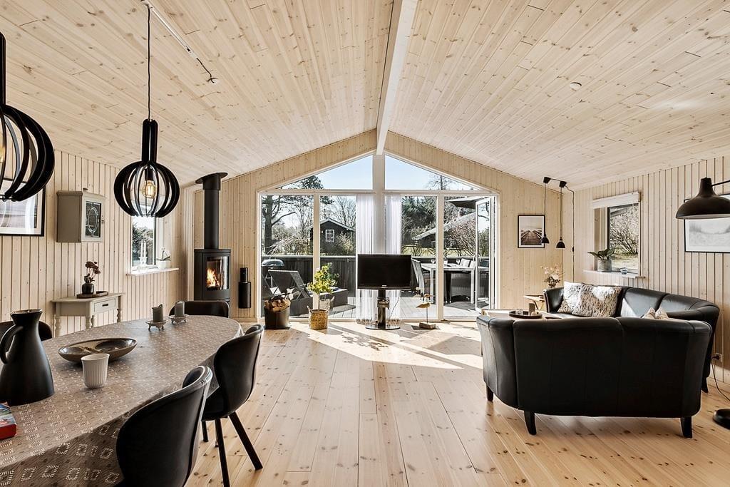 Im Inneren wirst du von einer hellen und offenen Atmosphäre empfangen – mit hohen Decken und großen Fensterfronten, die die Natur direkt ins Haus holen. Das Wohnzimmer ist offen mit der Küche und dem Essbereich verbunden, und das gesamte Wohnambiente lädt zu gemeinsamen Kochabenden, Brettspielen und entspannten Stunden vor dem Kaminofen ein. Dieses Ferienhaus strahlt Wärme und Zusammengehörigkeit aus – und der Alltag rückt sofort in den Hintergrund. Die Einrichtung ist schlicht und funktional mit persönlichen Details, die dem Haus Charakter und Seele verleihen. Hier gibt es Platz für gemeinsame Erlebnisse und ruhige Momente – egal, ob du mit Kindern reist oder als Paar eine Auszeit suchst.
