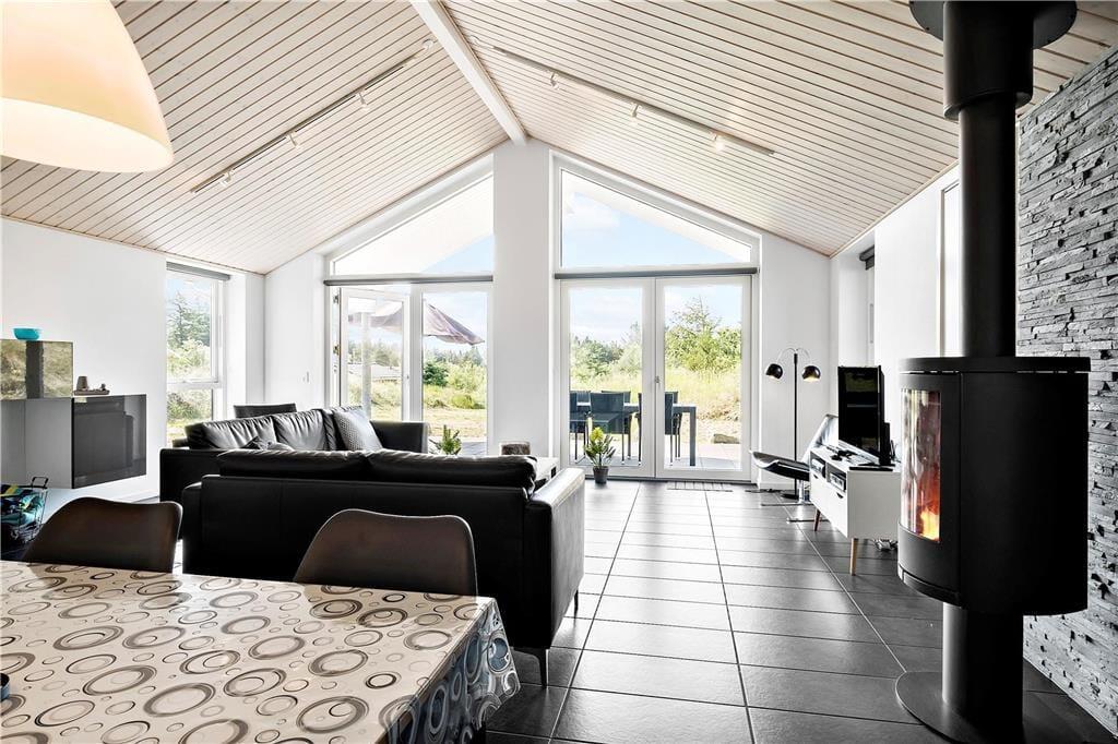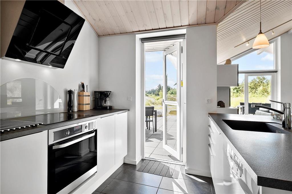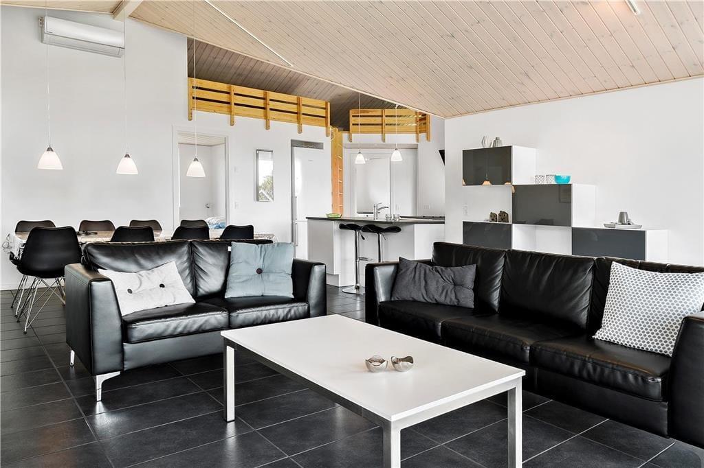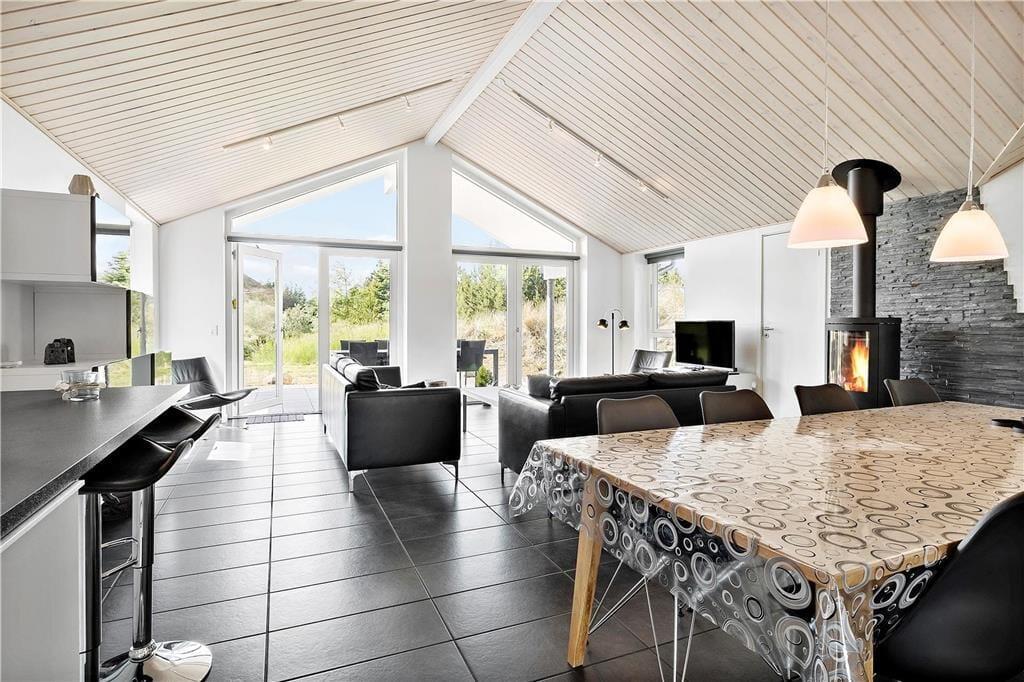 Beim Betreten wirst du von einem hellen und offenen Wohnbereich empfangen, der durch große Fenster für viel natürliches Licht sorgt. Die hohe Decke vermittelt ein Gefühl von Weite, und der gemütliche Kaminofen lädt nach einem langen Tag am Strand zum Entspannen ein. Der offene Küchen-/Essbereich bietet genügend Platz, um gemeinsam zu kochen, Brettspiele zu spielen oder einfach ein gutes Buch zu lesen. Die schönen Materialien und die stilvolle Einrichtung schaffen eine angenehme und entspannte Atmosphäre, die es dir leicht macht, dich wie zu Hause zu fühlen.