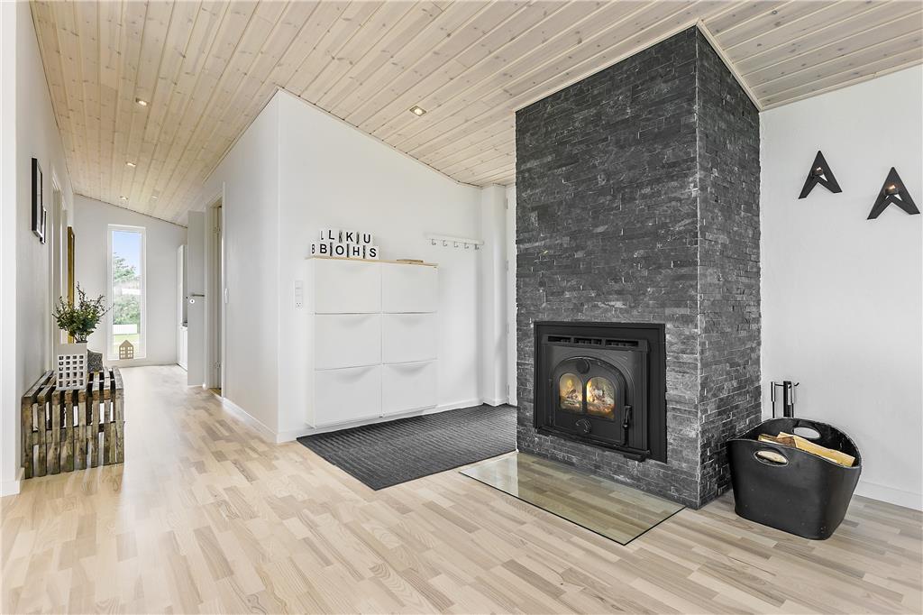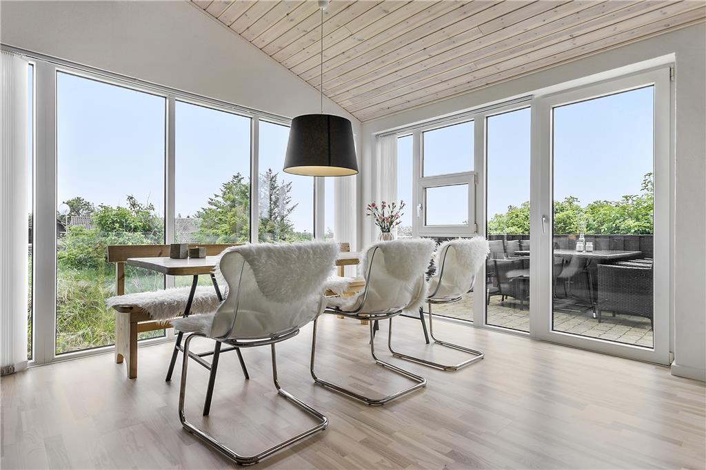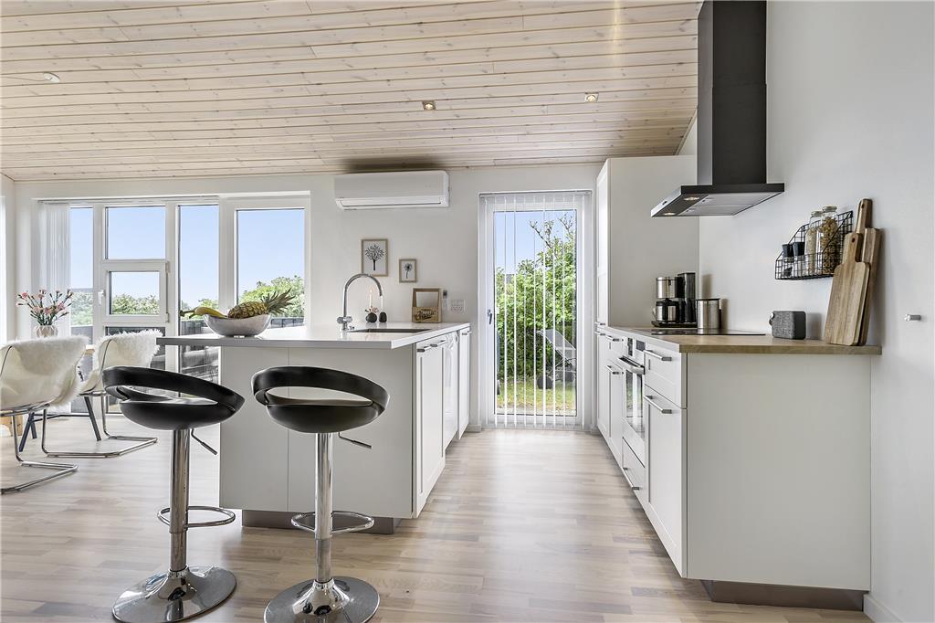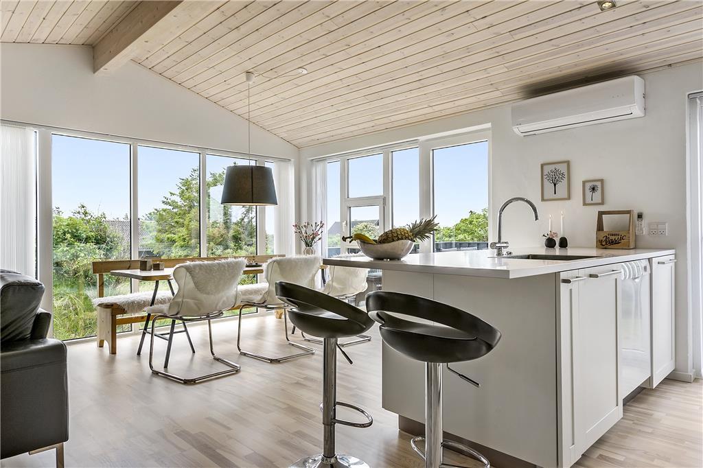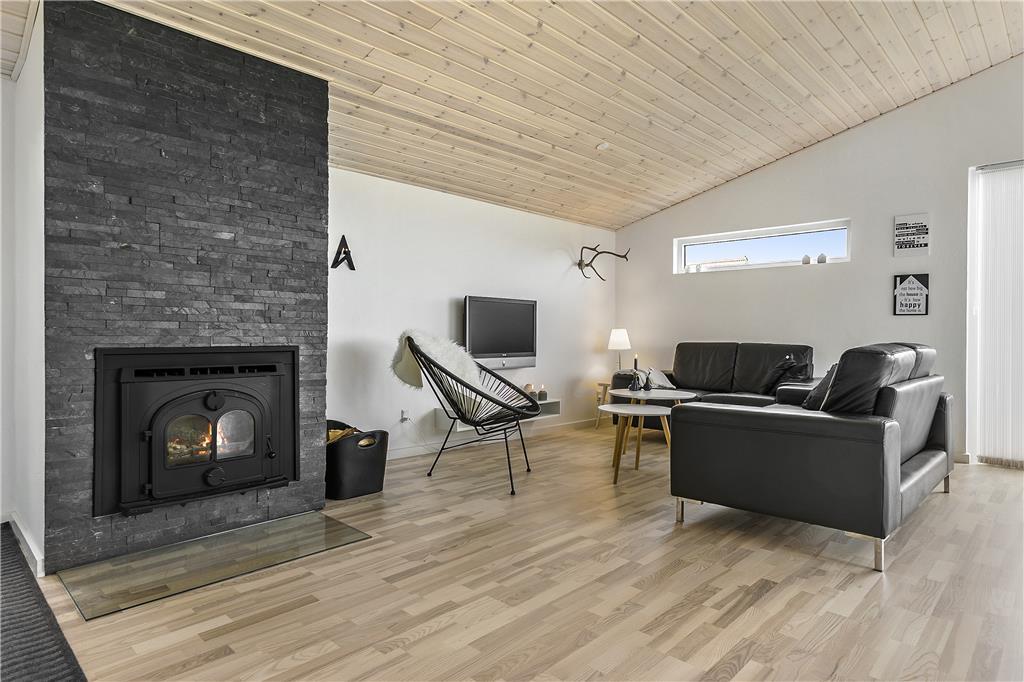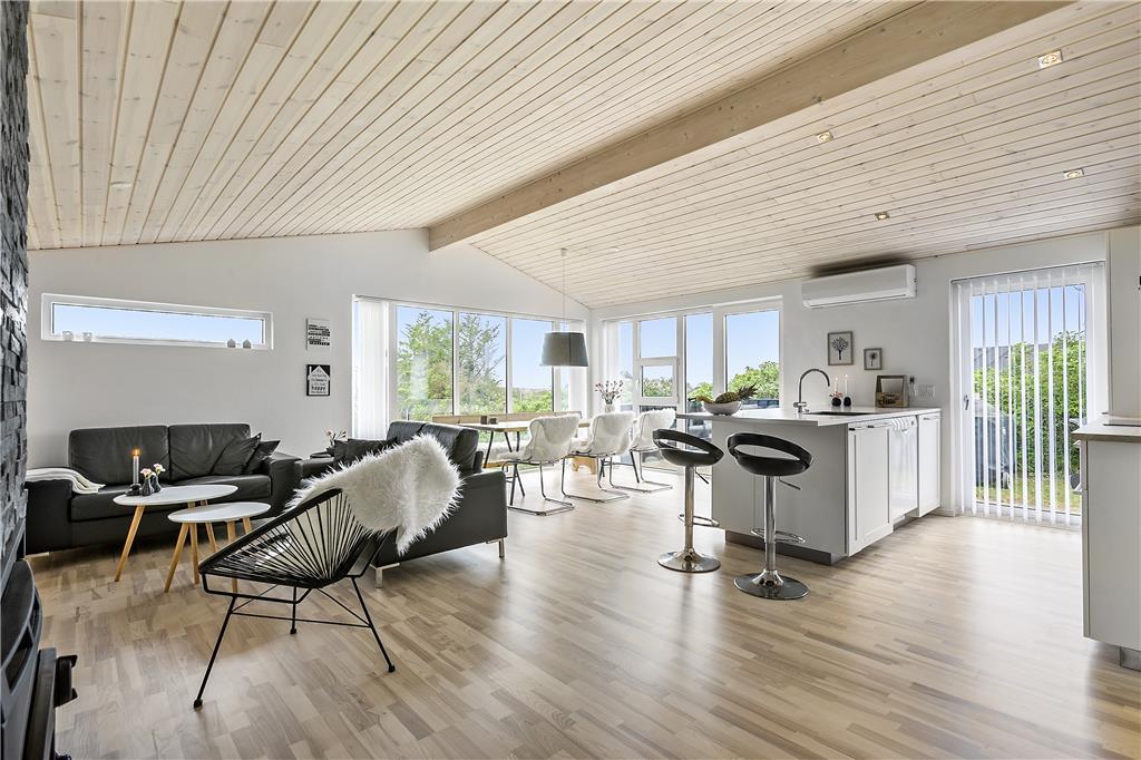 Sobald du in dieses charmante Ferienhaus trittst, wirst du von einem offenen und einladenden Wohnbereich mit hohen Decken empfangen, der eine geräumige und helle Atmosphäre schafft. Der Kaminofen in der Ecke lädt zu gemütlichen Abenden mit Wärme und Licht ein, während die großen Fenster einen schönen Blick auf das hügelige Naturgrundstück rund um das Haus bieten. Der Wohn-Essbereich ist der perfekte Treffpunkt für die ganze Familie, und mit Platz für sowohl Kochen als auch geselliges Beisammensein ist es ein schöner Ort, um Zeit miteinander zu verbringen. Hier kannst du auch nach einem langen Tag auf dem Sofa entspannen und dich auf das nächste Abenteuer in Blokhus vorbereiten.