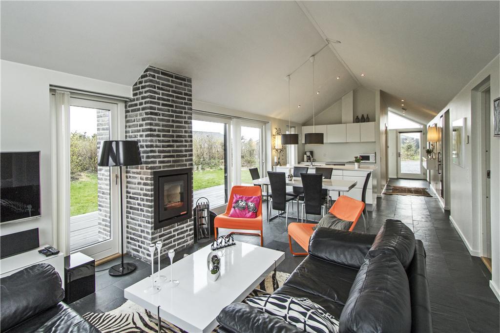 Das Ferienhaus zeichnet sich durch ein modernes und funktionelles Design aus, das eine helle und einladende Atmosphäre schafft. Große Fenster sorgen für hervorragendes Tageslicht, und vom Wohnzimmer aus hast du direkten Zugang zu mehreren Terrassen, auf denen du die schöne Umgebung genießen kannst. Der Kaminofen spendet Wärme und Gemütlichkeit an kühleren Tagen, während die offenen Räume zum Beisammensein und Entspannen einladen. Das luxuriöse Badezimmer mit Whirlpool bietet ein zusätzliches Erlebnis der Entspannung, und hier kannst du dich wirklich vom Alltag erholen. Die vier Schlafzimmer sind komfortabel eingerichtet, und überall wurden Details bedacht, die eine heimelige und entspannte Atmosphäre schaffen.