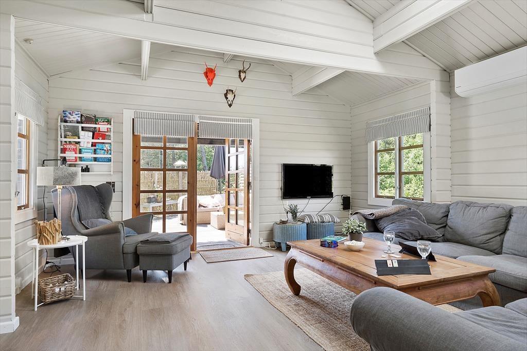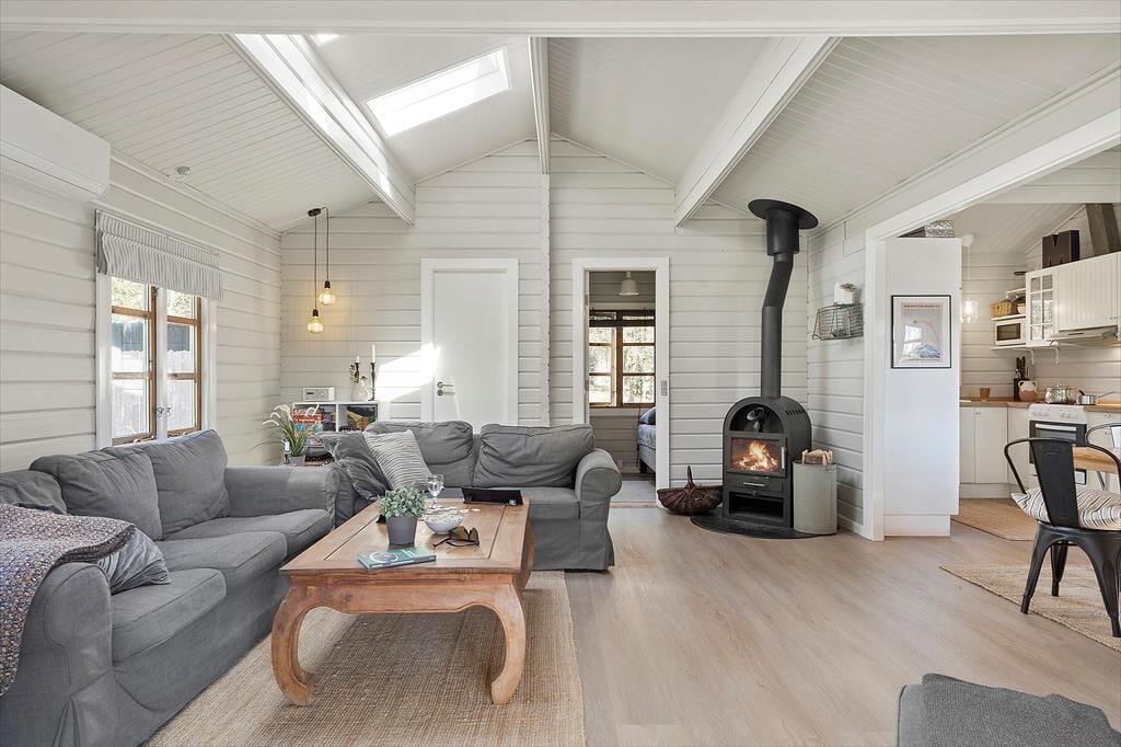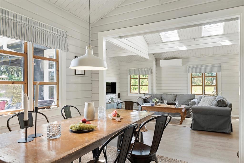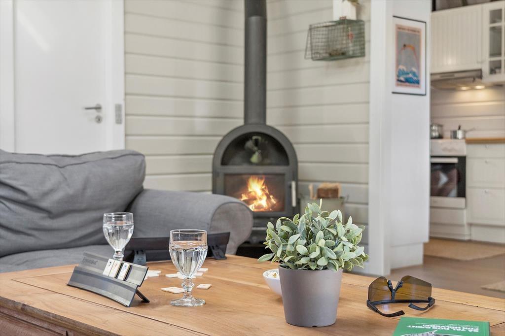 Wenn du das Ferienhaus betrittst, wirst du von einer hellen und einladenden Atmosphäre begrüßt. Das offene Wohnzimmer mit Kaminofen schafft eine gemütliche und warme Stimmung, und hier kannst du dich mit deinen Liebsten nach einem langen Tag entspannen. Die großen Fenster sorgen für ein fantastisches Licht, das dem gesamten Haus eine luftige und offene Atmosphäre verleiht. Hier hast du sowohl Platz zum Entspannen als auch zum geselligen Beisammensein – sei es beim Lesen eines guten Buches vor dem Kamin oder beim Spielen eines Brettspiels am Esstisch. Die schöne Einrichtung unterstützt einen ungestörten und entspannenden Urlaub.