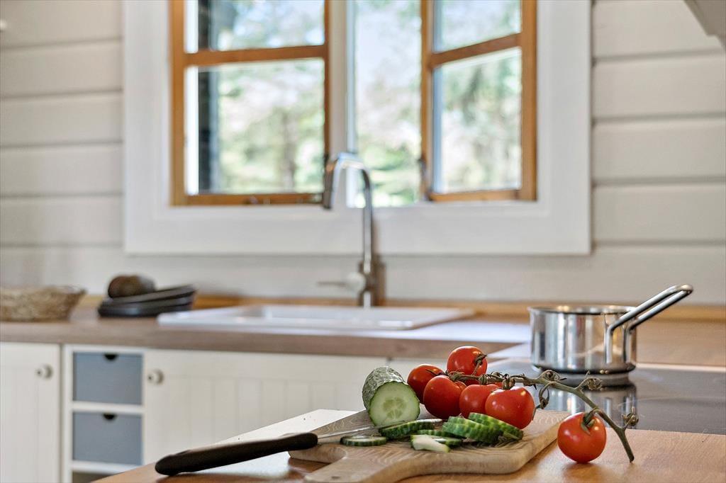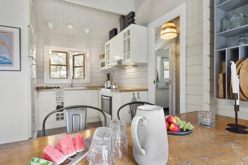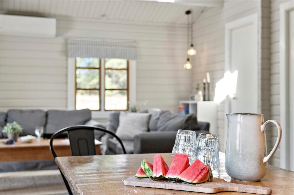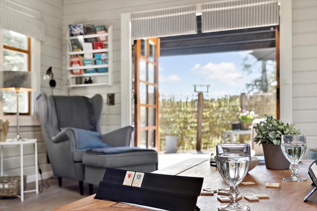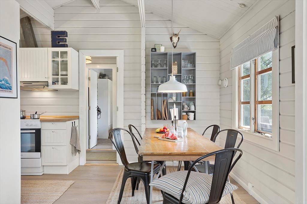 Wenn du das Ferienhaus betrittst, wirst du von einer hellen und einladenden Atmosphäre begrüßt. Das offene Wohnzimmer mit Kaminofen schafft eine gemütliche und warme Stimmung, und hier kannst du dich mit deinen Liebsten nach einem langen Tag entspannen. Die großen Fenster sorgen für ein fantastisches Licht, das dem gesamten Haus eine luftige und offene Atmosphäre verleiht. Hier hast du sowohl Platz zum Entspannen als auch zum geselligen Beisammensein – sei es beim Lesen eines guten Buches vor dem Kamin oder beim Spielen eines Brettspiels am Esstisch. Die schöne Einrichtung unterstützt einen ungestörten und entspannenden Urlaub.